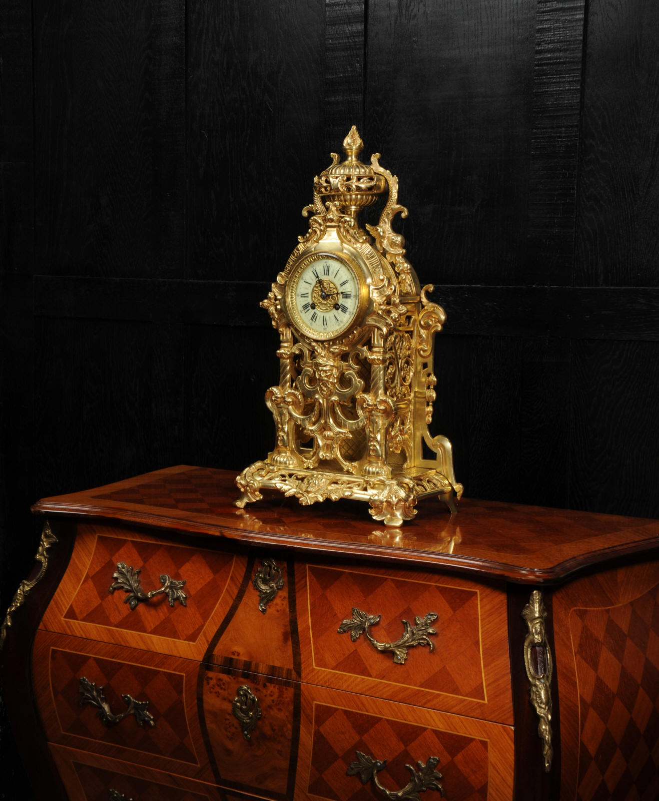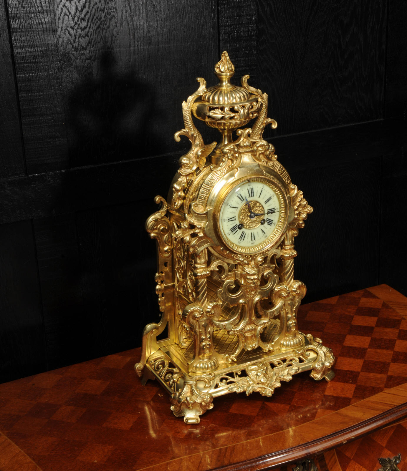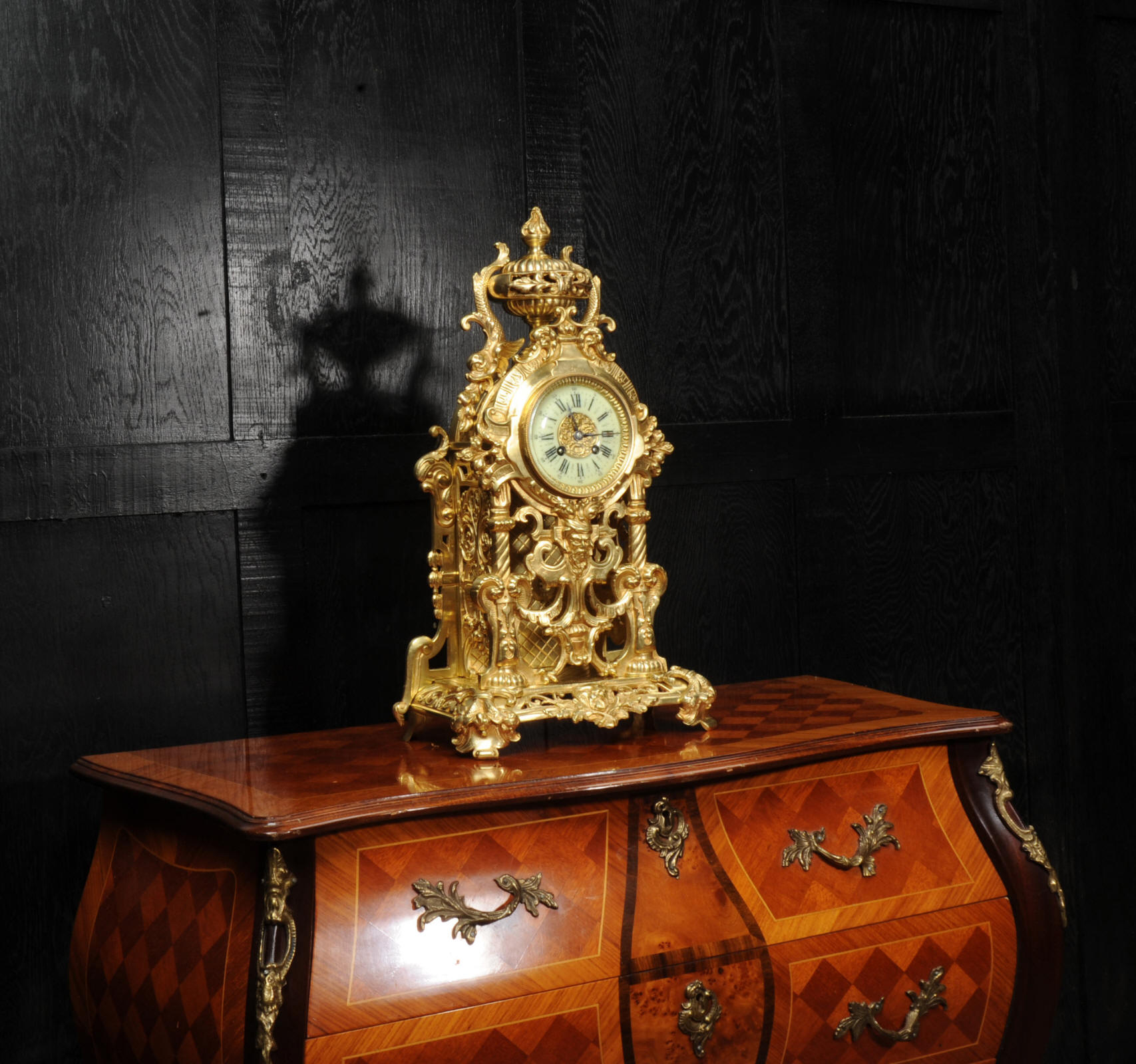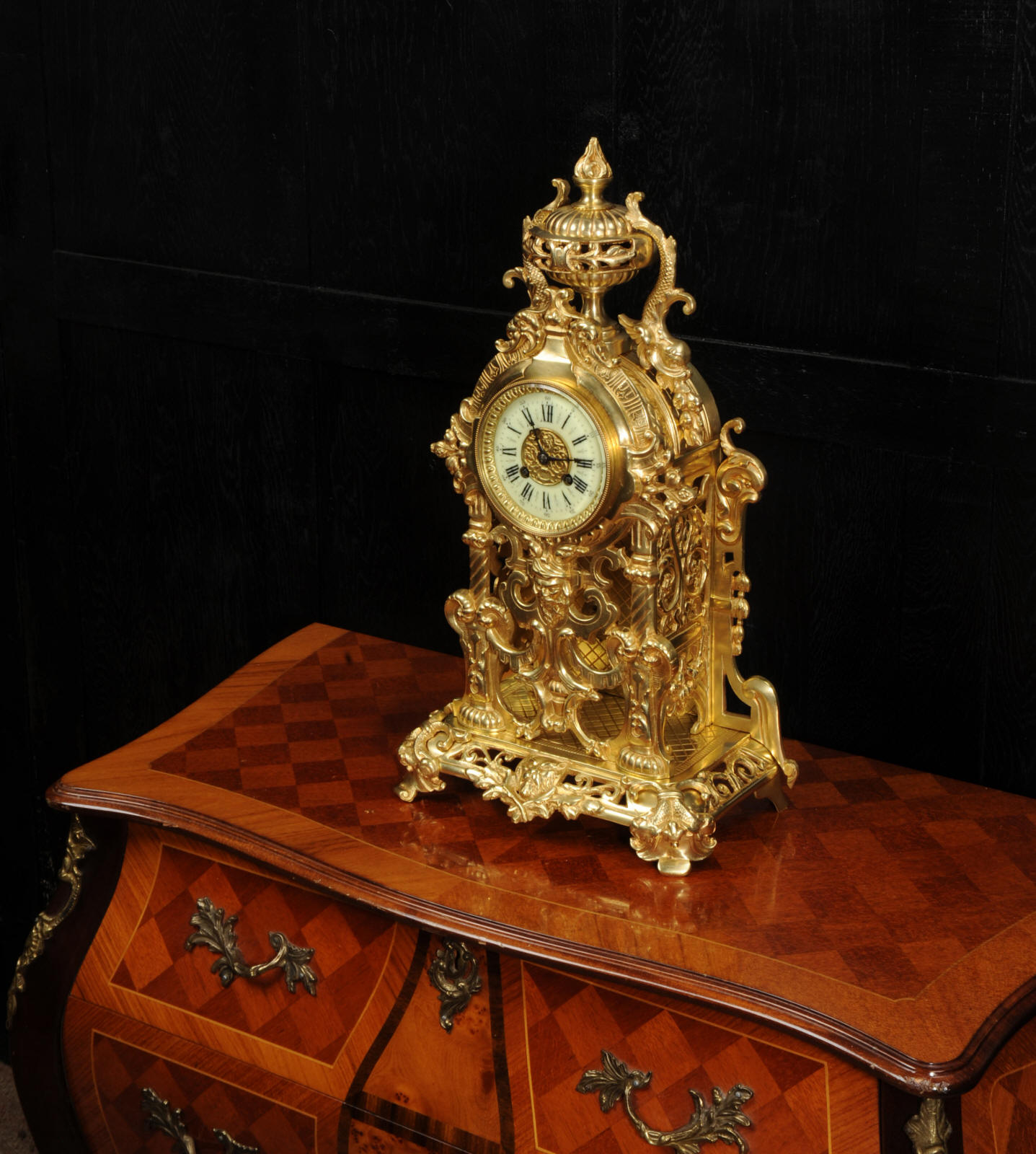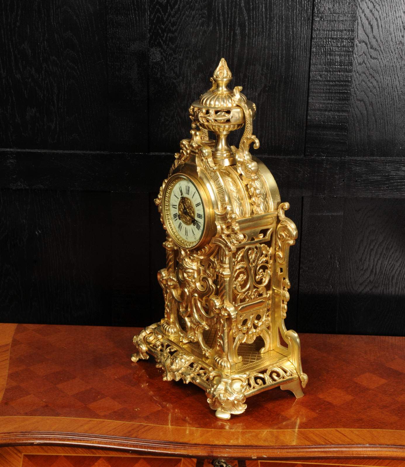 The dial is porcelain enamel on copper and is complete with its original fine blued steel hands. The French movement is of high quality and is by Louis Japy. It is in excellent clean and running condition having been fully overhauled by our clockmaker. Pendulum is original. It runs for 8 days and strikes the hours and halves on a bell. Click the video below to hear the bell and watch the clock running. Condition of the case is excellent, the original gilding is beautifully clean and bright with hardly any wear or discolouration. The dial is also in excellent condition just some tiny nibbles to the winding holes.