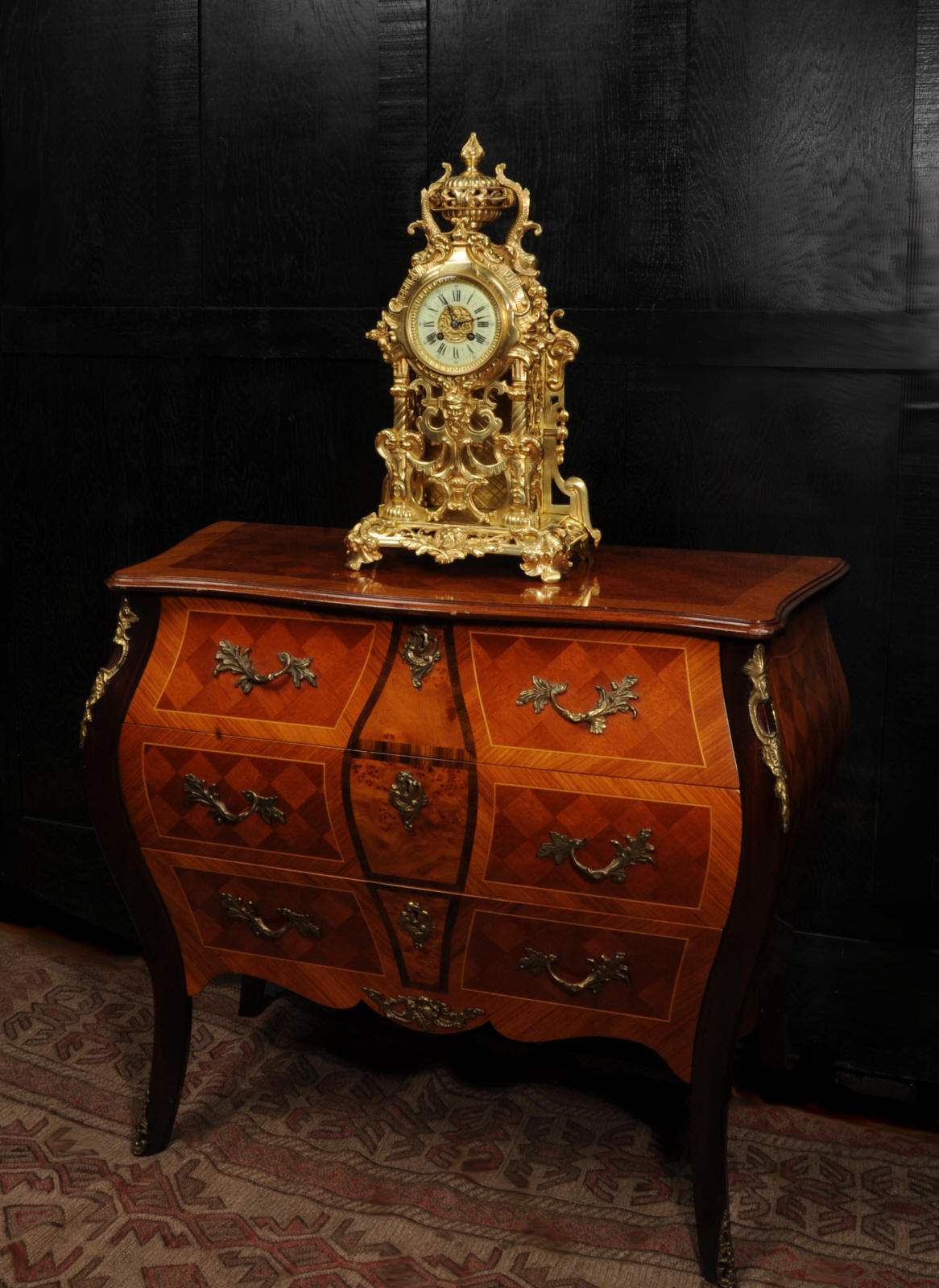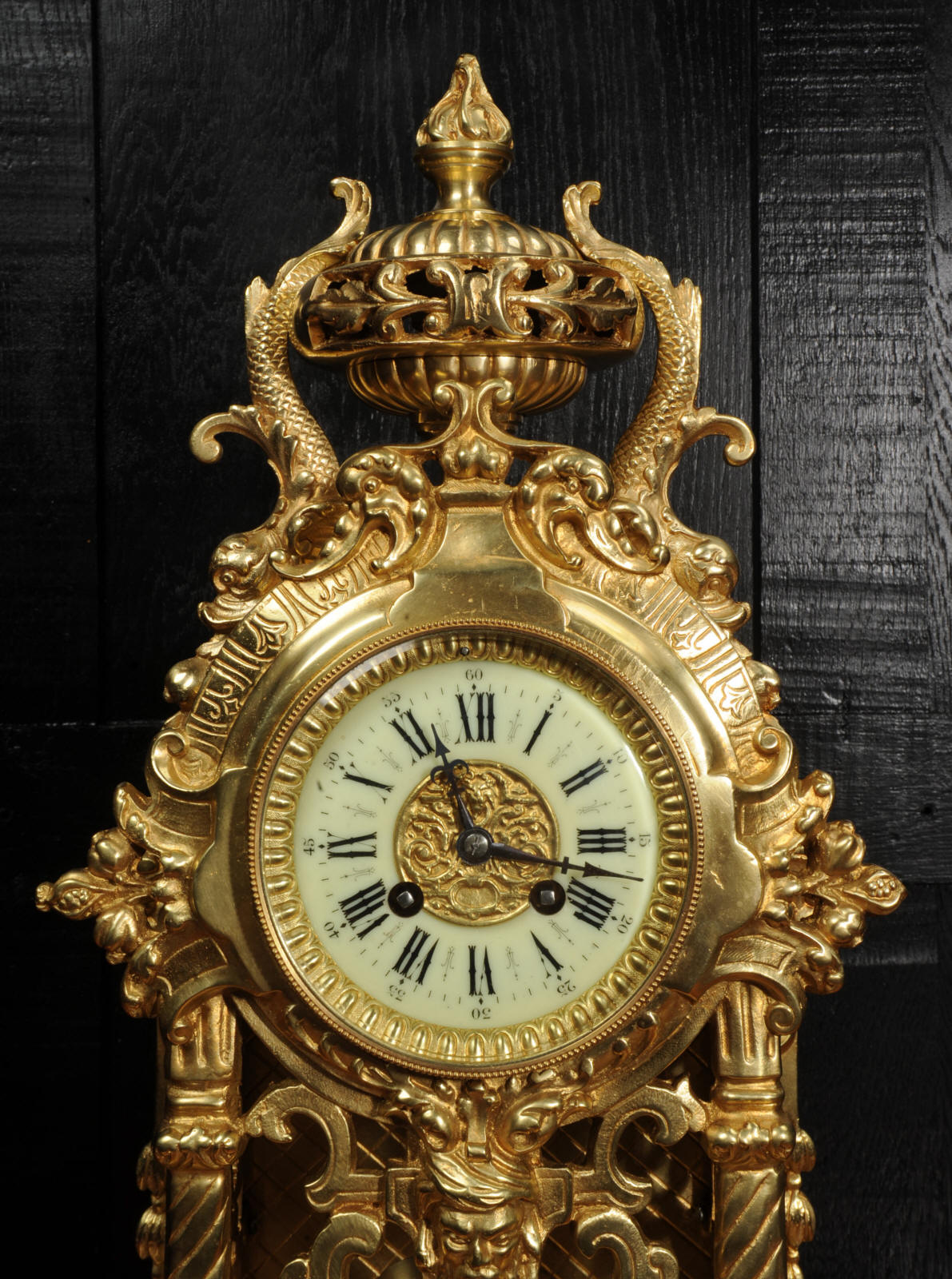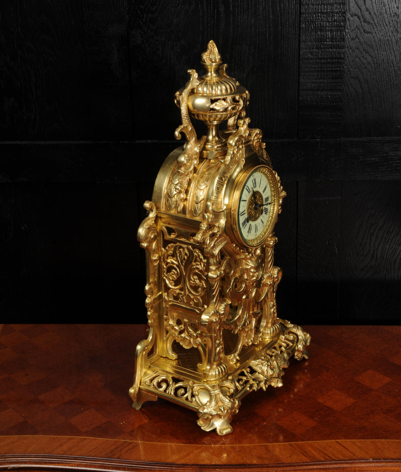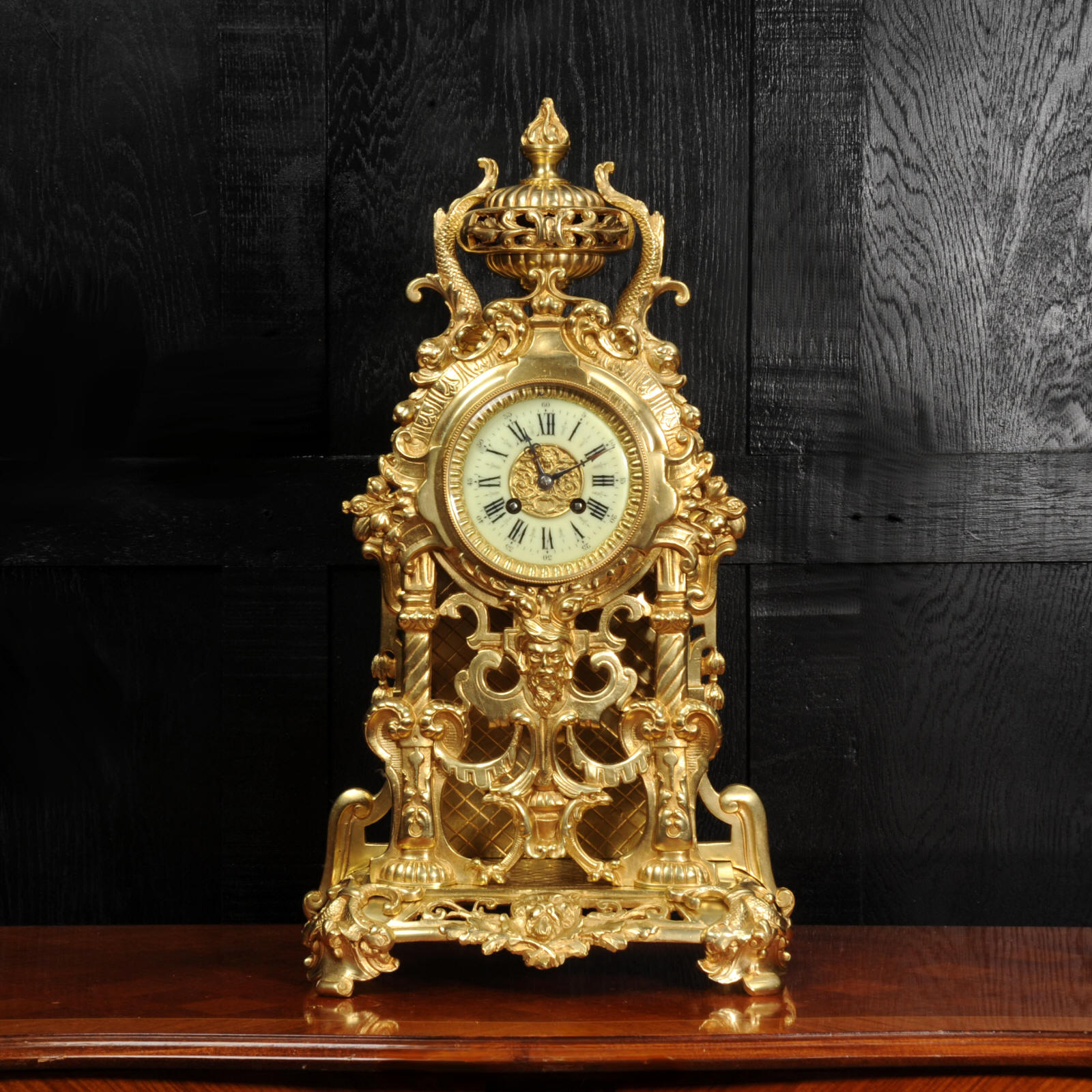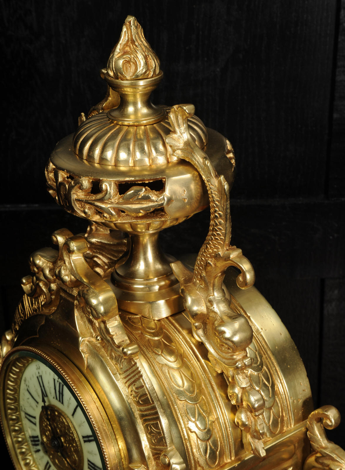 The dial is porcelain enamel on copper and is complete with its original fine blued steel hands. The French movement is of high quality and is by Louis Japy. It is in excellent clean and running condition having been fully overhauled by our clockmaker. Pendulum is original. It runs for 8 days and strikes the hours and halves on a bell. Click the video below to hear the bell and watch the clock running. Condition of the case is excellent, the original gilding is beautifully clean and bright with hardly any wear or discolouration. The dial is also in excellent condition just some tiny nibbles to the winding holes.