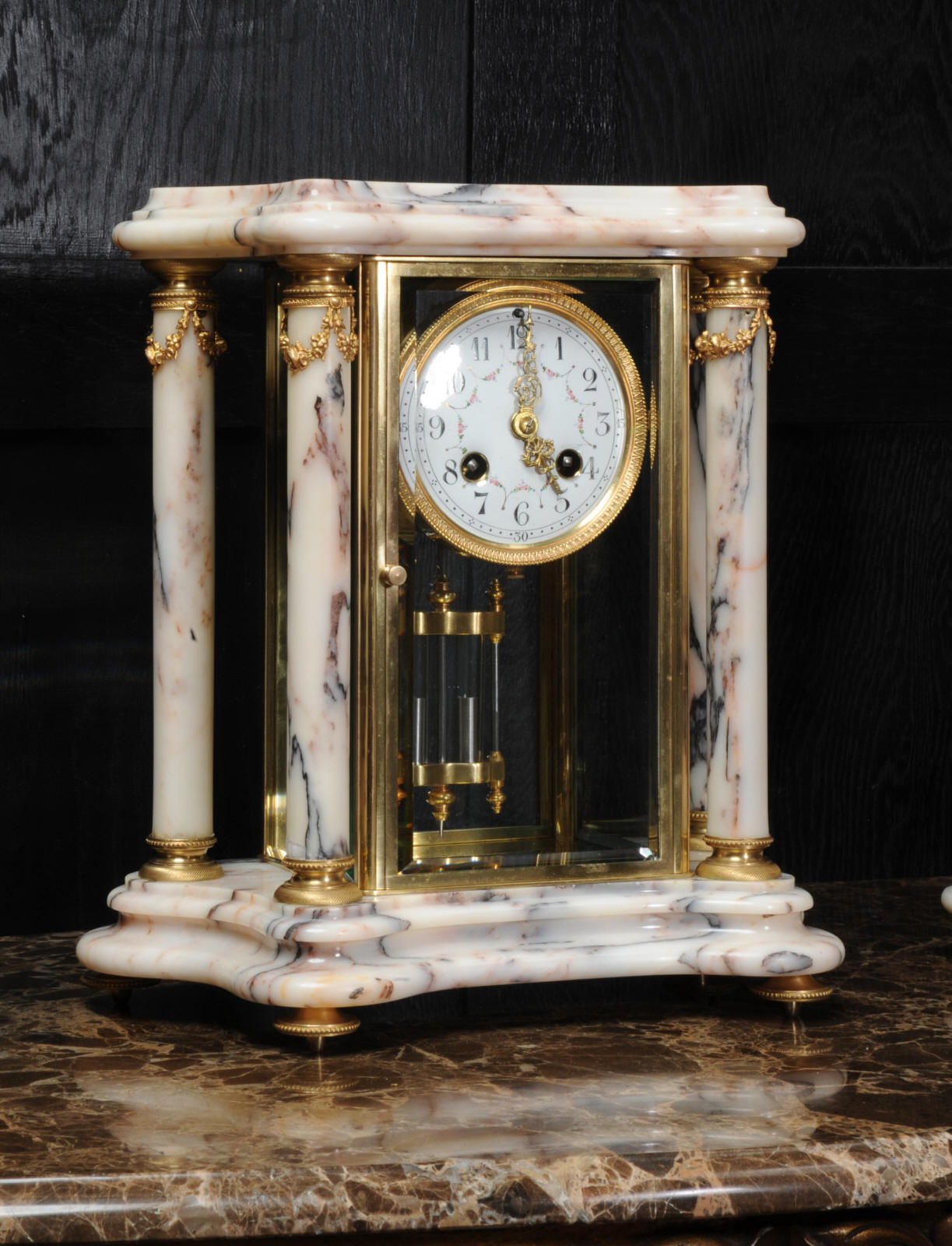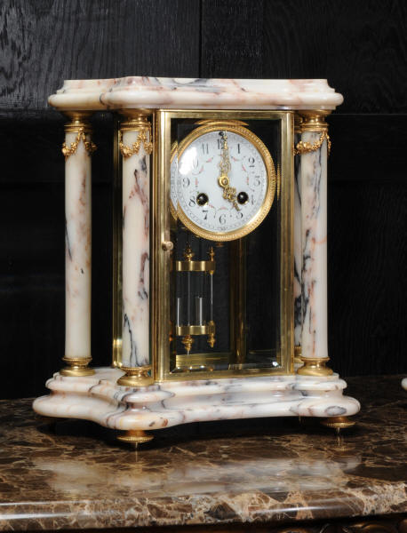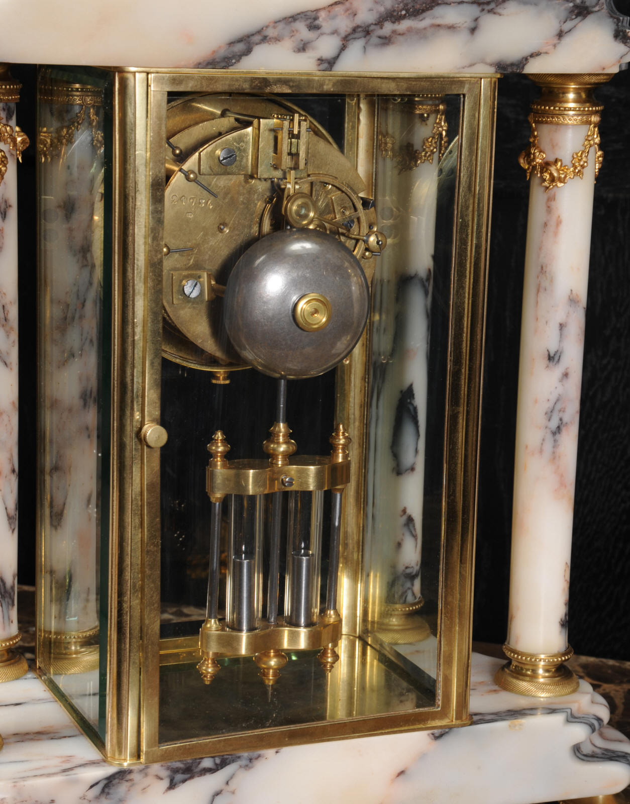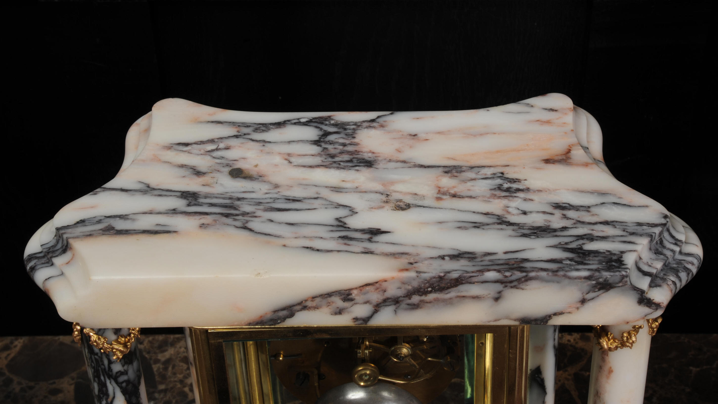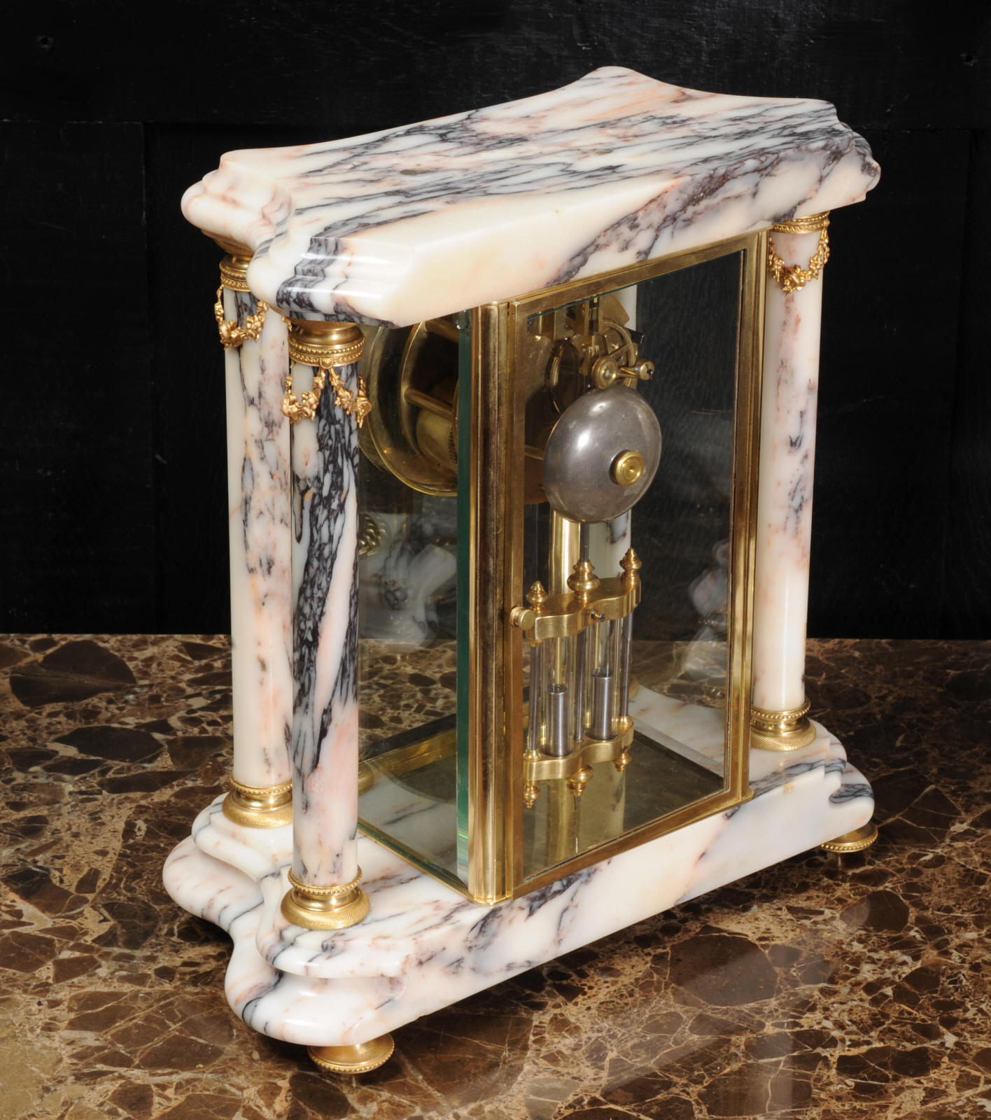 The dial is porcelain enamel on copper with finely fretted gilt hands and delicate floral swags between the numbers. The French movement is of high quality and is by Japy Freres. It is in excellent clean and running condition. Pendulum is original, we have replaced the mercury with silver steel for safety. It runs for 8 days and strikes the hours and halves on a bell. Click the video clip below to hear the bell and watch the clock running! Condition of the case is excellent, Marble has a good polish, a few minor nibbles to the edges and two filled holes in the top. The original gilding is beautifully clean and bright with hardly any wear or discolouration. The dial is also in excellent condition with no damage. The glass has a slight chip to the side panels.