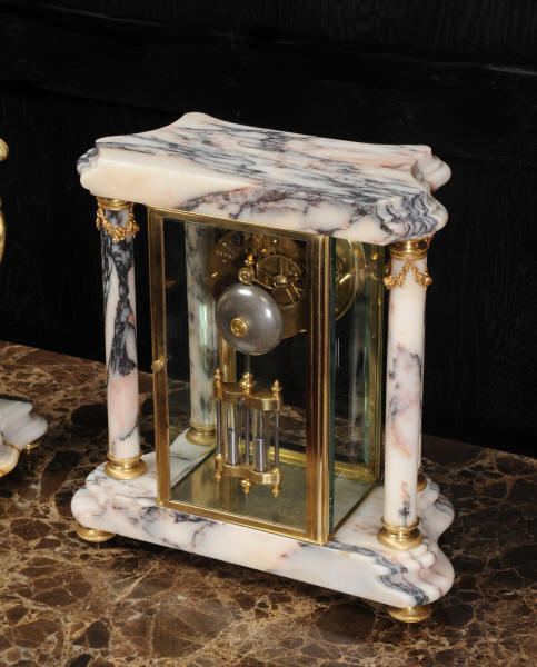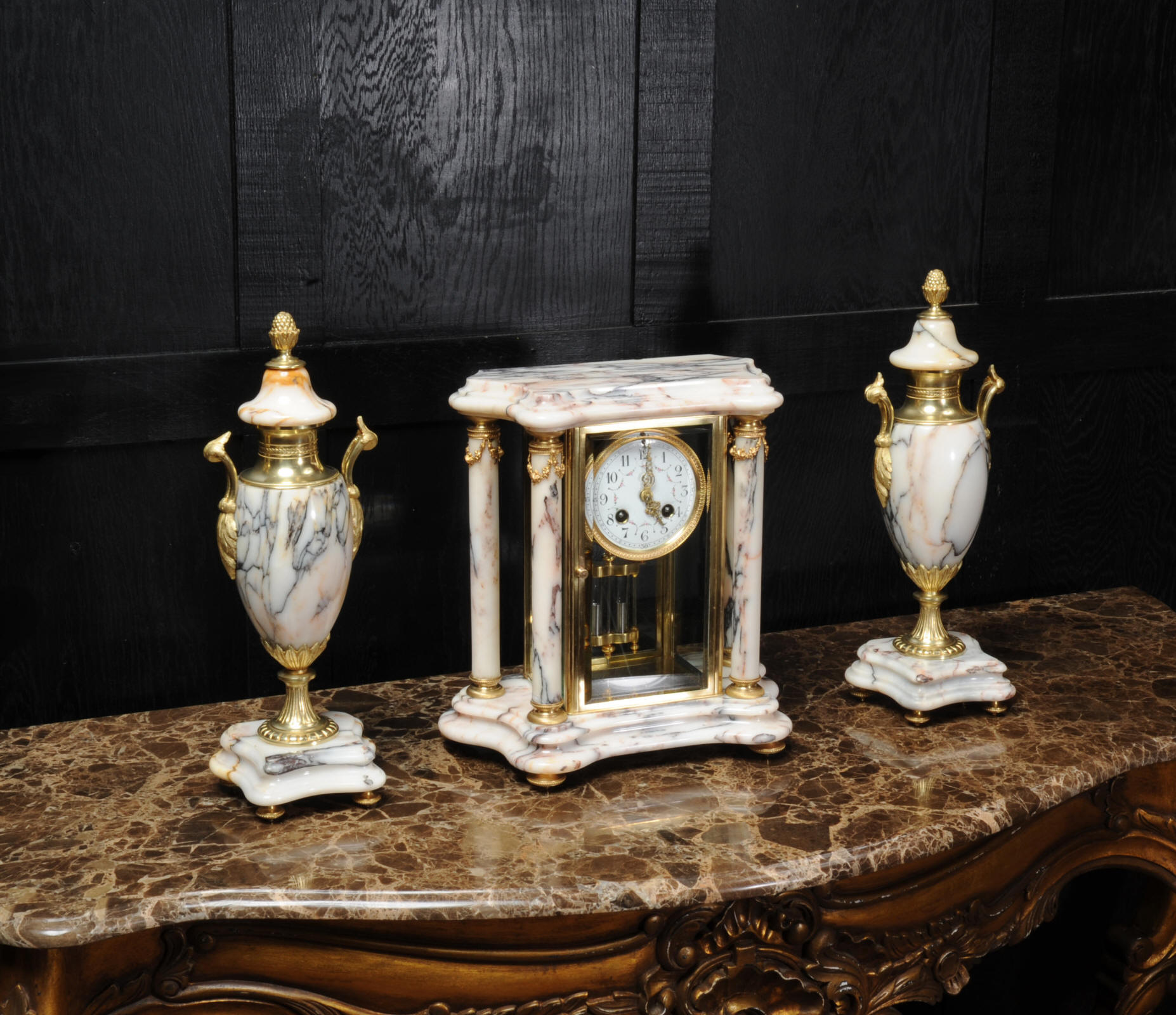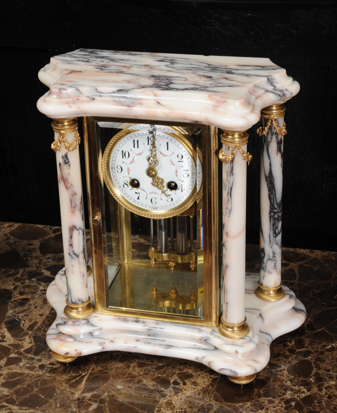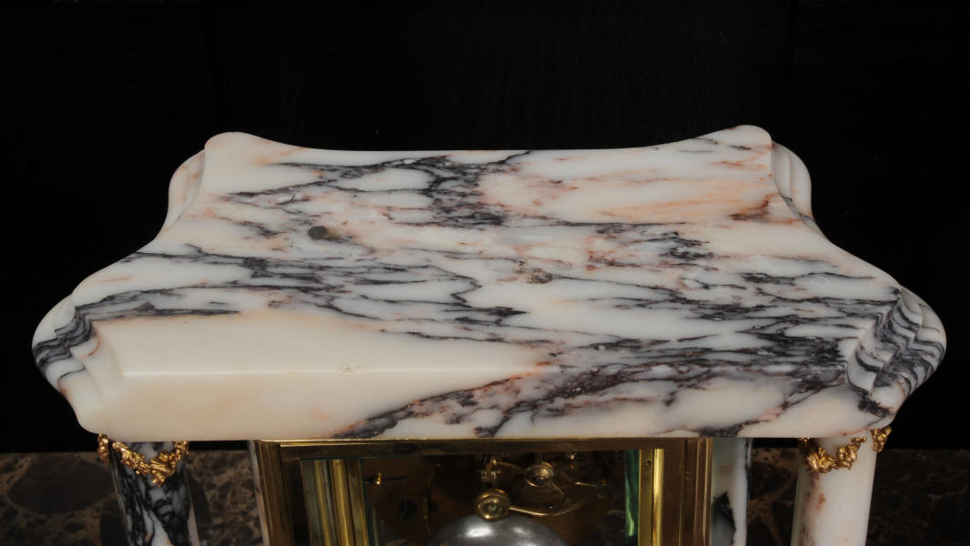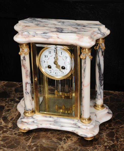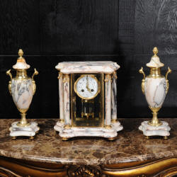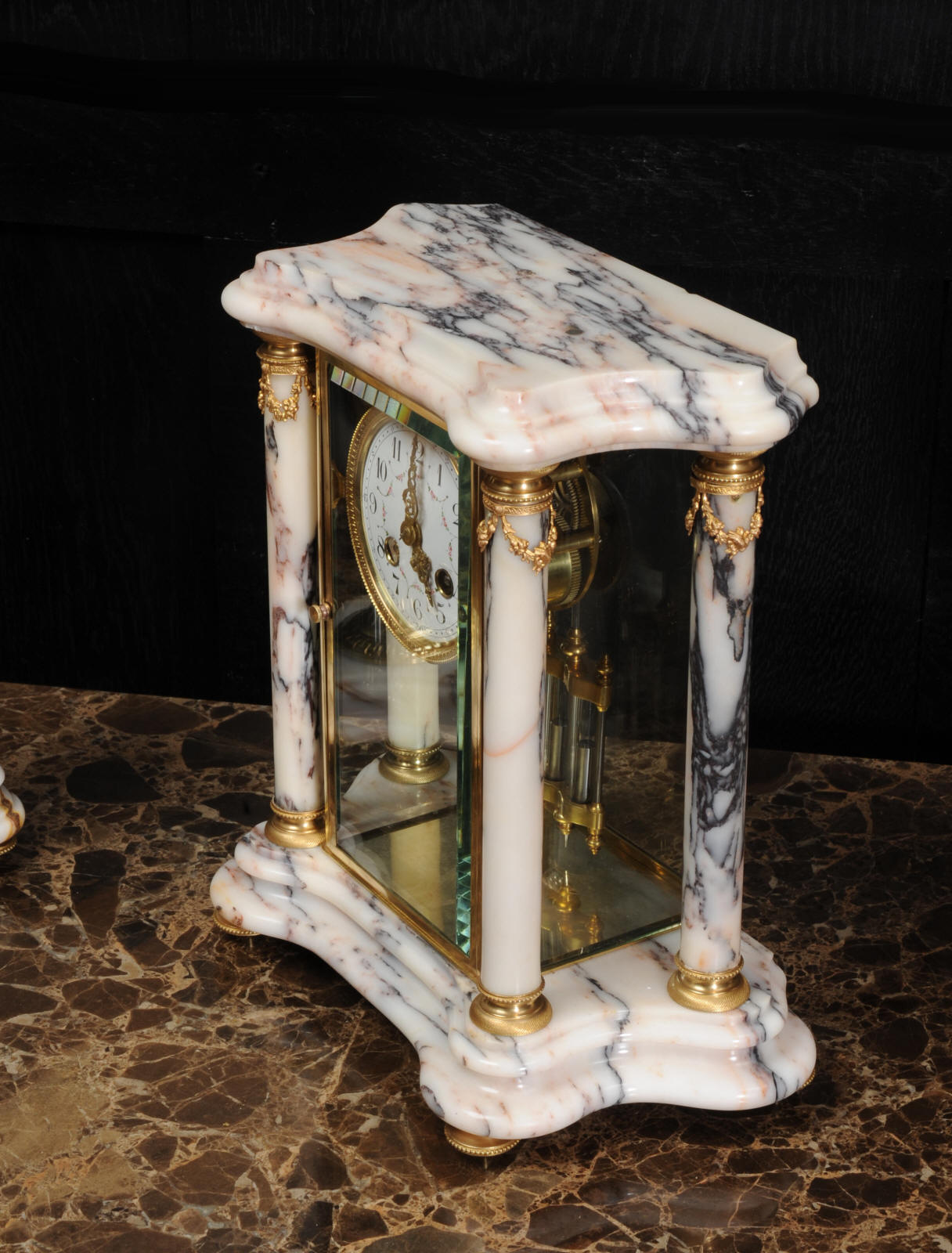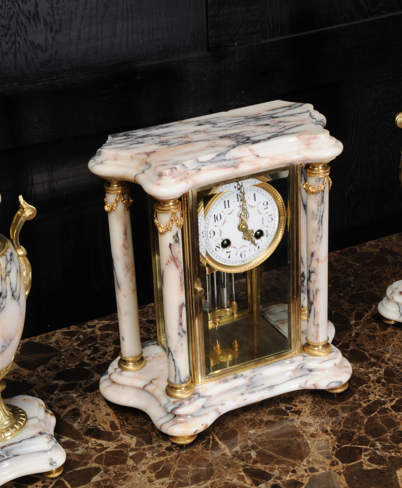 The dial is porcelain enamel on copper with finely fretted gilt hands and delicate floral swags between the numbers. The French movement is of high quality and is by Japy Freres. It is in excellent clean and running condition. Pendulum is original, we have replaced the mercury with silver steel for safety. It runs for 8 days and strikes the hours and halves on a bell. Click the video clip below to hear the bell and watch the clock running! Condition of the case is excellent, Marble has a good polish, a few minor nibbles to the edges and two filled holes in the top. The original gilding is beautifully clean and bright with hardly any wear or discolouration. The dial is also in excellent condition with no damage. The glass has a slight chip to the side panels.