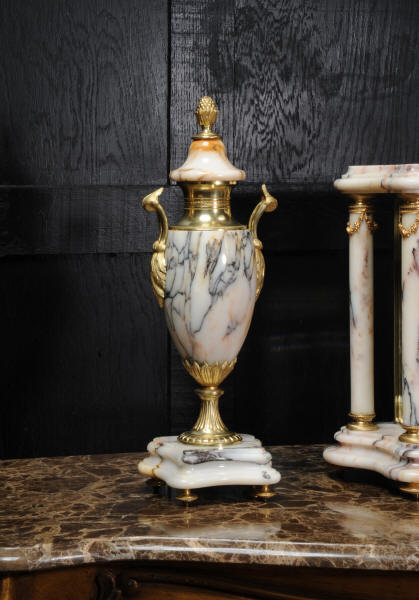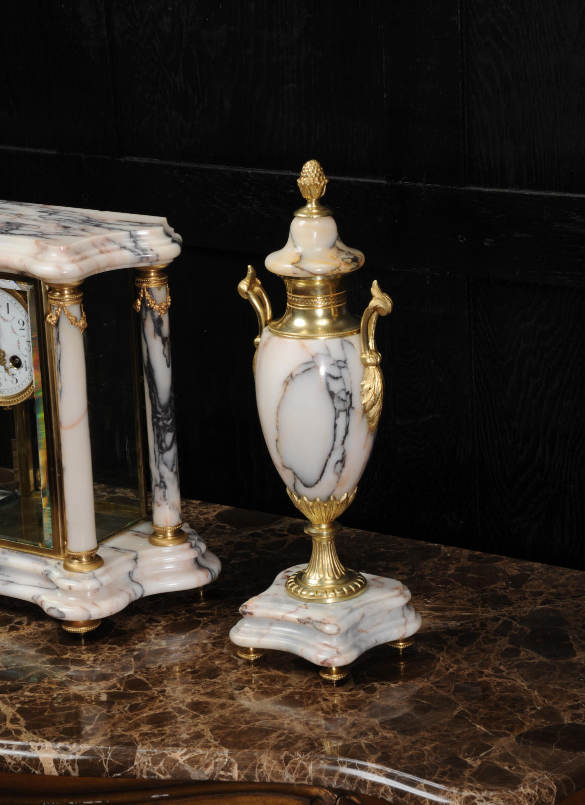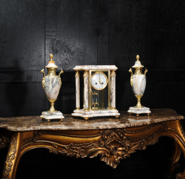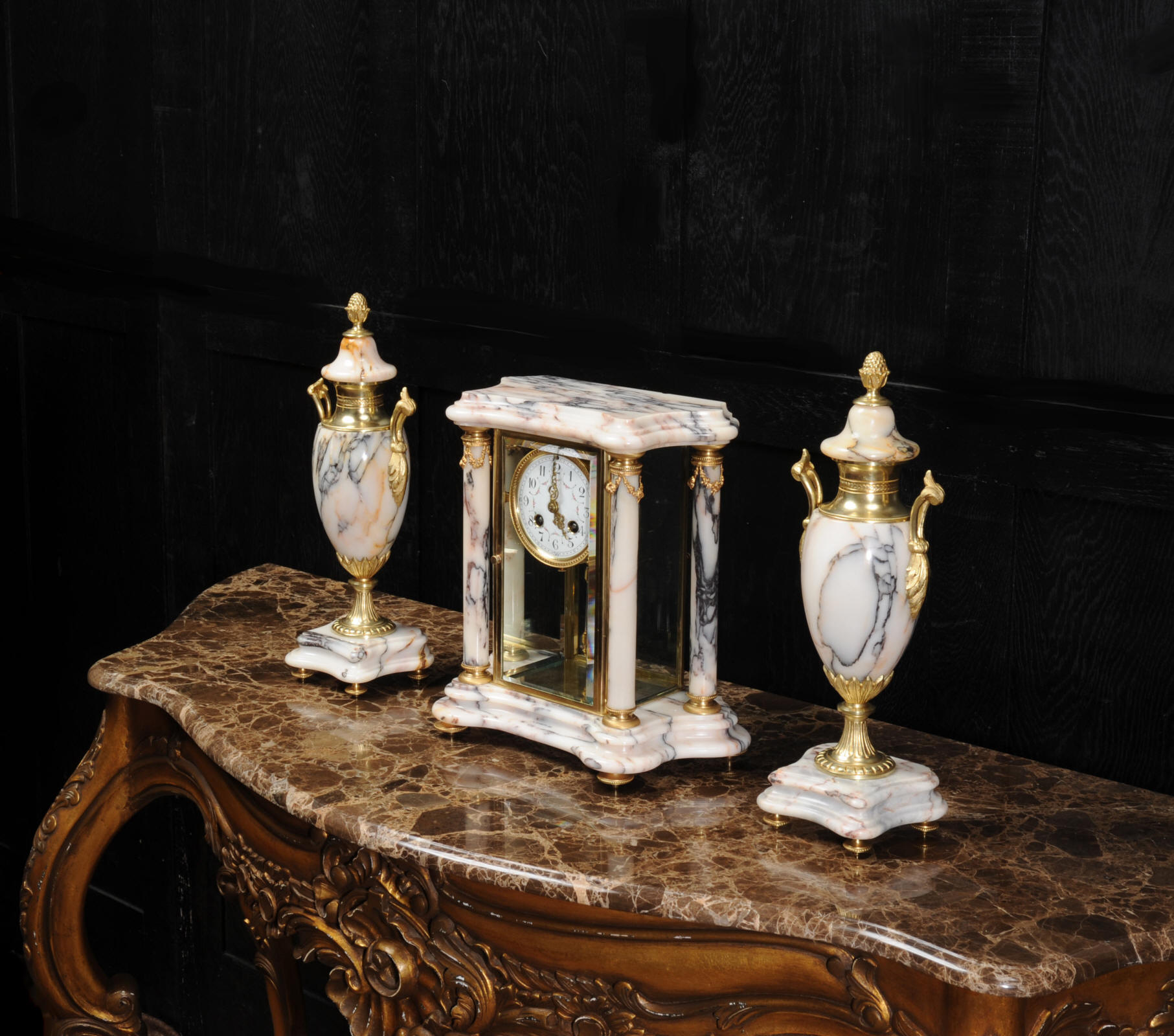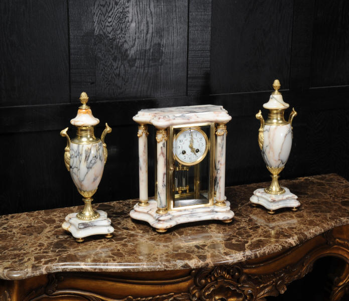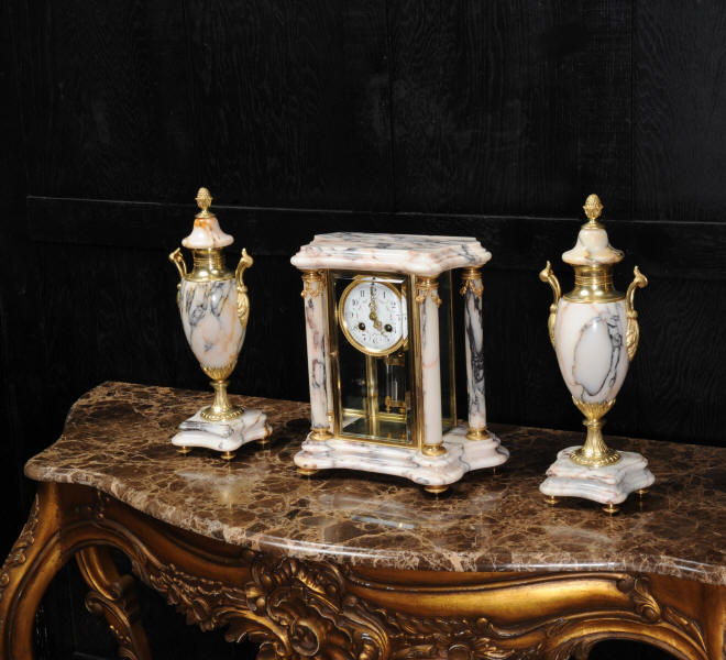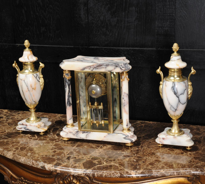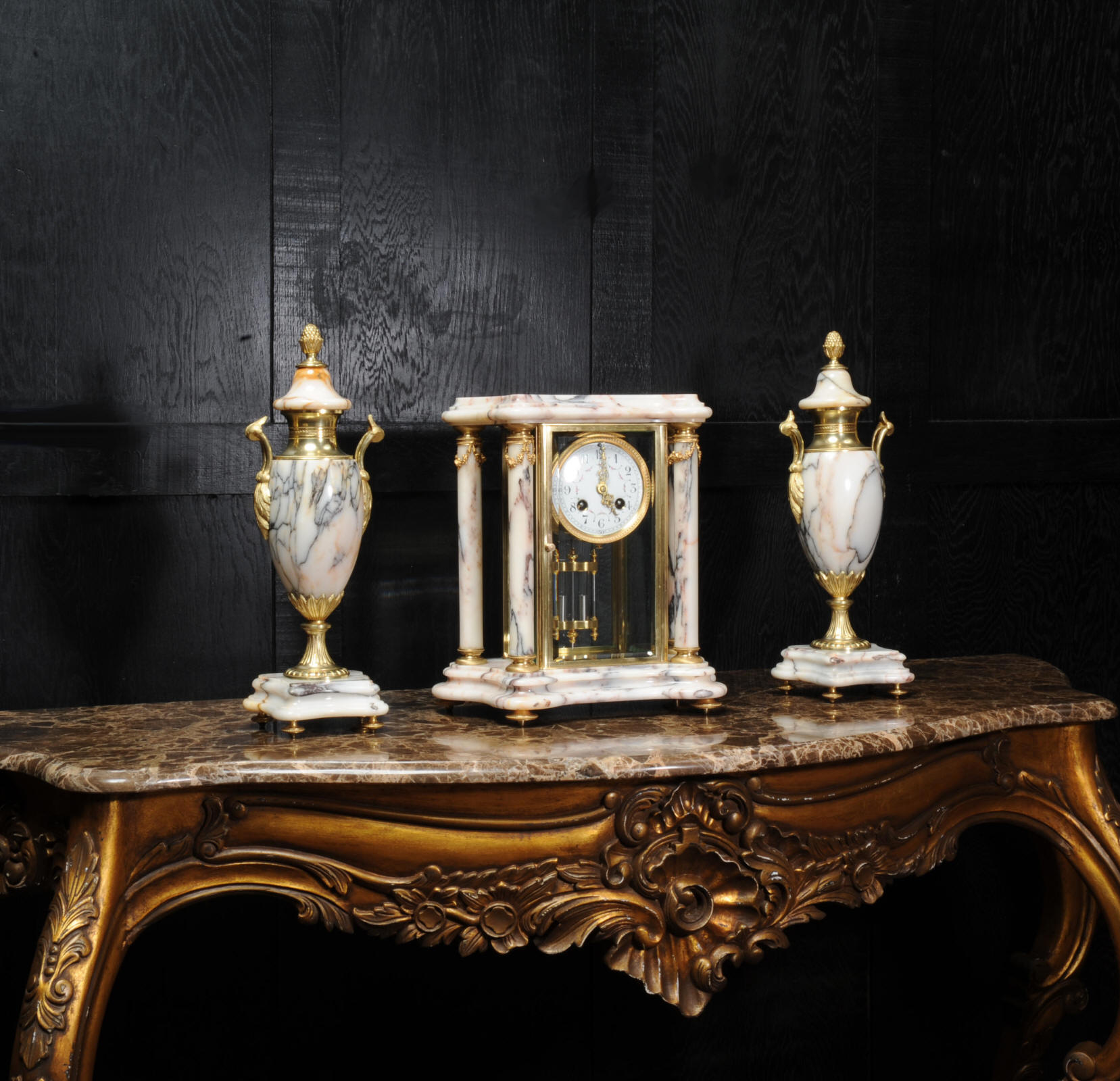 The dial is porcelain enamel on copper with finely fretted gilt hands and delicate floral swags between the numbers. The French movement is of high quality and is by Japy Freres. It is in excellent clean and running condition. Pendulum is original, we have replaced the mercury with silver steel for safety. It runs for 8 days and strikes the hours and halves on a bell. Click the video clip below to hear the bell and watch the clock running! Condition of the case is excellent, Marble has a good polish, a few minor nibbles to the edges and two filled holes in the top. The original gilding is beautifully clean and bright with hardly any wear or discolouration. The dial is also in excellent condition with no damage. The glass has a slight chip to the side panels.