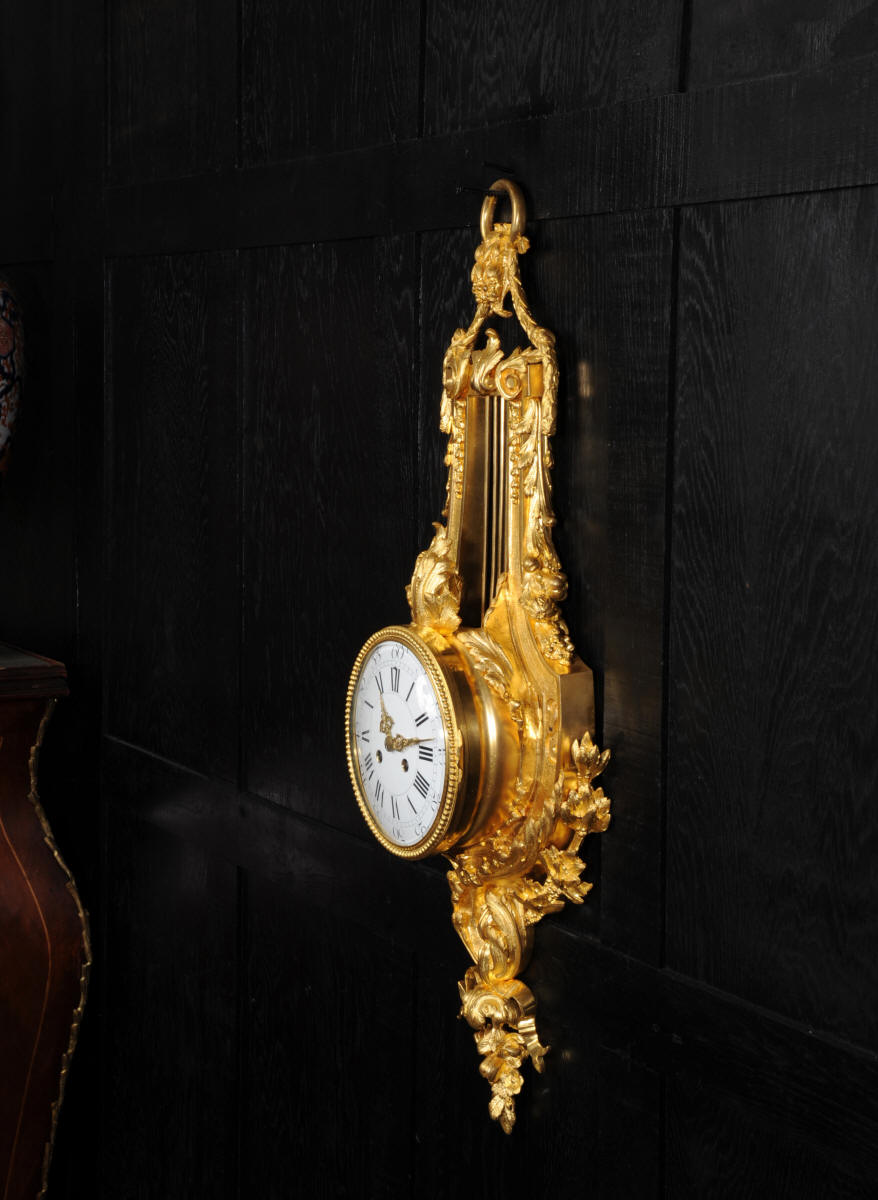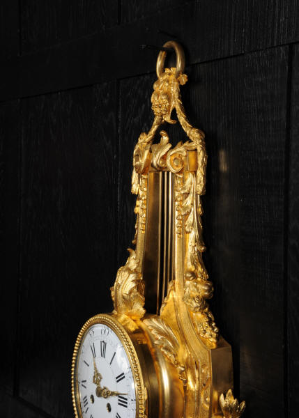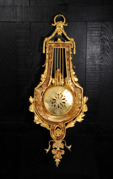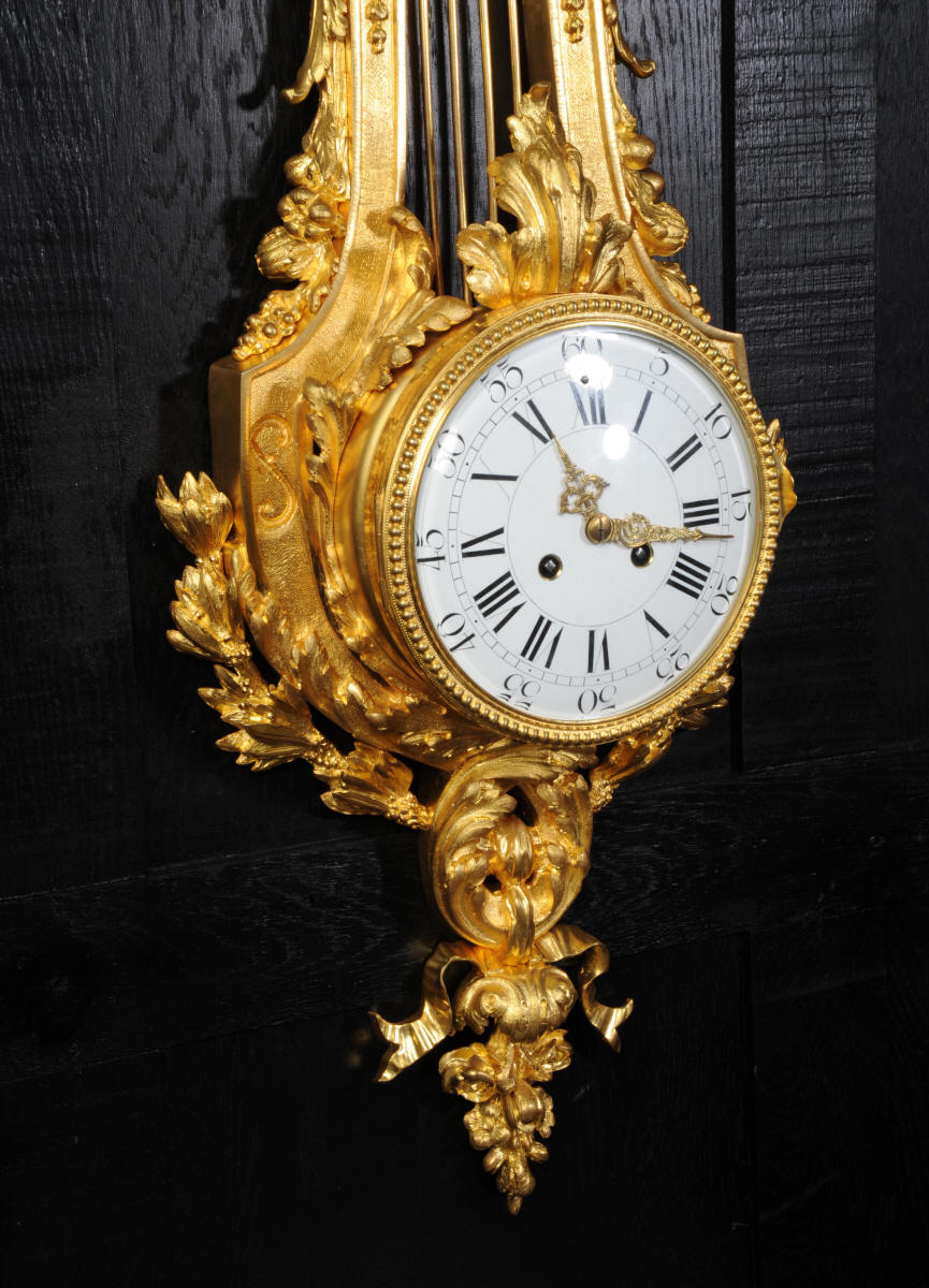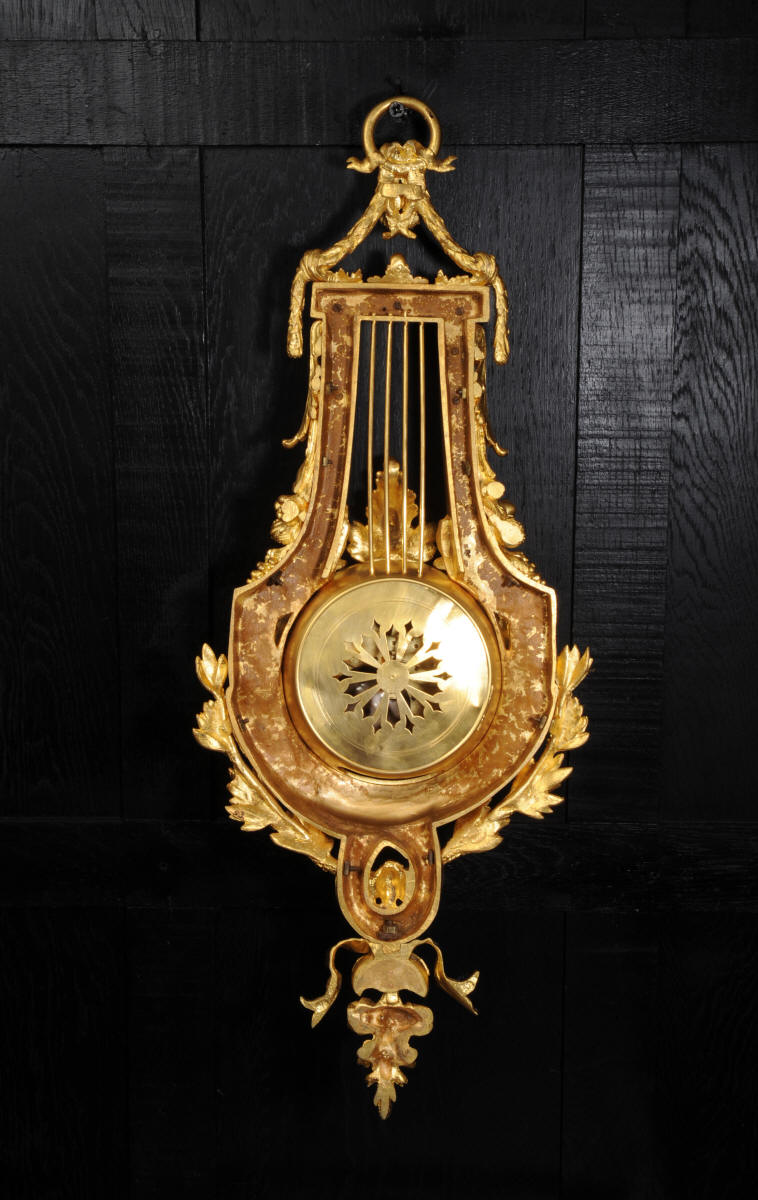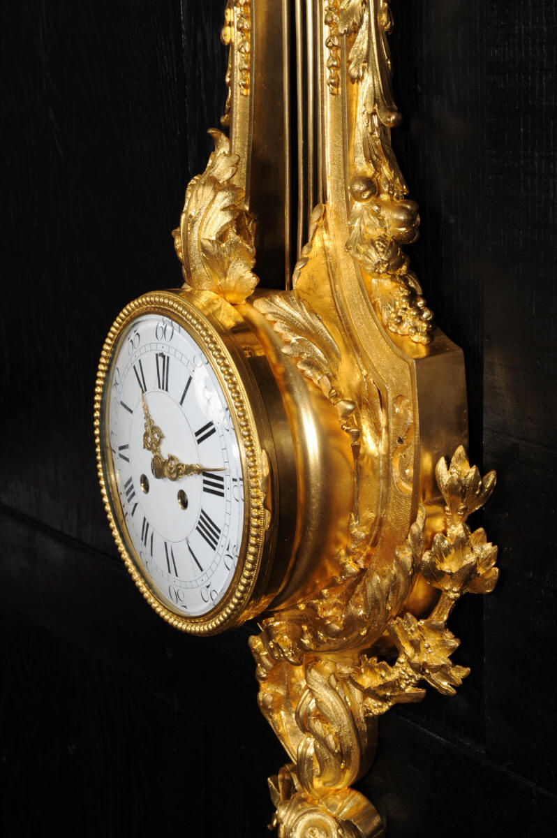 The dial is large and is porcelain enamel on copper, lettered with a separate minute ring, complete with original lyre hands and convex glass. The French movement is by Vincenti and is of high quality. It is in excellent clean and running condition having been fully overhauled and tested by our clockmaker. Pendulum is original. It runs for 8 days and strikes the hours and halves on a bell. Click the video clip below to hear the bell and watch the clock running! Condition of the case is excellent, the original gilding is beautifully clean and bright with hardly any wear or discolouration. The dial is also in excellent condition with no damage. The rear door is a little distorted but this is not visible with the clock hung on a wall. A stunning clock in lovely original condition.
