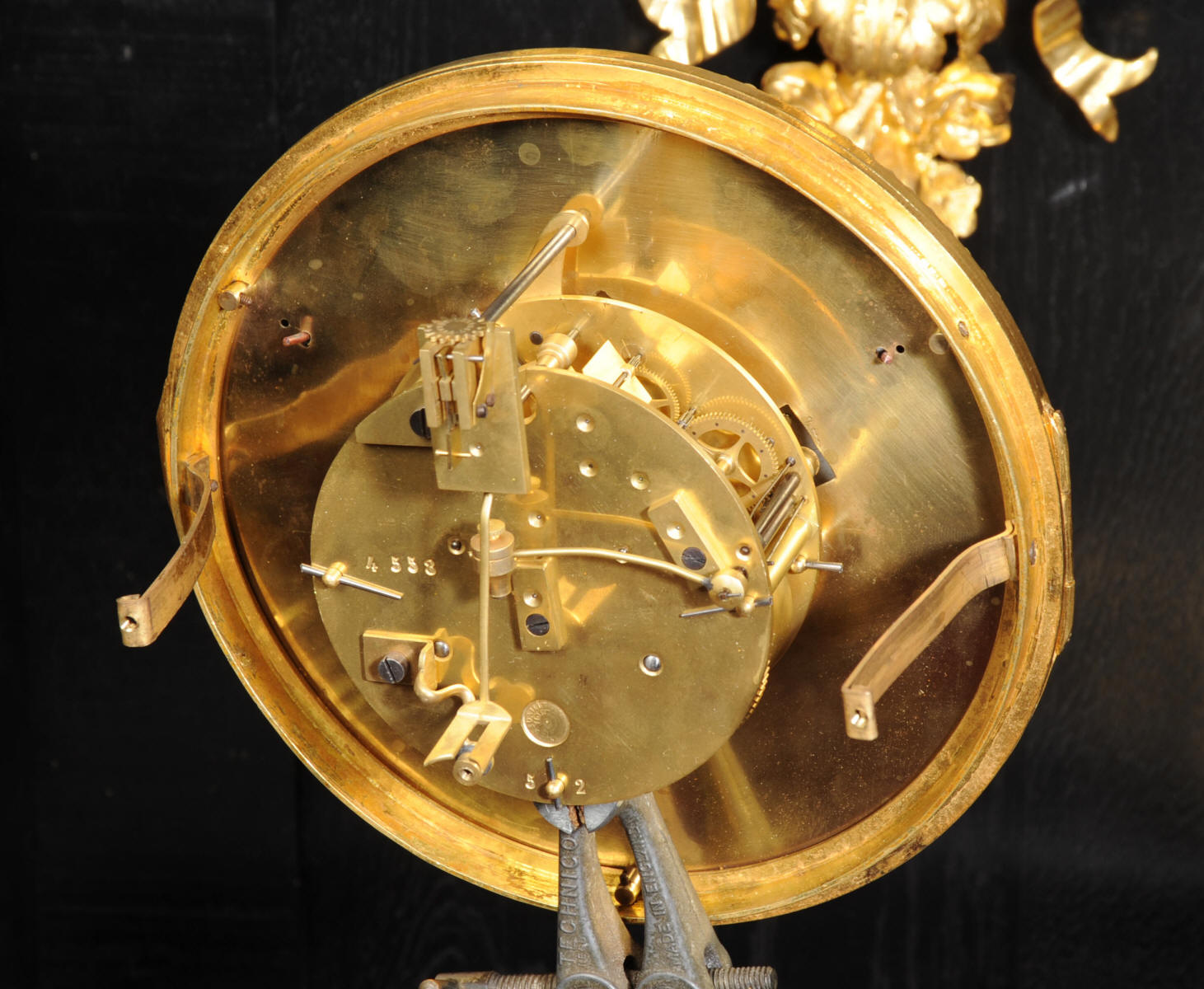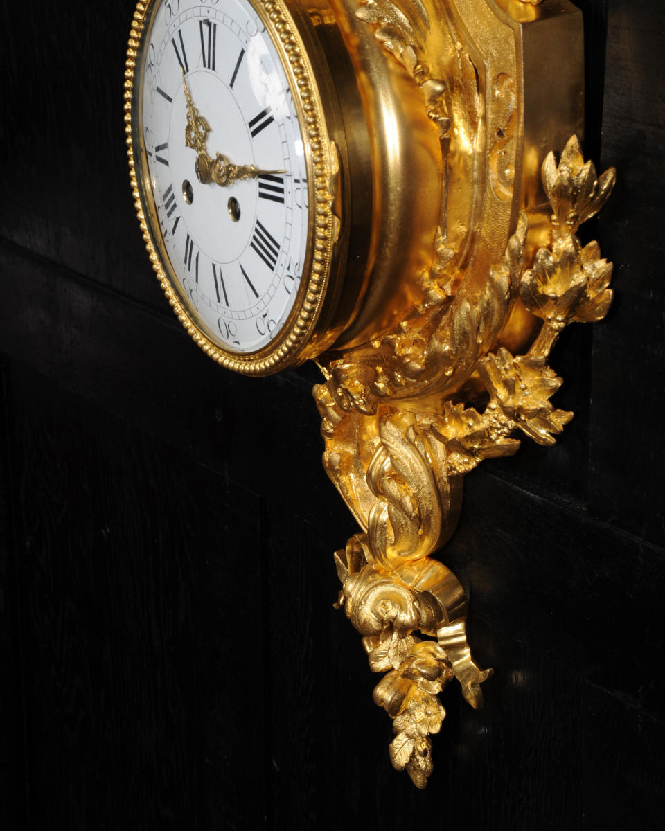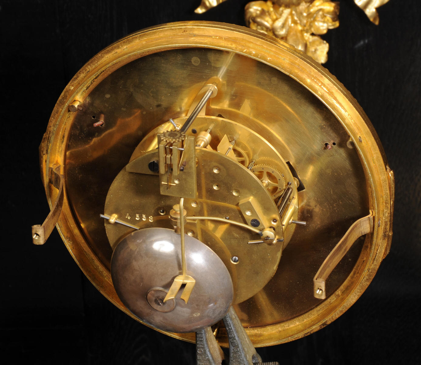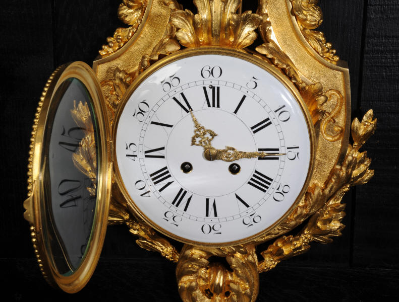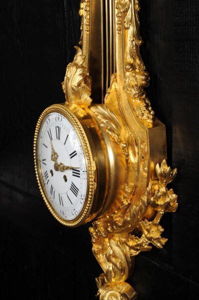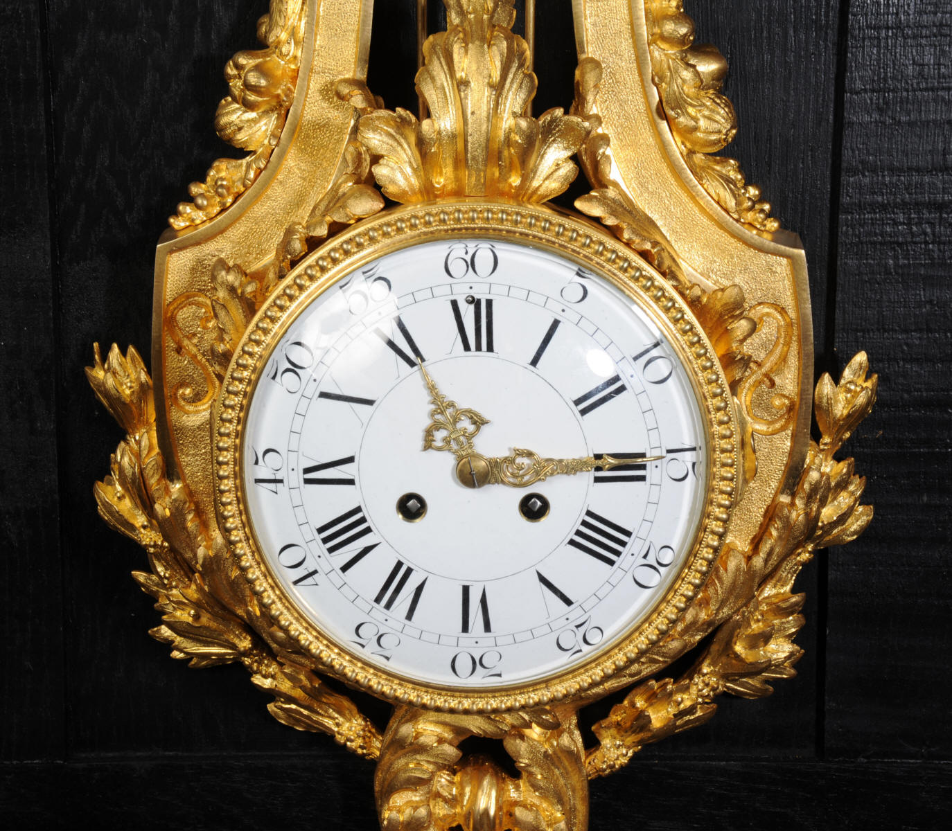 The dial is large and is porcelain enamel on copper, lettered with a separate minute ring, complete with original lyre hands and convex glass. The French movement is by Vincenti and is of high quality. It is in excellent clean and running condition having been fully overhauled and tested by our clockmaker. Pendulum is original. It runs for 8 days and strikes the hours and halves on a bell. Click the video clip below to hear the bell and watch the clock running! Condition of the case is excellent, the original gilding is beautifully clean and bright with hardly any wear or discolouration. The dial is also in excellent condition with no damage. The rear door is a little distorted but this is not visible with the clock hung on a wall. A stunning clock in lovely original condition.