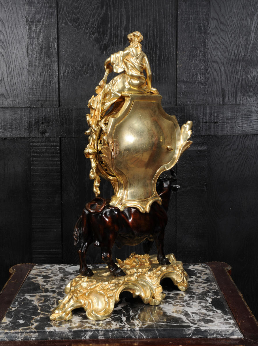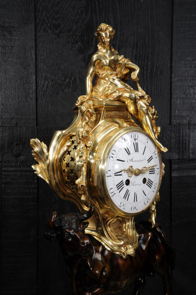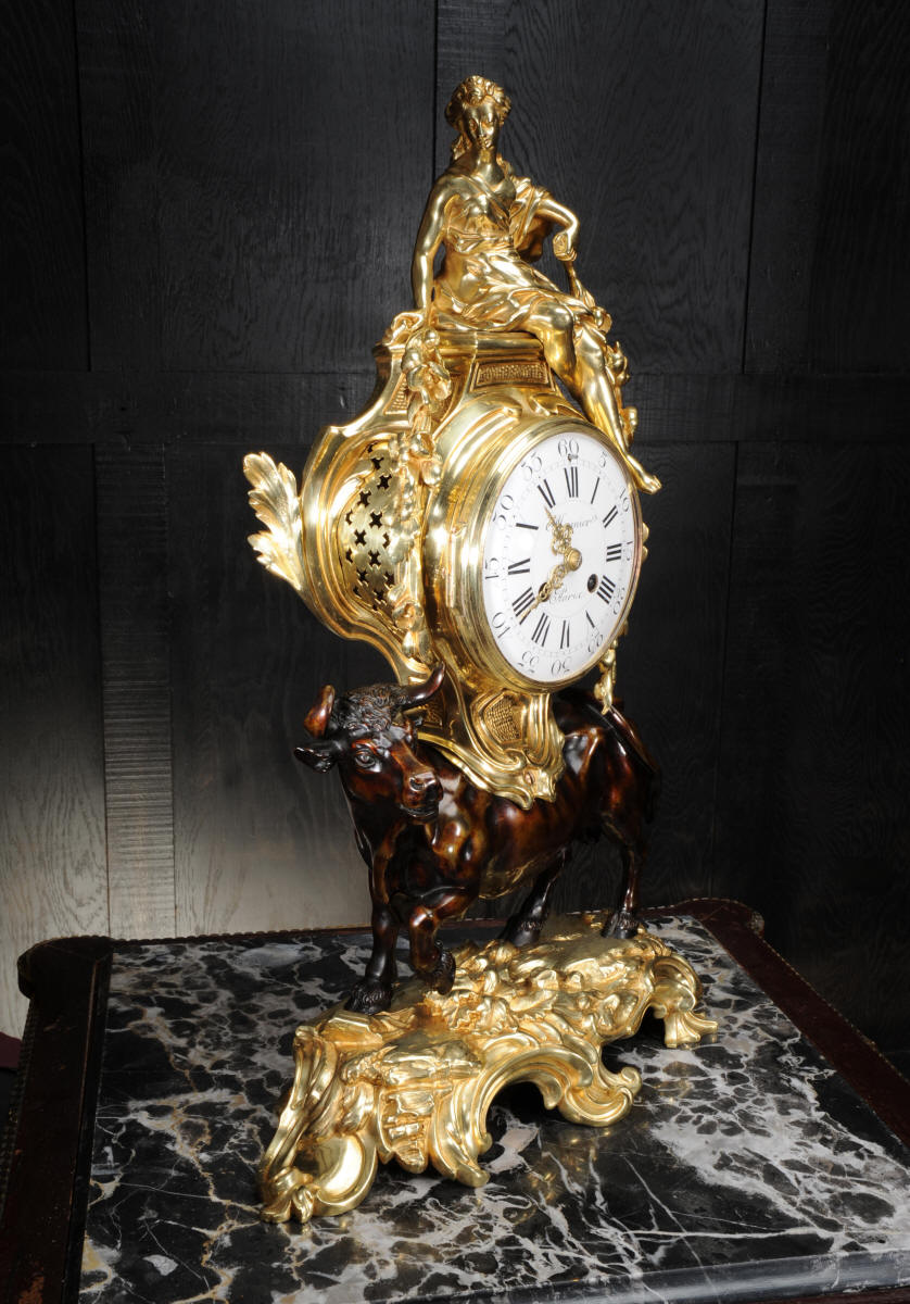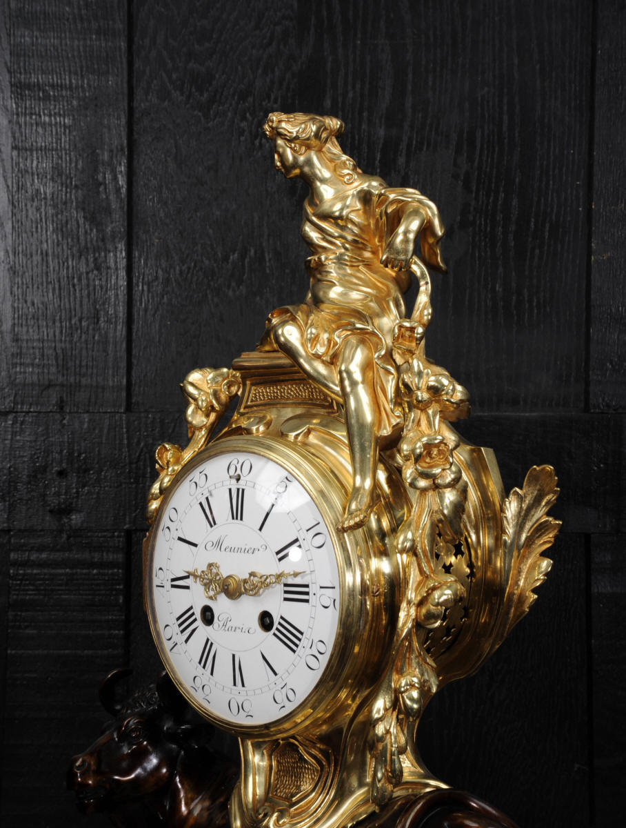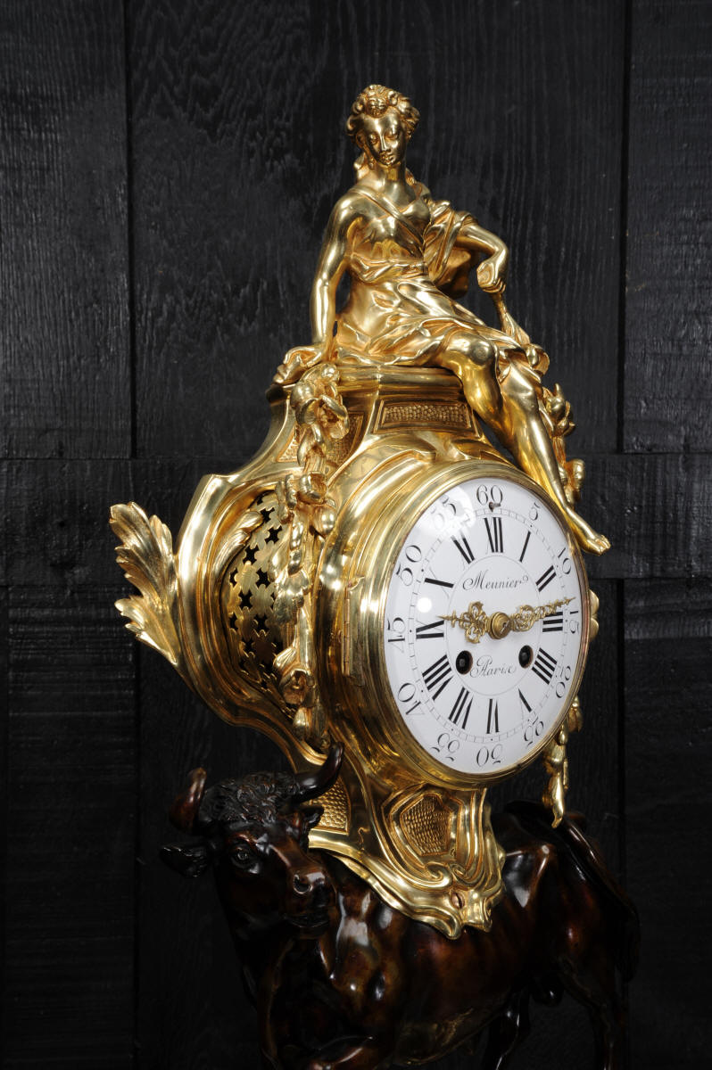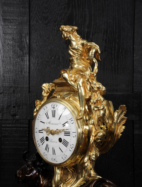 Europa is seated on top of the clock holding garlands of flowers, she is also beautifully modelled in ormolu. Ormolu and bronze are in superb original condition. The dial is porcelain enamel on copper with the original finely fretted gilt brass hands and convex glass. The French movement is of high quality and is in excellent clean and running condition having been fully overhauled by our clockmaker. Pendulum is original with clockmakers mark and serial number. It runs for 8 days and strikes the hours and halves on a bell. Click the video clip below to hear the bell and watch the clock running. Meunier is listed in Tardy Dictionnaire Des Horologers as working at the Route de Versailles in 1870. A Louis XV example by Saint-Germain can be seen in the Louvre, see Pierre Kjellberg, Encyclopédie de La Pendule Française. An example by Robert Osmond is in the Getty Museum, see European Clocks in the J Paul Getty Museum. Condition of the case is excellent, the original gilding is beautifully clean and bright with hardly any wear or discolouration. the bronze patination is also excellent with just some slight wear on the high spots. The dial is also in excellent condition with no damage. A stunning clock in lovely condition.