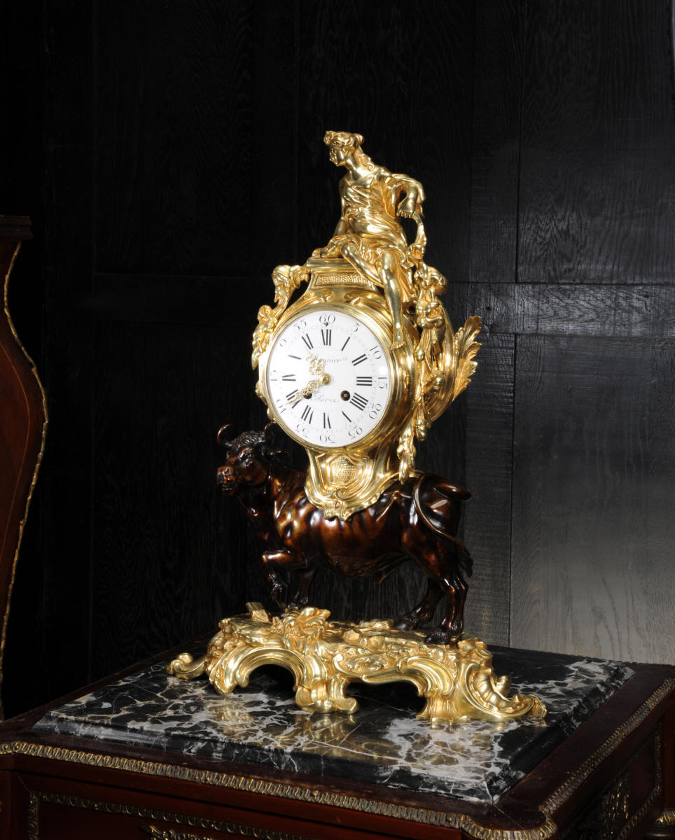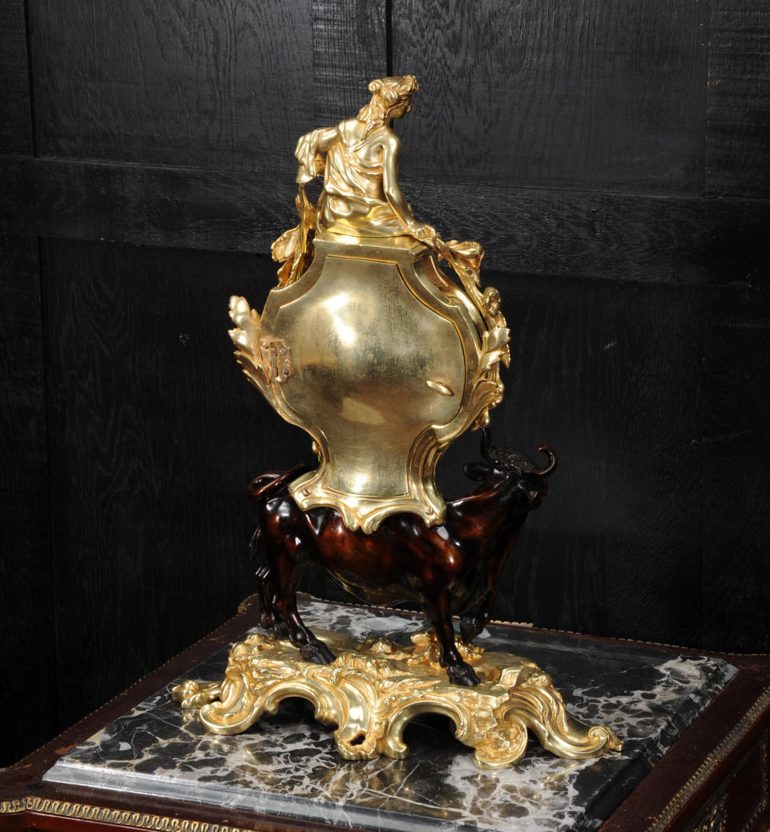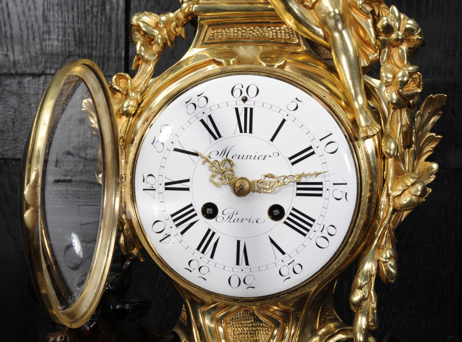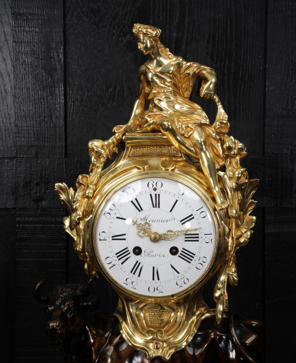 Europa is seated on top of the clock holding garlands of flowers, she is also beautifully modelled in ormolu. Ormolu and bronze are in superb original condition. The dial is porcelain enamel on copper with the original finely fretted gilt brass hands and convex glass. The French movement is of high quality and is in excellent clean and running condition having been fully overhauled by our clockmaker. Pendulum is original with clockmakers mark and serial number. It runs for 8 days and strikes the hours and halves on a bell. Click the video clip below to hear the bell and watch the clock running. Meunier is listed in Tardy Dictionnaire Des Horologers as working at the Route de Versailles in 1870. A Louis XV example by Saint-Germain can be seen in the Louvre, see Pierre Kjellberg, Encyclopédie de La Pendule Française. An example by Robert Osmond is in the Getty Museum, see European Clocks in the J Paul Getty Museum. Condition of the case is excellent, the original gilding is beautifully clean and bright with hardly any wear or discolouration. the bronze patination is also excellent with just some slight wear on the high spots. The dial is also in excellent condition with no damage. A stunning clock in lovely condition.