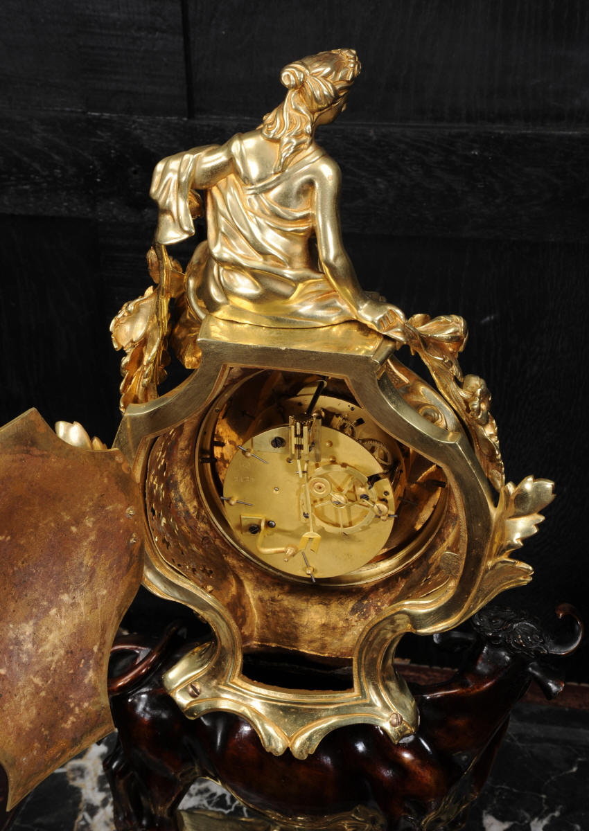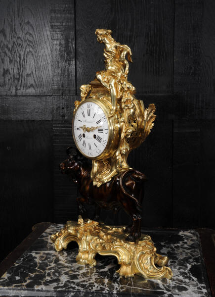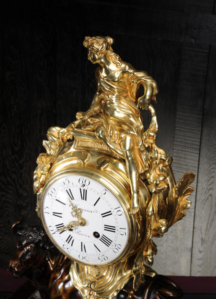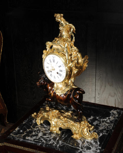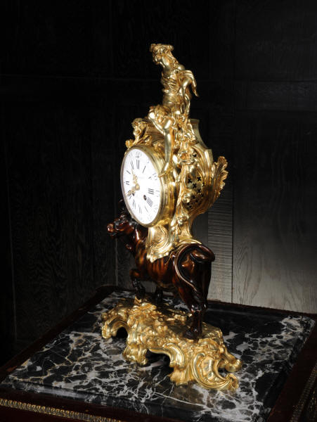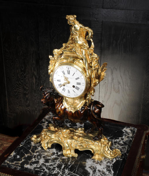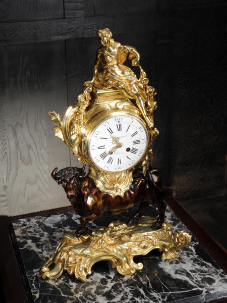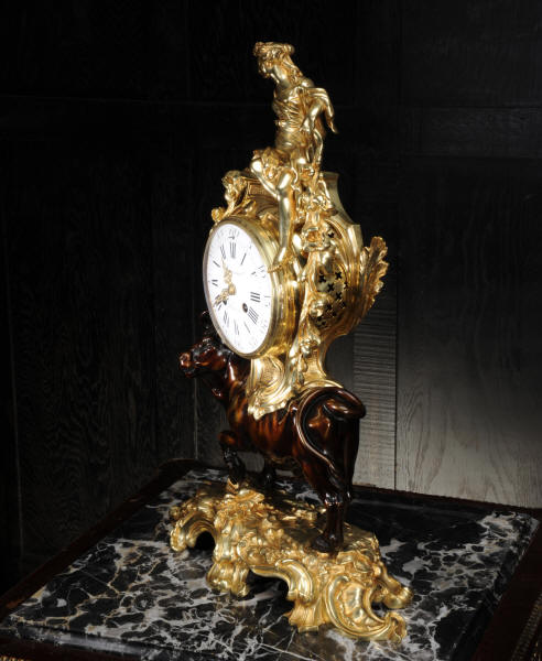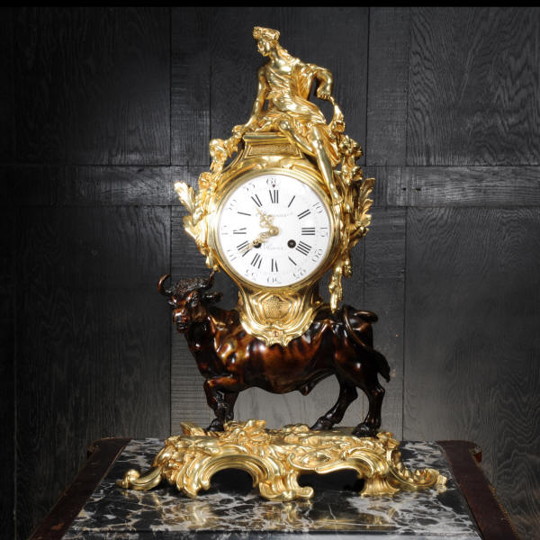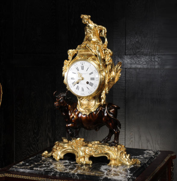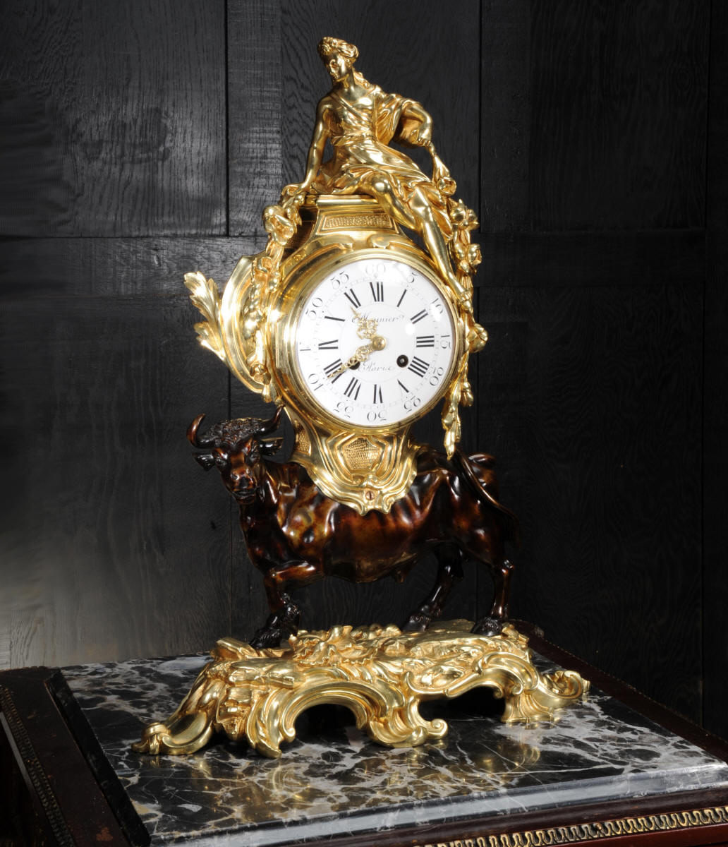 Europa is seated on top of the clock holding garlands of flowers, she is also beautifully modelled in ormolu. Ormolu and bronze are in superb original condition. The dial is porcelain enamel on copper with the original finely fretted gilt brass hands and convex glass. The French movement is of high quality and is in excellent clean and running condition having been fully overhauled by our clockmaker. Pendulum is original with clockmakers mark and serial number. It runs for 8 days and strikes the hours and halves on a bell. Click the video clip below to hear the bell and watch the clock running. Meunier is listed in Tardy Dictionnaire Des Horologers as working at the Route de Versailles in 1870. A Louis XV example by Saint-Germain can be seen in the Louvre, see Pierre Kjellberg, Encyclopédie de La Pendule Française. An example by Robert Osmond is in the Getty Museum, see European Clocks in the J Paul Getty Museum. Condition of the case is excellent, the original gilding is beautifully clean and bright with hardly any wear or discolouration. the bronze patination is also excellent with just some slight wear on the high spots. The dial is also in excellent condition with no damage. A stunning clock in lovely condition.