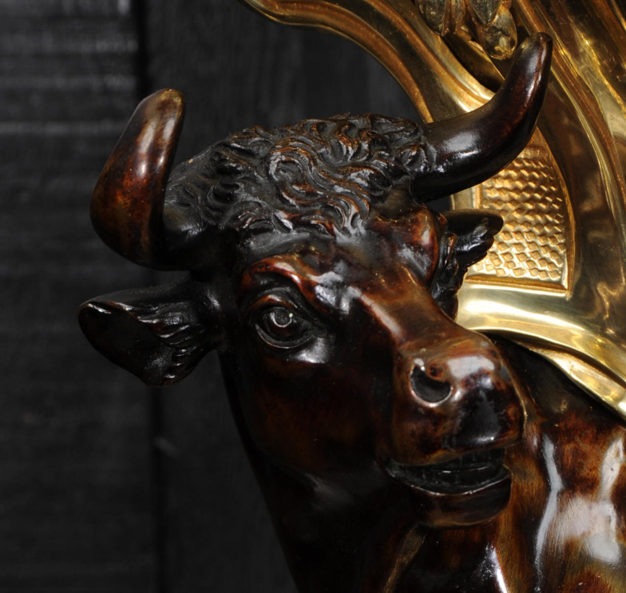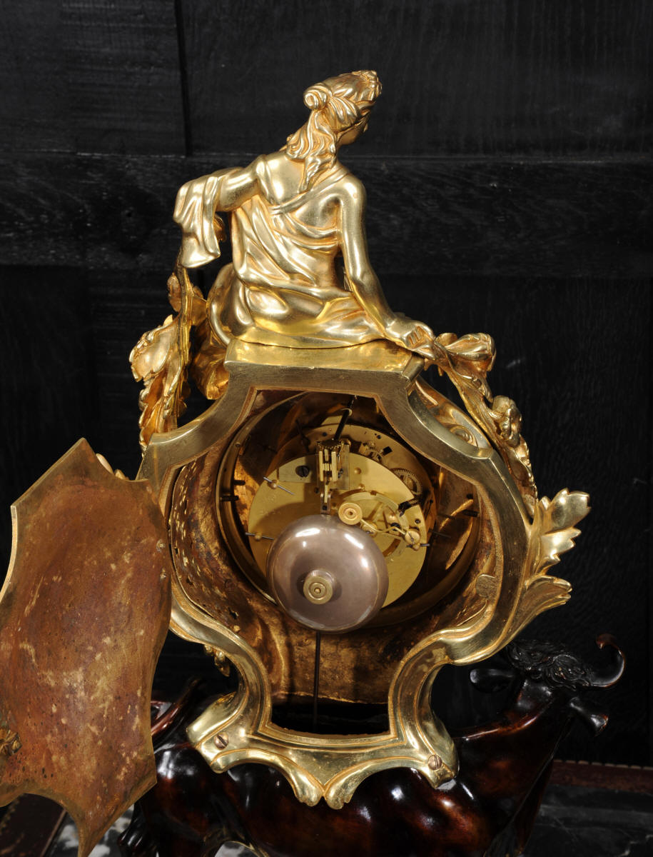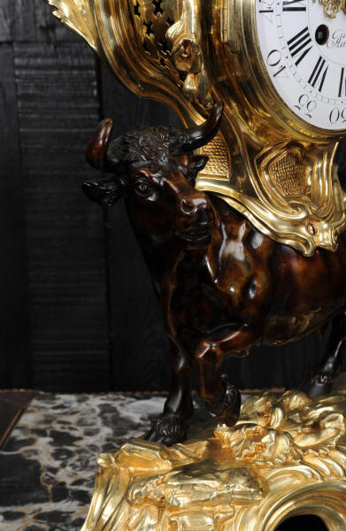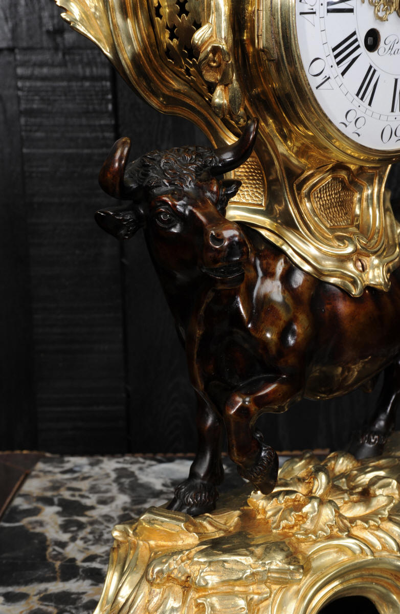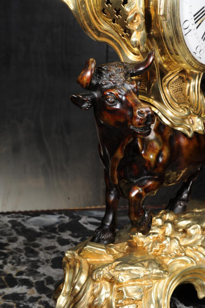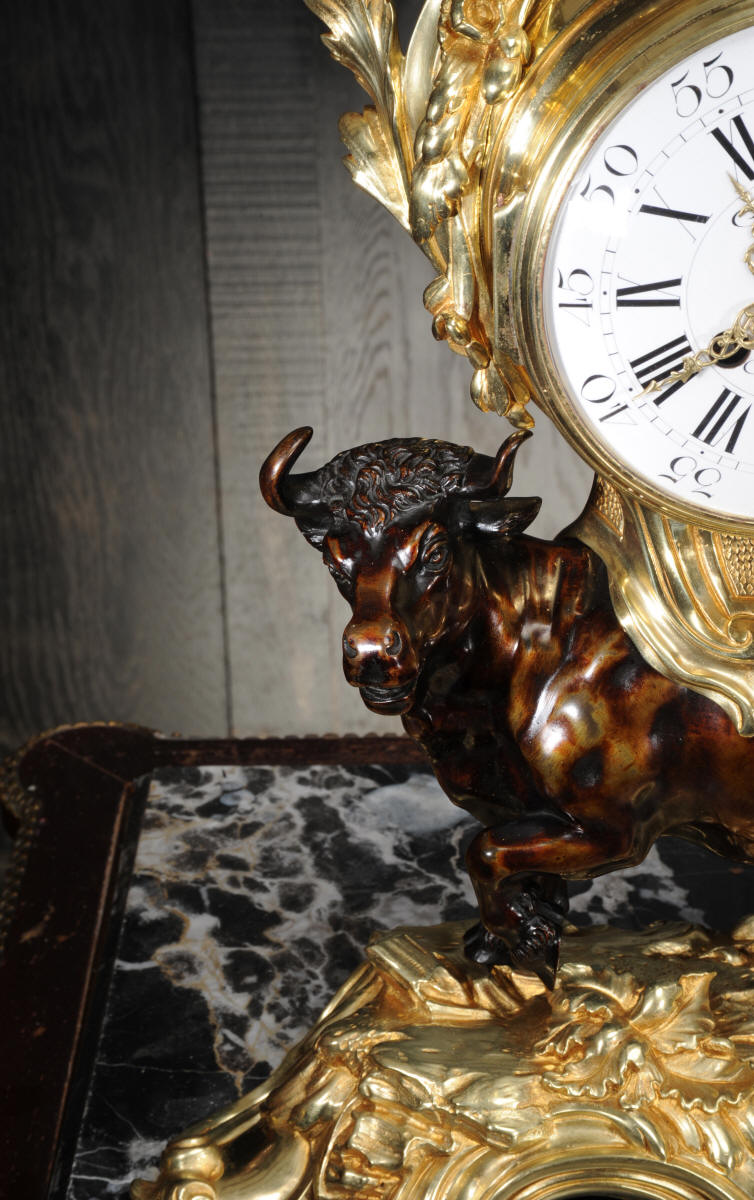 Europa is seated on top of the clock holding garlands of flowers, she is also beautifully modelled in ormolu. Ormolu and bronze are in superb original condition. The dial is porcelain enamel on copper with the original finely fretted gilt brass hands and convex glass. The French movement is of high quality and is in excellent clean and running condition having been fully overhauled by our clockmaker. Pendulum is original with clockmakers mark and serial number. It runs for 8 days and strikes the hours and halves on a bell. Click the video clip below to hear the bell and watch the clock running. Meunier is listed in Tardy Dictionnaire Des Horologers as working at the Route de Versailles in 1870. A Louis XV example by Saint-Germain can be seen in the Louvre, see Pierre Kjellberg, Encyclopédie de La Pendule Française. An example by Robert Osmond is in the Getty Museum, see European Clocks in the J Paul Getty Museum. Condition of the case is excellent, the original gilding is beautifully clean and bright with hardly any wear or discolouration. the bronze patination is also excellent with just some slight wear on the high spots. The dial is also in excellent condition with no damage. A stunning clock in lovely condition.
