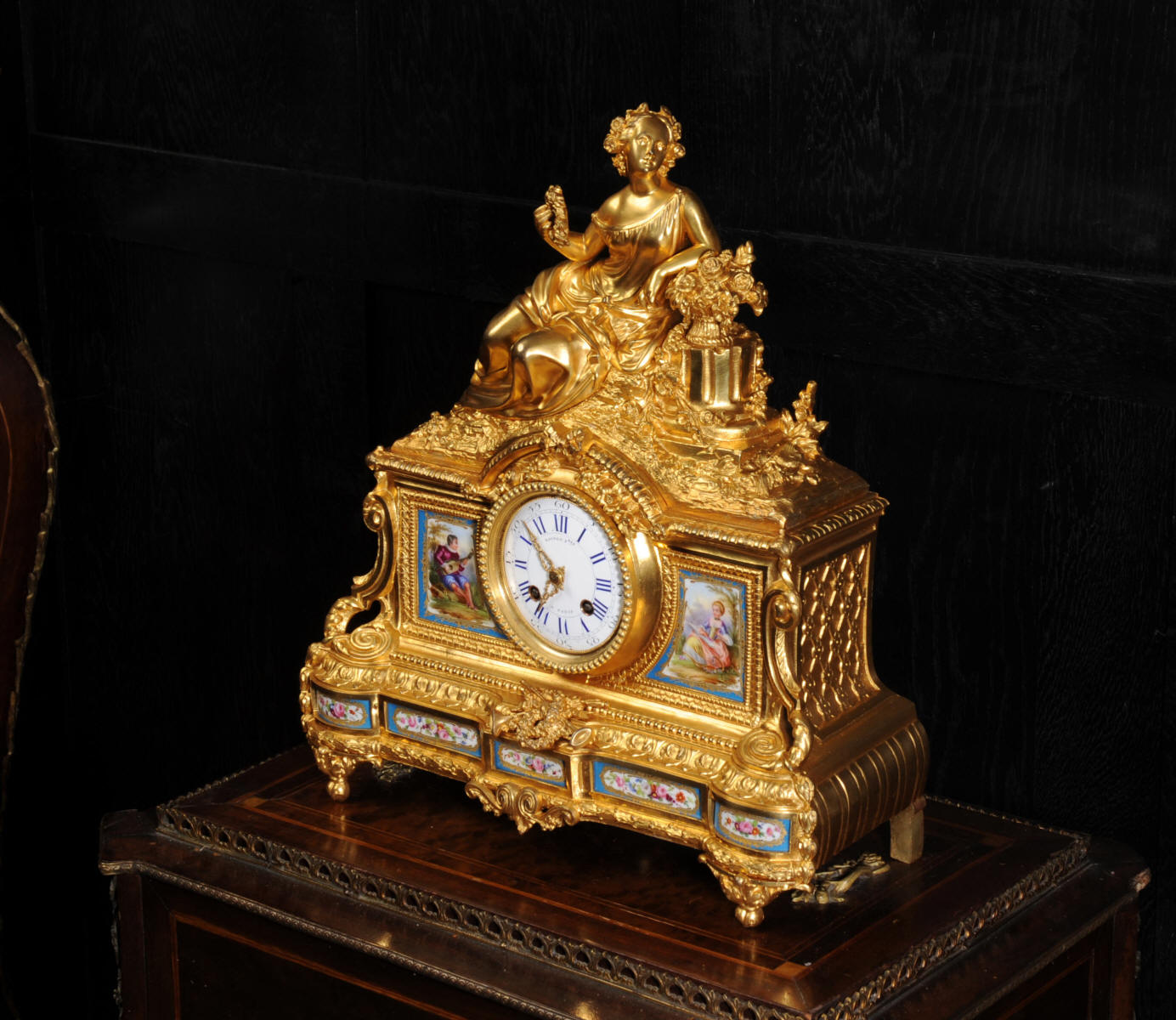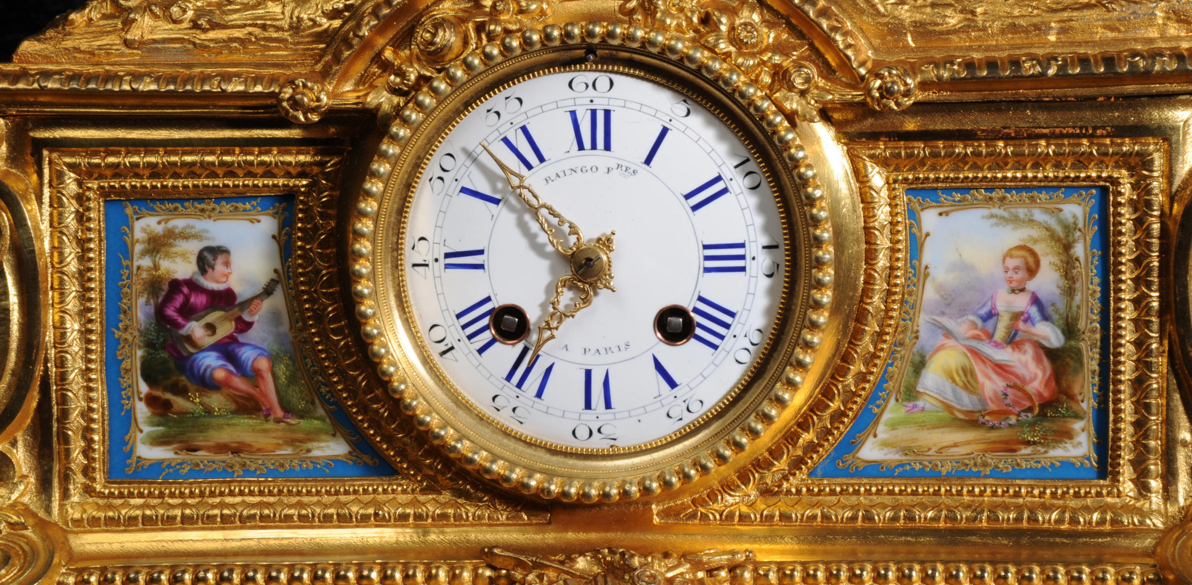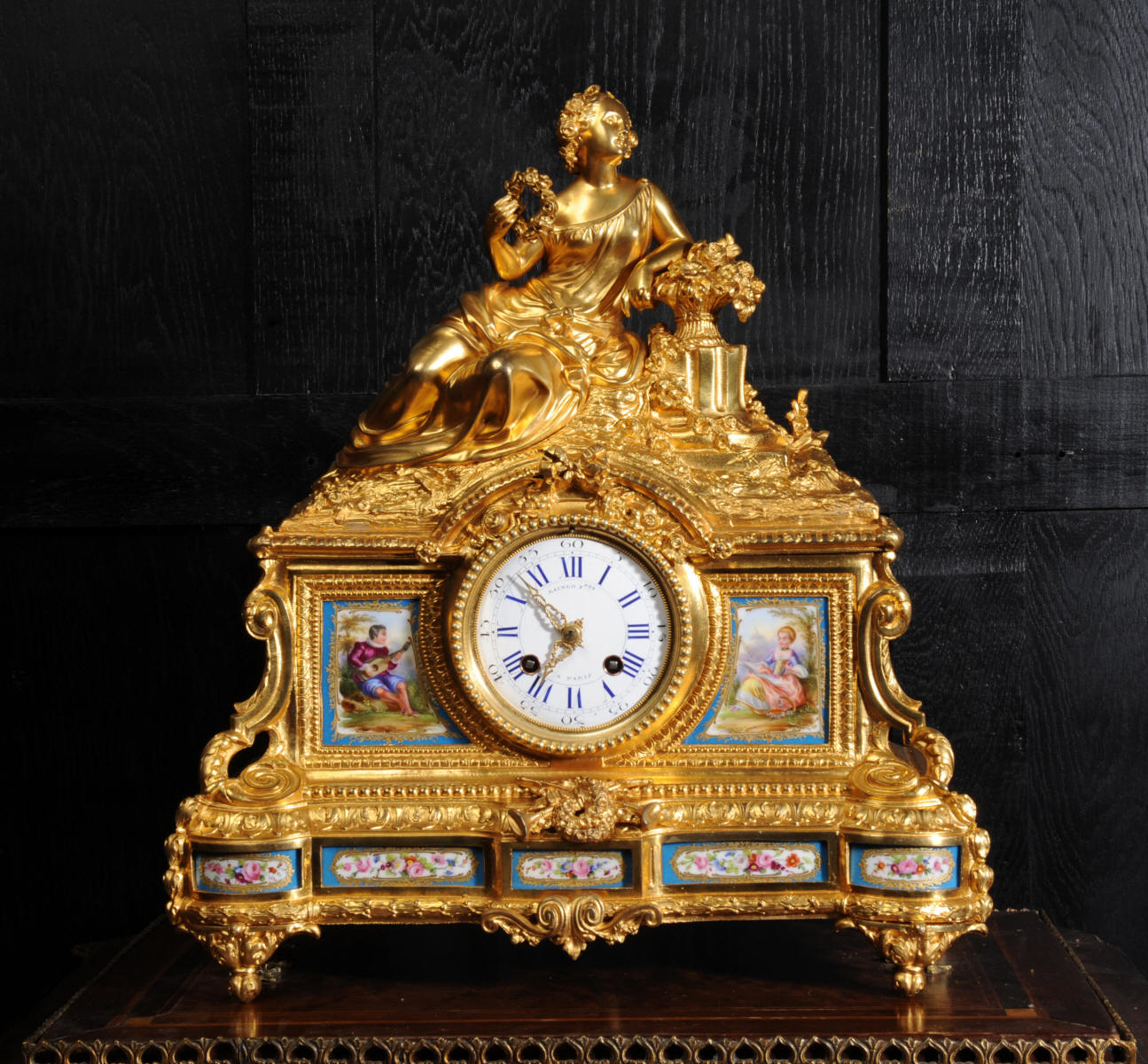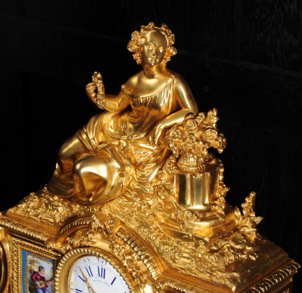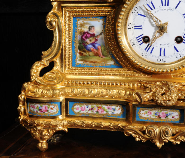 The panels below are finely painted with floral swags. Porcelain has a blue ground with beautifully painted over glaze gilt decoration, each is numbered and signed to the rear (see the picture below). The dial is porcelain enamel on copper with blue lettering and a separate minute ring. Unusually the case is also numbered and signed for the renown bronze founder Henri Picard who often worked for Raingo Frères. The French movement is by Raingo Frères and is of high quality. It is in excellent clean and running condition having been fully overhauled by our clockmaker and thoroughly tested. Pendulum is a replacement. It runs for 8 days and strikes the hours and halves on a bell. Click the video clip below to hear the bell and watch the clock running! Zacharie Raingo was apprenticed in Paris in 1790 and went on to establish Raingo Frères in 1813. Initially specialising in precision astronomical clocks and then after 1825 clocks and bronzes. Clients included the Emperor and Empress. The firm exhibited at many of the important exhibitions of the second half of the 19th century and was known for the fine quality of its ormolu. Henri Picard - The important founder and Gilder Henri Picard was based in Paris at 6, rue Jarente from 1831 to 1839, before moving to 10, rue de la Perle. The firm was active until around 1890. Celebrated for the high quality of his production, Henri Picard supplied many important patrons, including garnand table pieces for the petits appartements of Emperor Napoleon III at the Louvre. An important pair of twelve-light candelabra by Picard remain in the Musée du Louvre today. Condition of the case is excellent, the original gilding is beautifully clean and bright with some very slight wear. The dial is also in excellent condition just some small and faint hairlining between the 12 and 1. porcelain is excellent including the over-glaze gilt decoration which is almost all intact. Please note that this type of clock does not have a glazed bezel or rear door. A stunning original clock in remarkable condition, ready to display.