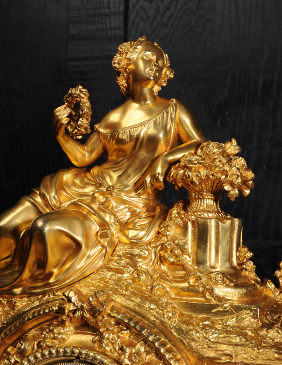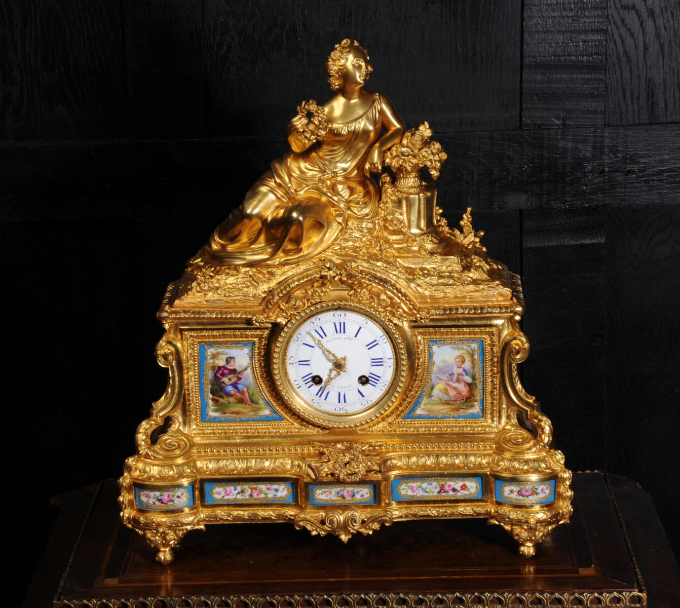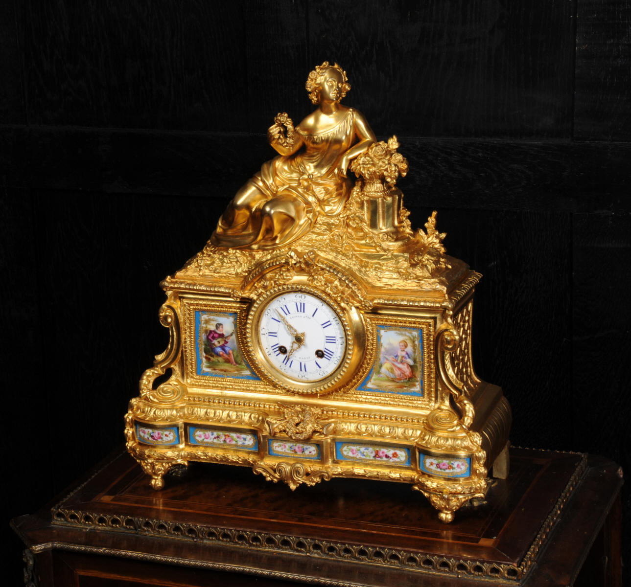 The panels below are finely painted with floral swags. Porcelain has a blue ground with beautifully painted over glaze gilt decoration, each is numbered and signed to the rear (see the picture below). The dial is porcelain enamel on copper with blue lettering and a separate minute ring. Unusually the case is also numbered and signed for the renown bronze founder Henri Picard who often worked for Raingo Frères. The French movement is by Raingo Frères and is of high quality. It is in excellent clean and running condition having been fully overhauled by our clockmaker and thoroughly tested. Pendulum is a replacement. It runs for 8 days and strikes the hours and halves on a bell. Click the video clip below to hear the bell and watch the clock running! Zacharie Raingo was apprenticed in Paris in 1790 and went on to establish Raingo Frères in 1813. Initially specialising in precision astronomical clocks and then after 1825 clocks and bronzes. Clients included the Emperor and Empress. The firm exhibited at many of the important exhibitions of the second half of the 19th century and was known for the fine quality of its ormolu. Henri Picard - The important founder and Gilder Henri Picard was based in Paris at 6, rue Jarente from 1831 to 1839, before moving to 10, rue de la Perle. The firm was active until around 1890. Celebrated for the high quality of his production, Henri Picard supplied many important patrons, including garnand table pieces for the petits appartements of Emperor Napoleon III at the Louvre. An important pair of twelve-light candelabra by Picard remain in the Musée du Louvre today. Condition of the case is excellent, the original gilding is beautifully clean and bright with some very slight wear. The dial is also in excellent condition just some small and faint hairlining between the 12 and 1. porcelain is excellent including the over-glaze gilt decoration which is almost all intact. Please note that this type of clock does not have a glazed bezel or rear door. A stunning original clock in remarkable condition, ready to display.
