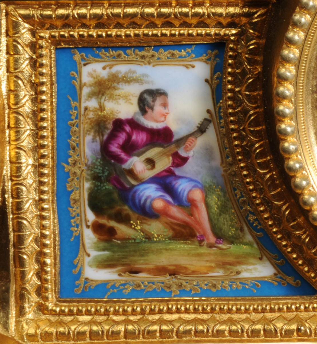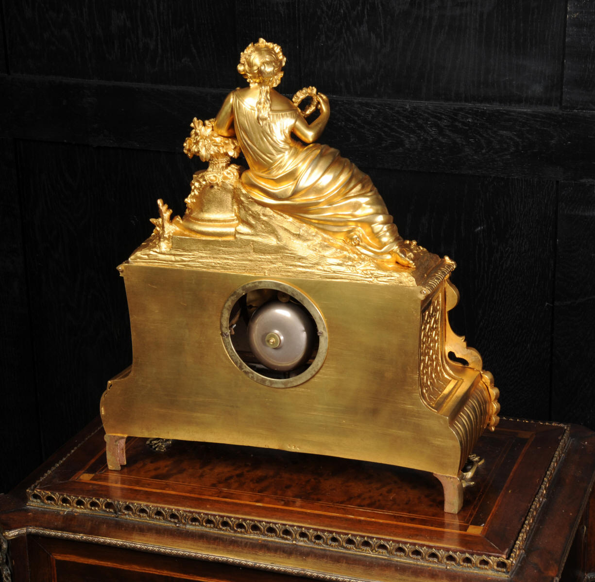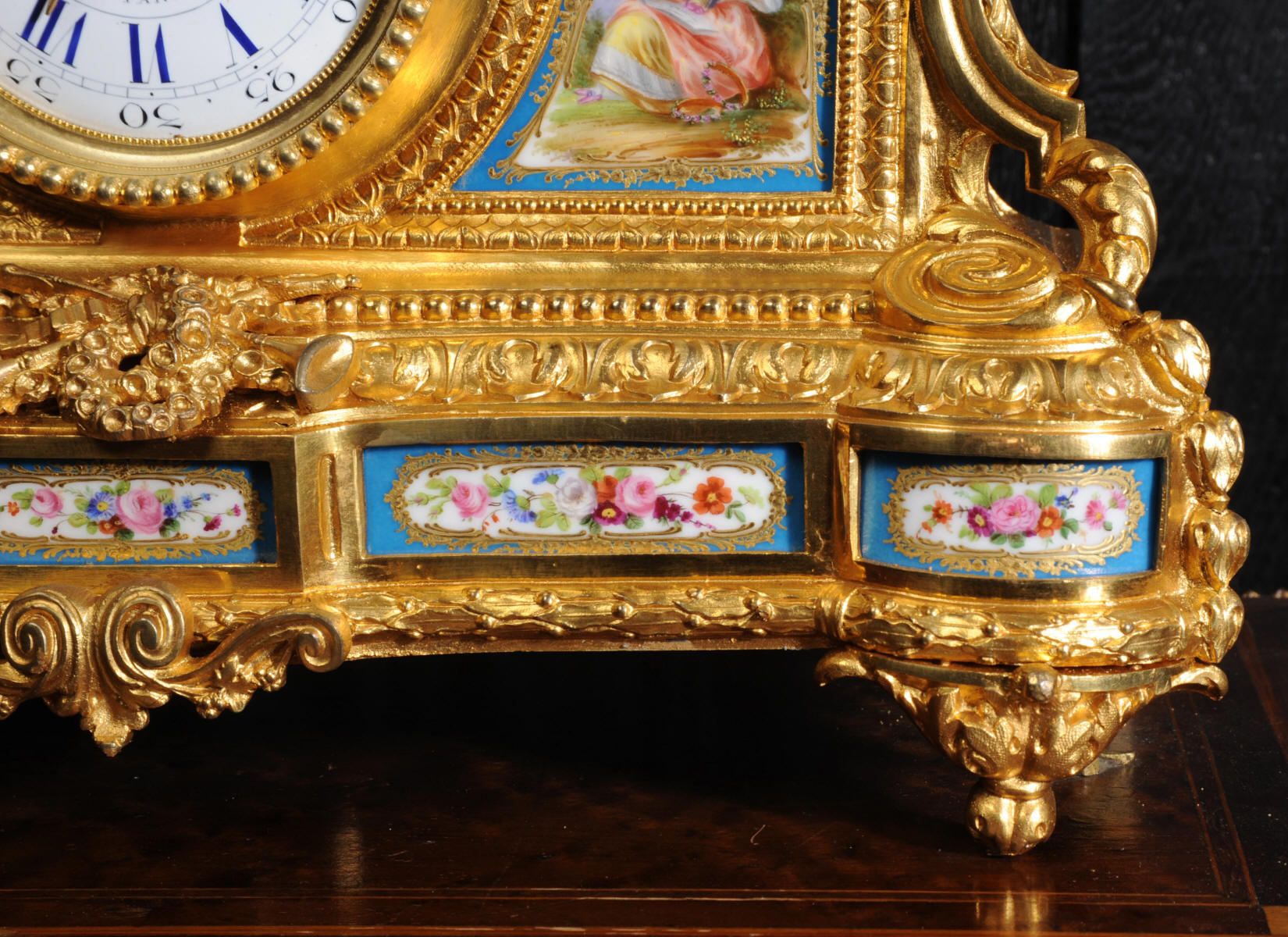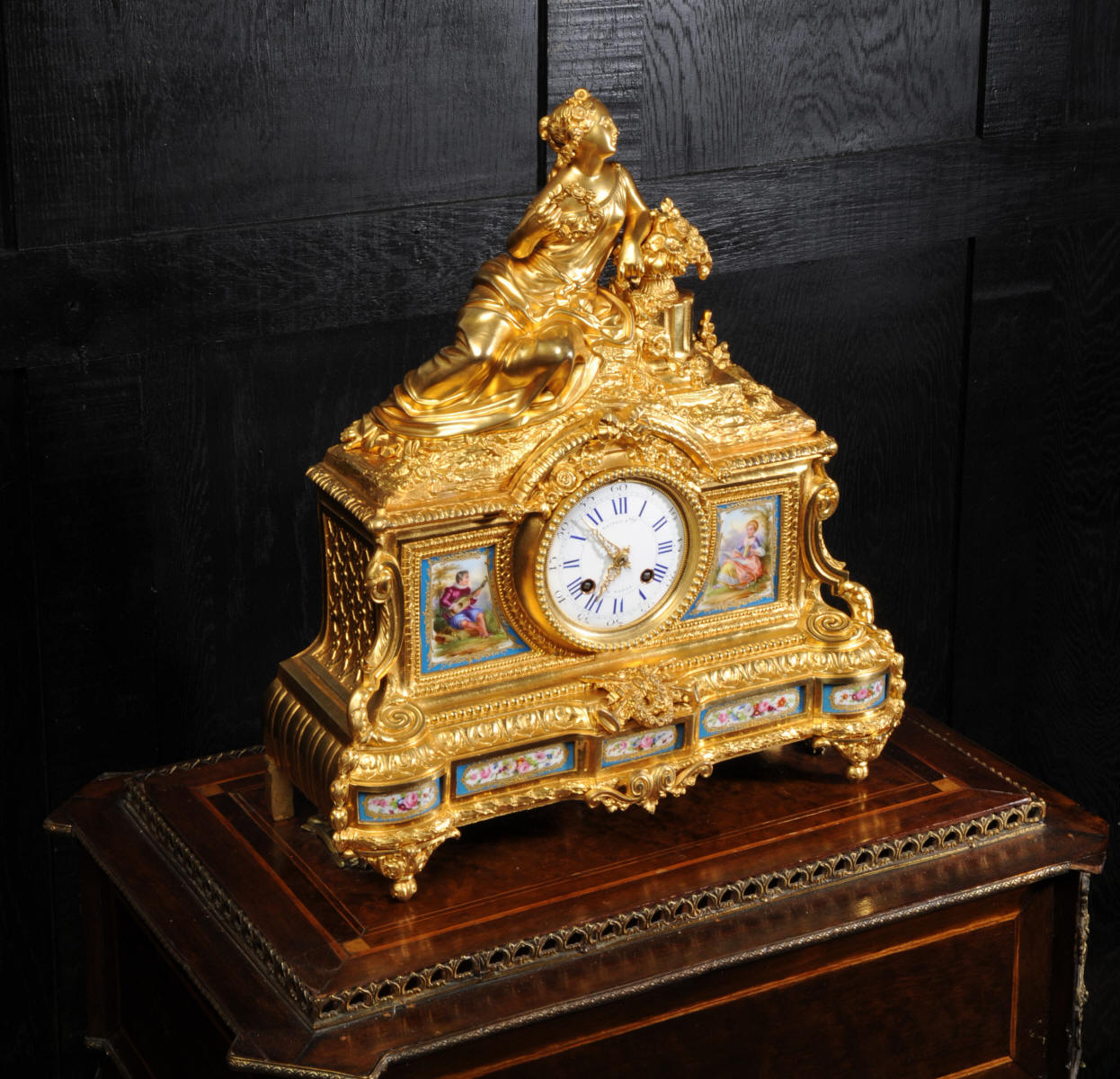 The panels below are finely painted with floral swags. Porcelain has a blue ground with beautifully painted over glaze gilt decoration, each is numbered and signed to the rear (see the picture below). The dial is porcelain enamel on copper with blue lettering and a separate minute ring. Unusually the case is also numbered and signed for the renown bronze founder Henri Picard who often worked for Raingo Frères. The French movement is by Raingo Frères and is of high quality. It is in excellent clean and running condition having been fully overhauled by our clockmaker and thoroughly tested. Pendulum is a replacement. It runs for 8 days and strikes the hours and halves on a bell. Click the video clip below to hear the bell and watch the clock running! Zacharie Raingo was apprenticed in Paris in 1790 and went on to establish Raingo Frères in 1813. Initially specialising in precision astronomical clocks and then after 1825 clocks and bronzes. Clients included the Emperor and Empress. The firm exhibited at many of the important exhibitions of the second half of the 19th century and was known for the fine quality of its ormolu. Henri Picard - The important founder and Gilder Henri Picard was based in Paris at 6, rue Jarente from 1831 to 1839, before moving to 10, rue de la Perle. The firm was active until around 1890. Celebrated for the high quality of his production, Henri Picard supplied many important patrons, including garnand table pieces for the petits appartements of Emperor Napoleon III at the Louvre. An important pair of twelve-light candelabra by Picard remain in the Musée du Louvre today. Condition of the case is excellent, the original gilding is beautifully clean and bright with some very slight wear. The dial is also in excellent condition just some small and faint hairlining between the 12 and 1. porcelain is excellent including the over-glaze gilt decoration which is almost all intact. Please note that this type of clock does not have a glazed bezel or rear door. A stunning original clock in remarkable condition, ready to display.