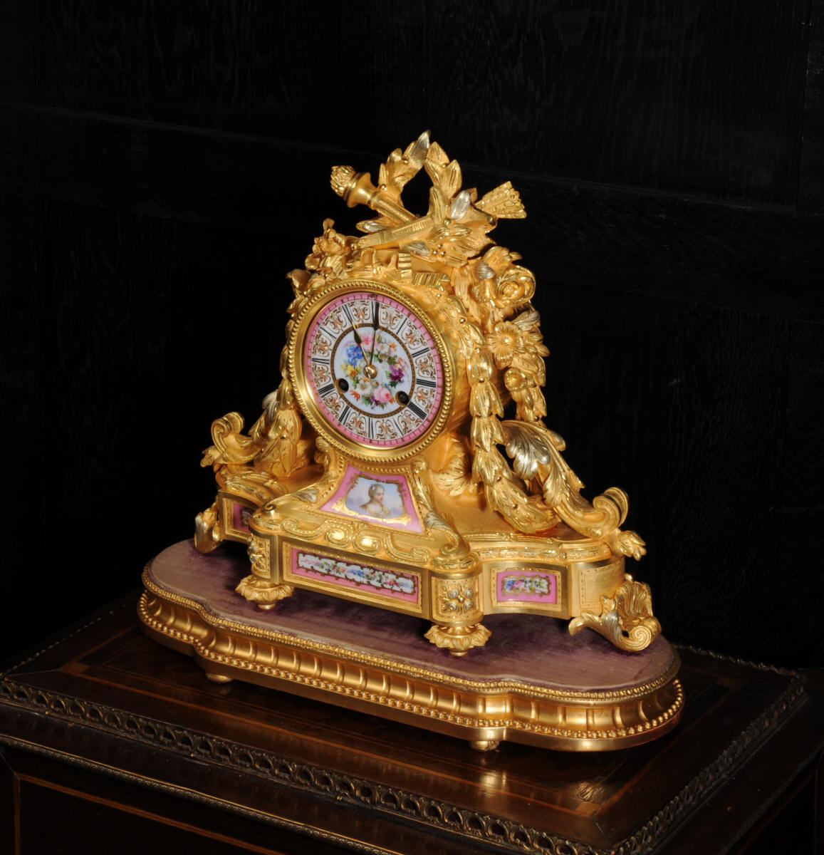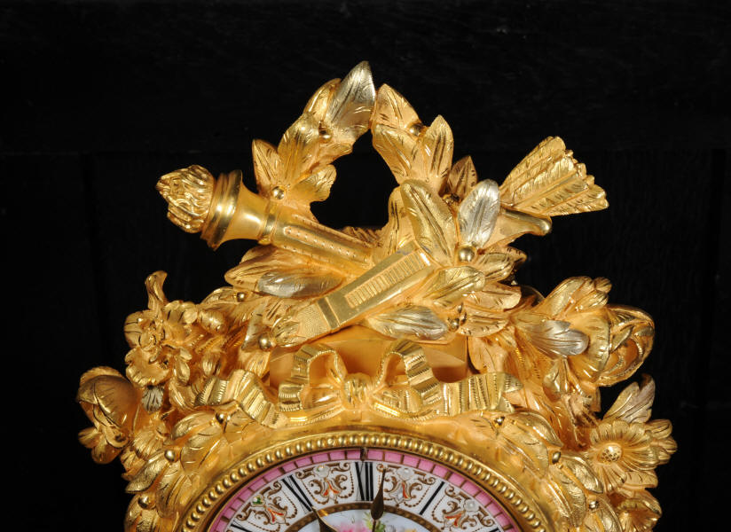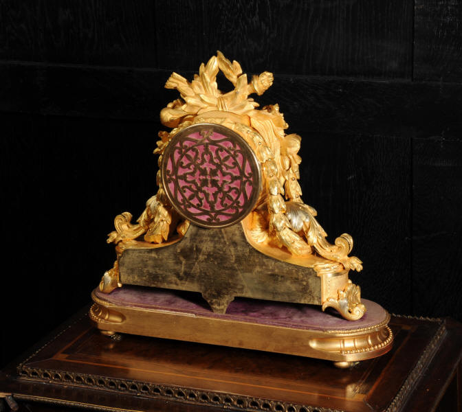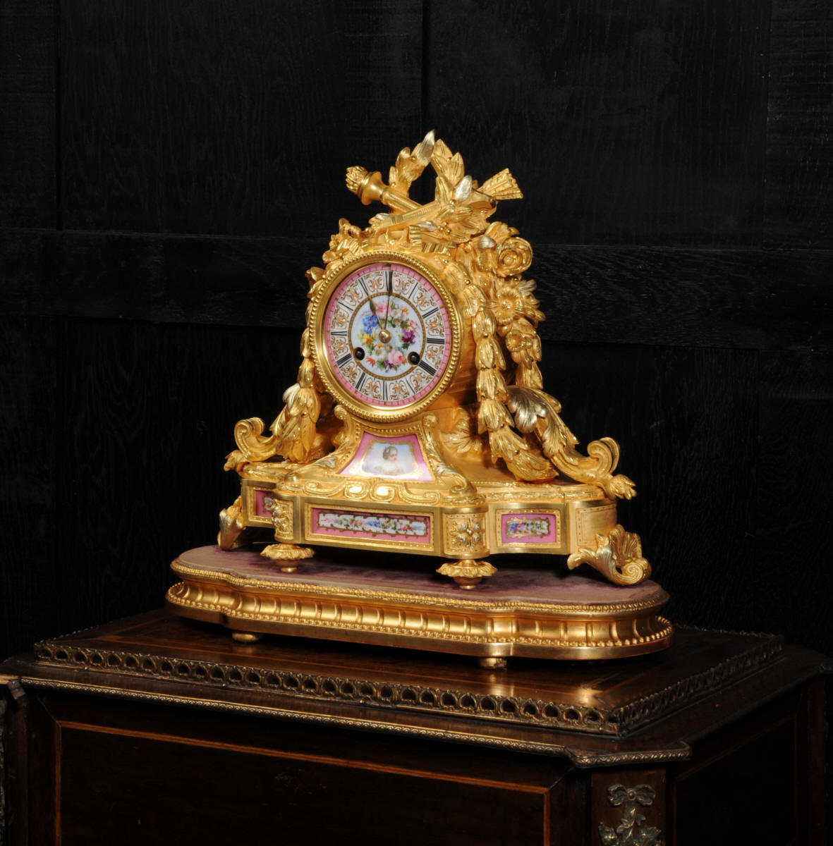 The gilding is in lovely original condition with a colour and finish that can only be achieved with mercury gilding. It is well finished with polished highlights. The bronze work is heavy but beautifully light in design with a fine crispness. It is of classical design with a crossed torché and quiver of arrows to the top with a laurel wreath and flowing acanthus swags. The clocks sits upon its original gesso base. The serial number of the clock is on the porcelain, bezel, rear bezel, case and the base. The French movement is superb quality and is by the renown maker Jean-Baptiste Delettrez. His mark is on the movement backplate and on the bezel. It is a large plate version of the Pendule d'Paris movement with Brocot Pin-pallet escapement and rack strike. It is in excellent clean and running condition. Pendulum is a replacement. It runs for 8 days and strikes the hours and halves on a bell. Click the video clip below to hear the bell and watch the clock running! Jean-Baptiste Delettrez (1816-1887) is listed as working in Tardy Dictionnaire des Horlogers as working at Rue de Berry au Marais in 1850. He formed a partnership after this with Achille Brocot. Condition of the case is excellent, the original gilding is beautifully clean and bright with just some minor wear to a few high spots where the clock has been handled. The dial and porcelain is also in excellent condition, some of the tiny jewel half hour markers are missing. The base is in good condition with original silk to the top and some minor and old wood worm damage. The delicate gesso however is in excellent condition. We have replaced the fabric in the rear door.