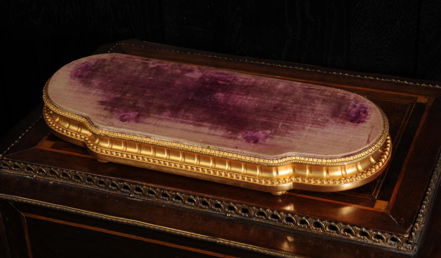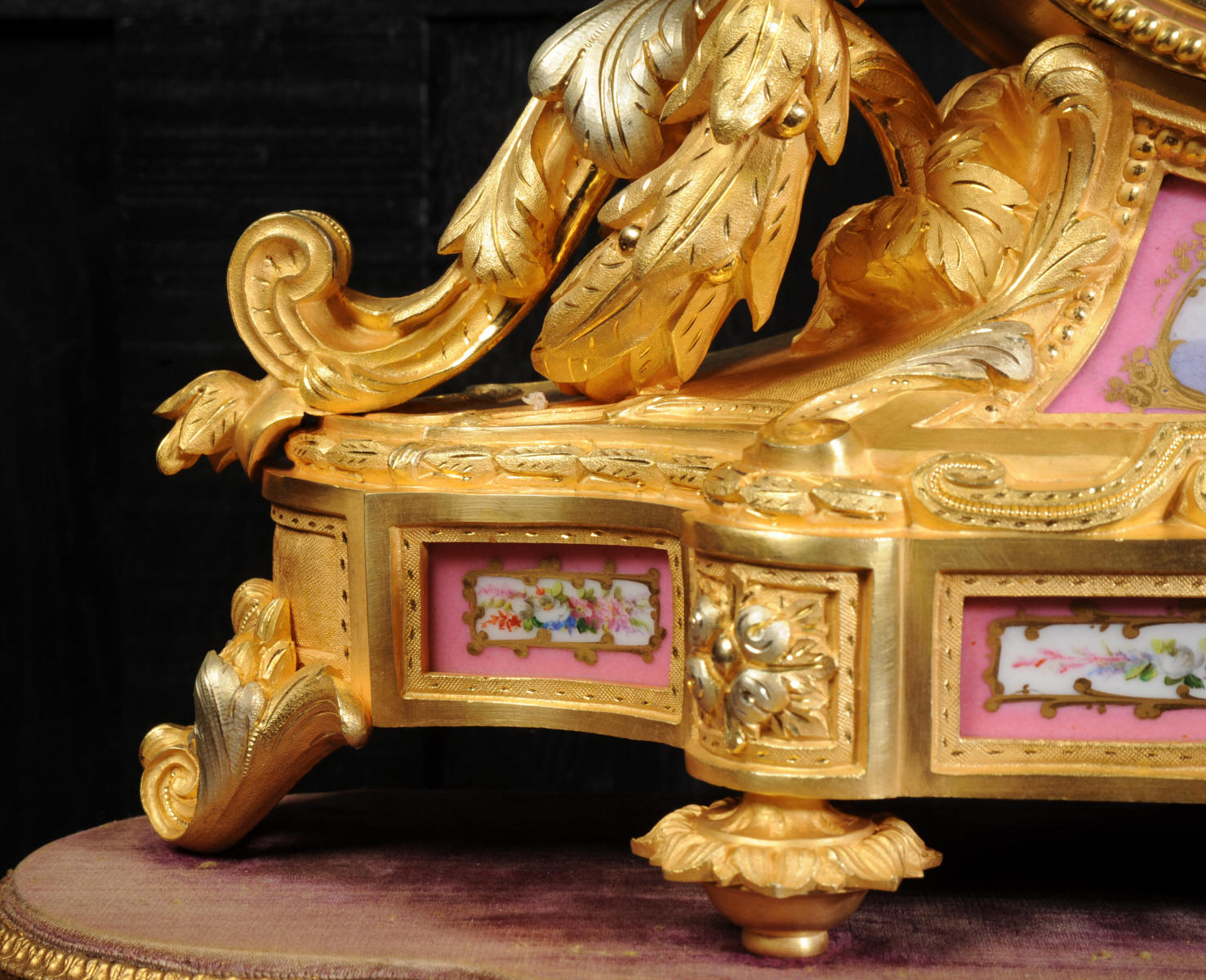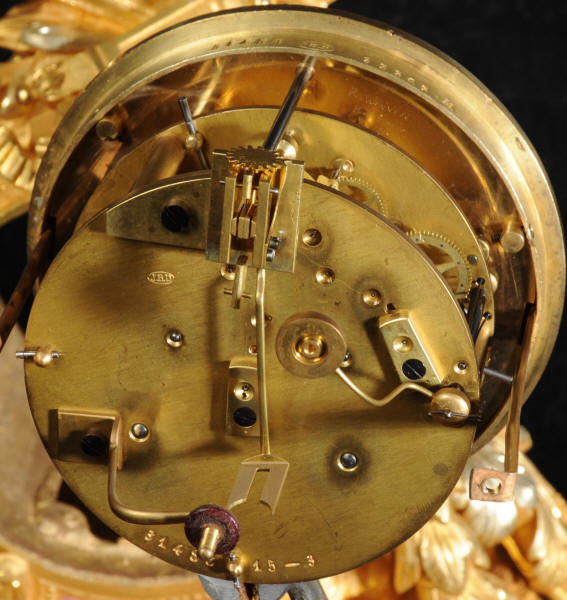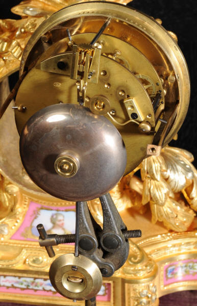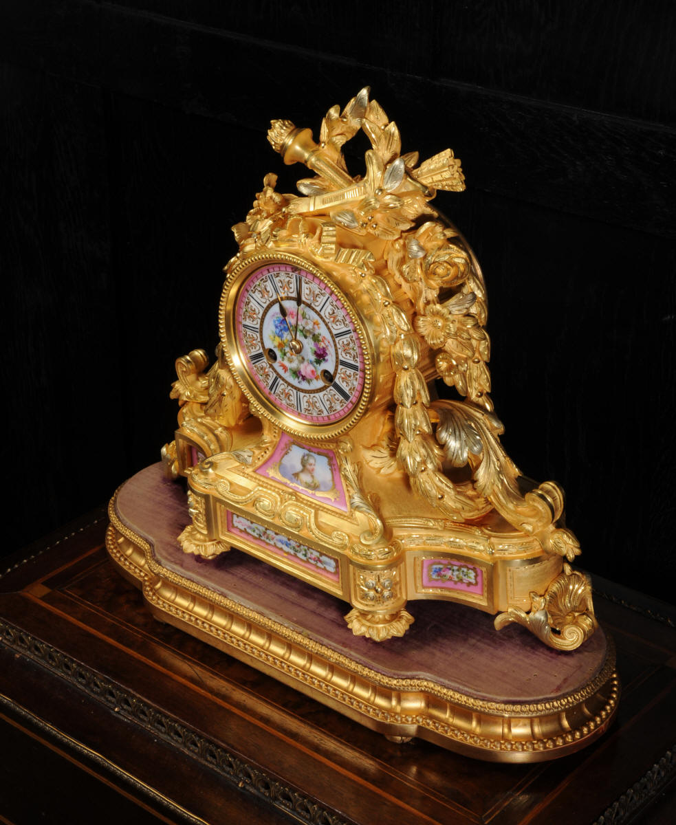 The gilding is in lovely original condition with a colour and finish that can only be achieved with mercury gilding. It is well finished with polished highlights. The bronze work is heavy but beautifully light in design with a fine crispness. It is of classical design with a crossed torché and quiver of arrows to the top with a laurel wreath and flowing acanthus swags. The clocks sits upon its original gesso base. The serial number of the clock is on the porcelain, bezel, rear bezel, case and the base. The French movement is superb quality and is by the renown maker Jean-Baptiste Delettrez. His mark is on the movement backplate and on the bezel. It is a large plate version of the Pendule d'Paris movement with Brocot Pin-pallet escapement and rack strike. It is in excellent clean and running condition. Pendulum is a replacement. It runs for 8 days and strikes the hours and halves on a bell. Click the video clip below to hear the bell and watch the clock running! Jean-Baptiste Delettrez (1816-1887) is listed as working in Tardy Dictionnaire des Horlogers as working at Rue de Berry au Marais in 1850. He formed a partnership after this with Achille Brocot. Condition of the case is excellent, the original gilding is beautifully clean and bright with just some minor wear to a few high spots where the clock has been handled. The dial and porcelain is also in excellent condition, some of the tiny jewel half hour markers are missing. The base is in good condition with original silk to the top and some minor and old wood worm damage. The delicate gesso however is in excellent condition. We have replaced the fabric in the rear door.