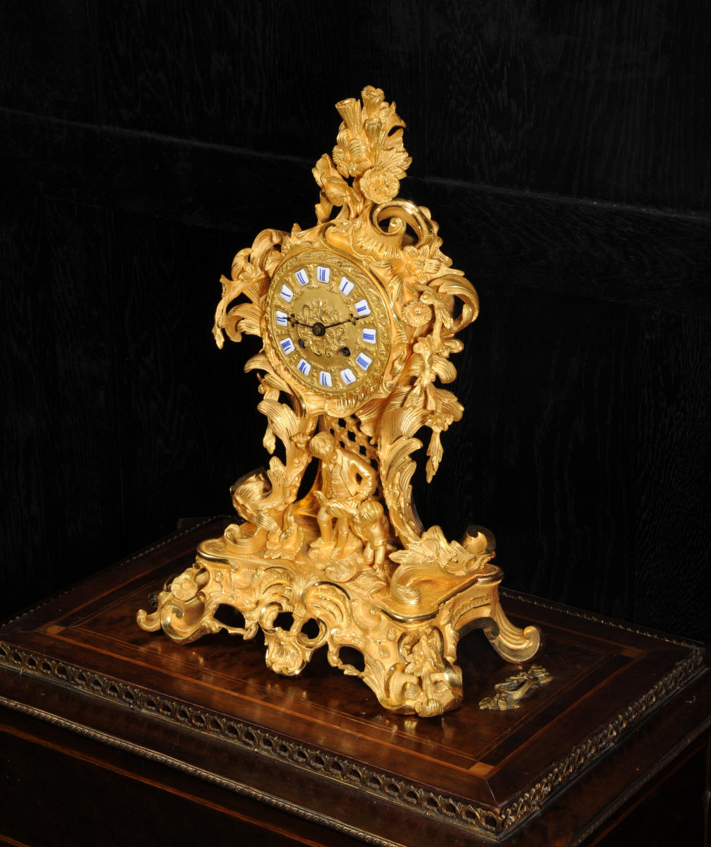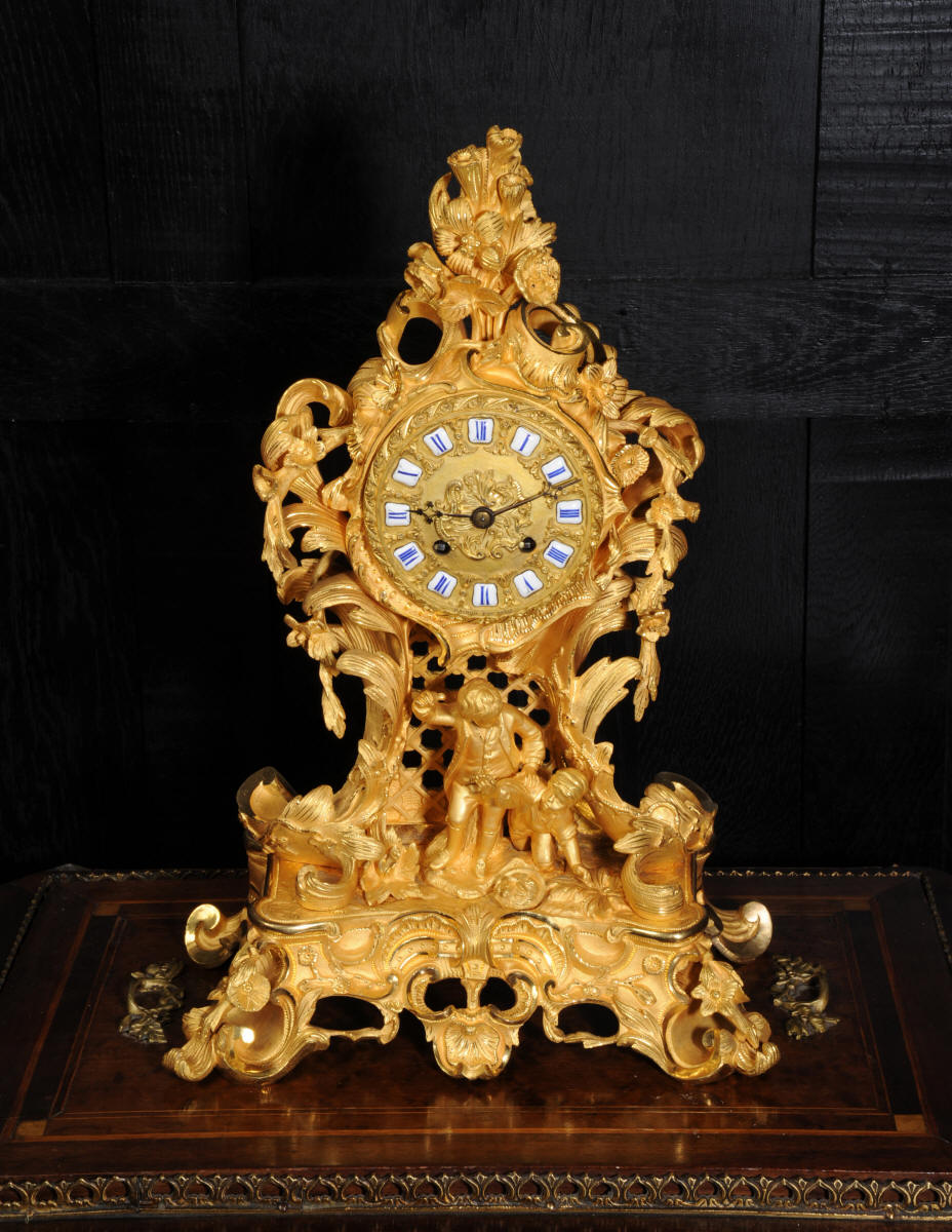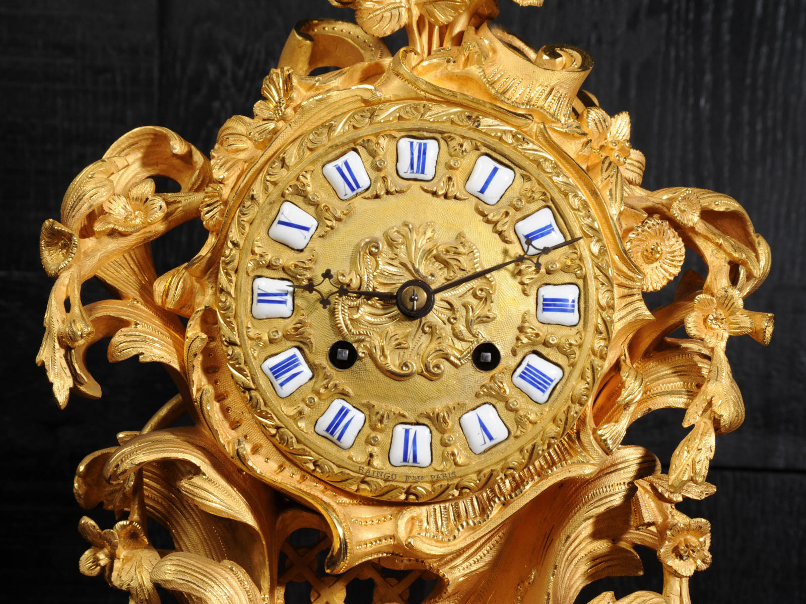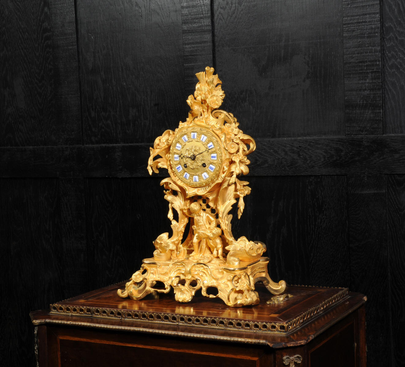 The clock is Rococo in style, decorated profusely with finely modeled foliage and floral swags. It sits upon a heavy integral base on two sweeping 'C' scroll brackets. A niche below the dial houses of scene of two boys tussling over a birds nest. Behind the niche is a fretted panel to allow a glimpse of the pendulum gently swinging behind. The clock is modelled in the round, it would display very nicely in the centre of a room or in front of a mirror. The dial is also ormolu with 12 individual enamel cartouches and blued steel hands. To the bottom of the dial is the Raingo Freres signature. the hand fretted and blued steel hands are original. Please note that this type of clock does not have a glass bezel or a rear door. Unusually, the case is marked with the movement serial number, confirming originality. Zacharie Raingo was apprenticed in Paris in 1790 and went on to establish Raingo Freres in 1813. Initially specialising in precision astronomical clocks and then after 1825 clocks and bronzes. Clients included the Emperor and Empress. The firm exhibited at many of the important exhibitions of the second half of the 19th century and was known for the fine quality of its ormolu. The French movement is by Raingo Freres and is of high quality. It is the early version of the Pendule de Paris movement with silk suspension. It is in excellent clean and running condition having been fully overhauled by our clockmaker. Pendulum is an old replacement. It runs for 8 days and strikes the hours and halves on a bell. Click the video clip below to hear the bell and watch the clock running! Condition of the case is excellent, the original gilding is superb, clean and bright with hardly any wear or discolouration and there are no losses. The dial is also in excellent condition with no damage. A superb early clock in exceptional condition to add to your collection.