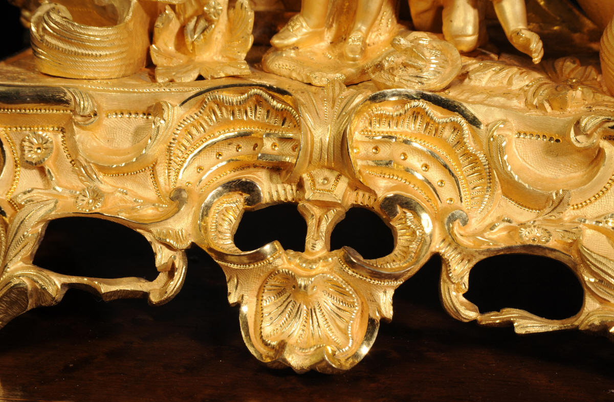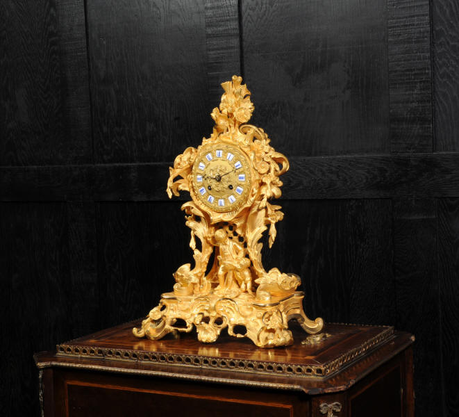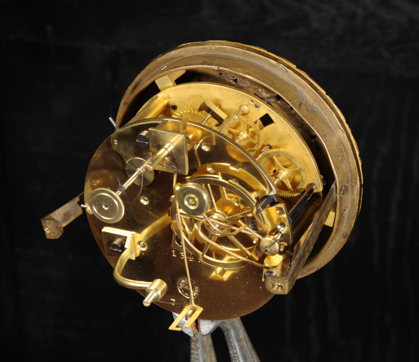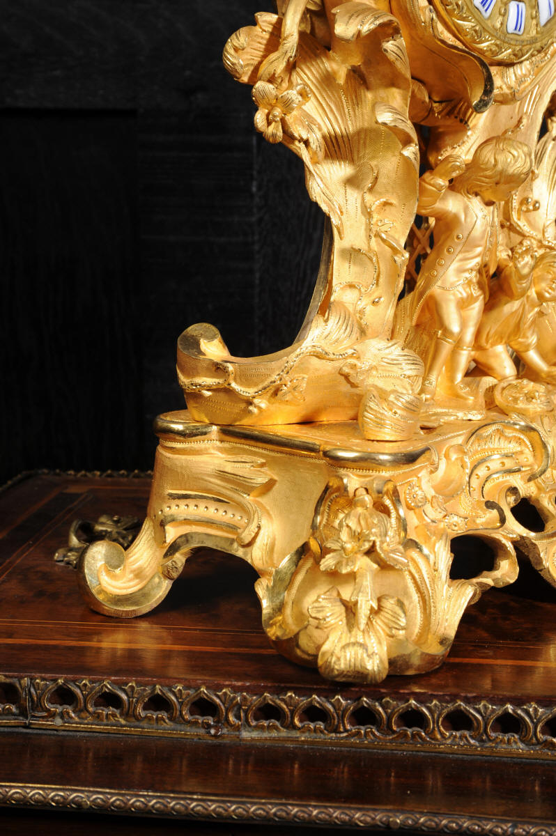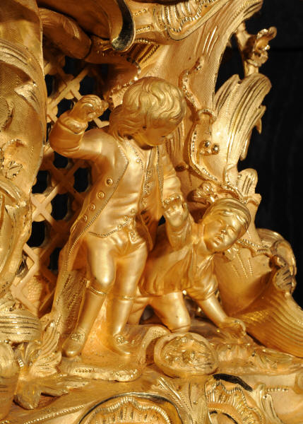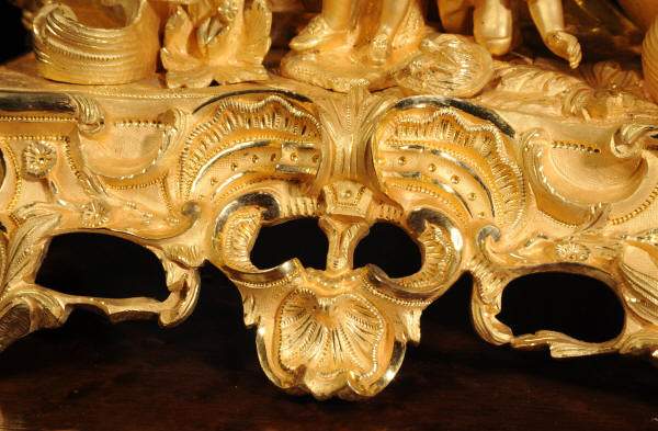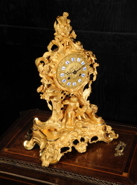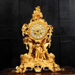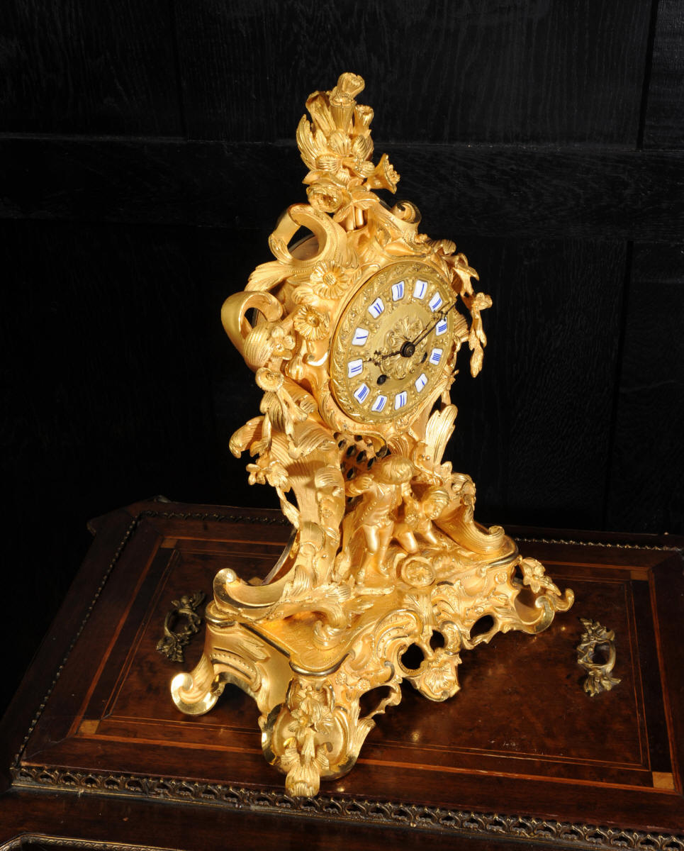 The clock is Rococo in style, decorated profusely with finely modeled foliage and floral swags. It sits upon a heavy integral base on two sweeping 'C' scroll brackets. A niche below the dial houses of scene of two boys tussling over a birds nest. Behind the niche is a fretted panel to allow a glimpse of the pendulum gently swinging behind. The clock is modelled in the round, it would display very nicely in the centre of a room or in front of a mirror. The dial is also ormolu with 12 individual enamel cartouches and blued steel hands. To the bottom of the dial is the Raingo Freres signature. the hand fretted and blued steel hands are original. Please note that this type of clock does not have a glass bezel or a rear door. Unusually, the case is marked with the movement serial number, confirming originality. Zacharie Raingo was apprenticed in Paris in 1790 and went on to establish Raingo Freres in 1813. Initially specialising in precision astronomical clocks and then after 1825 clocks and bronzes. Clients included the Emperor and Empress. The firm exhibited at many of the important exhibitions of the second half of the 19th century and was known for the fine quality of its ormolu. The French movement is by Raingo Freres and is of high quality. It is the early version of the Pendule de Paris movement with silk suspension. It is in excellent clean and running condition having been fully overhauled by our clockmaker. Pendulum is an old replacement. It runs for 8 days and strikes the hours and halves on a bell. Click the video clip below to hear the bell and watch the clock running! Condition of the case is excellent, the original gilding is superb, clean and bright with hardly any wear or discolouration and there are no losses. The dial is also in excellent condition with no damage. A superb early clock in exceptional condition to add to your collection.