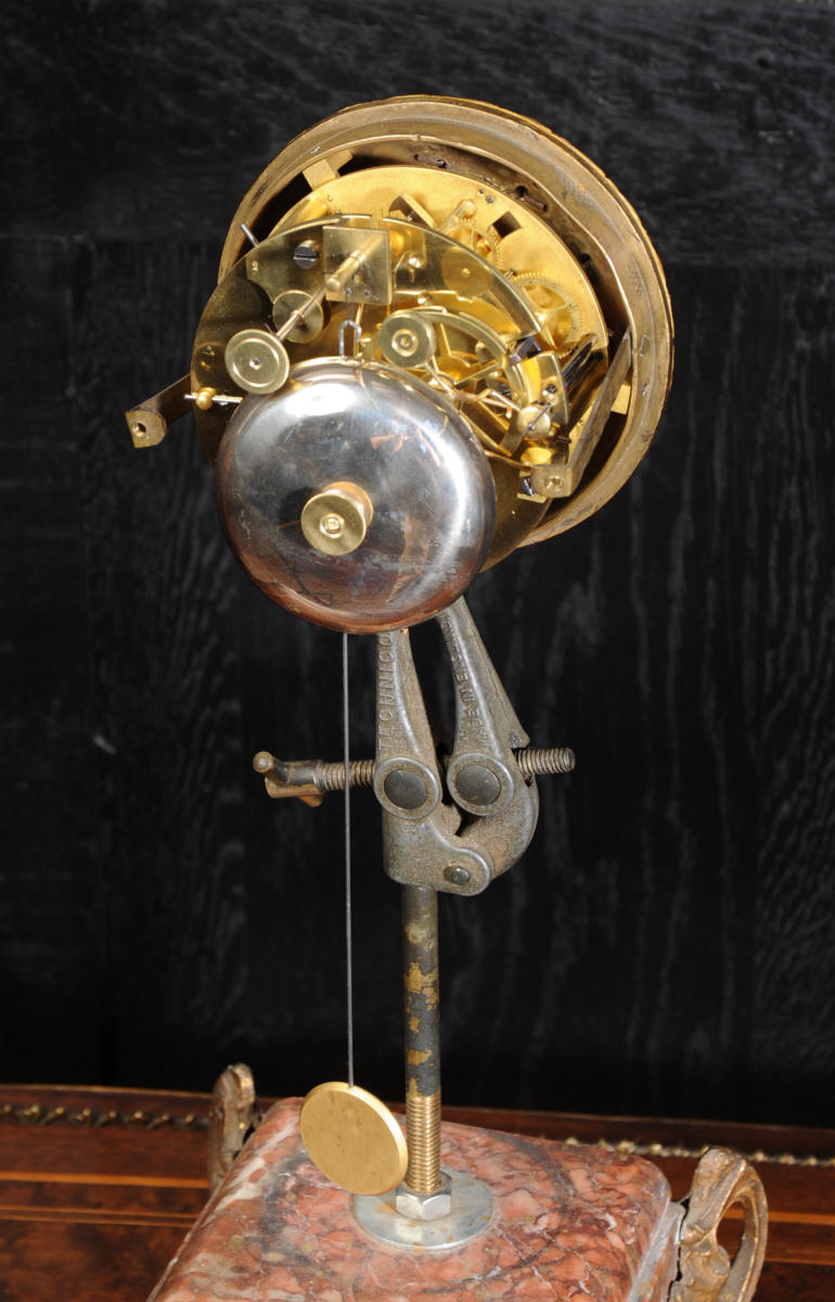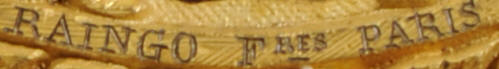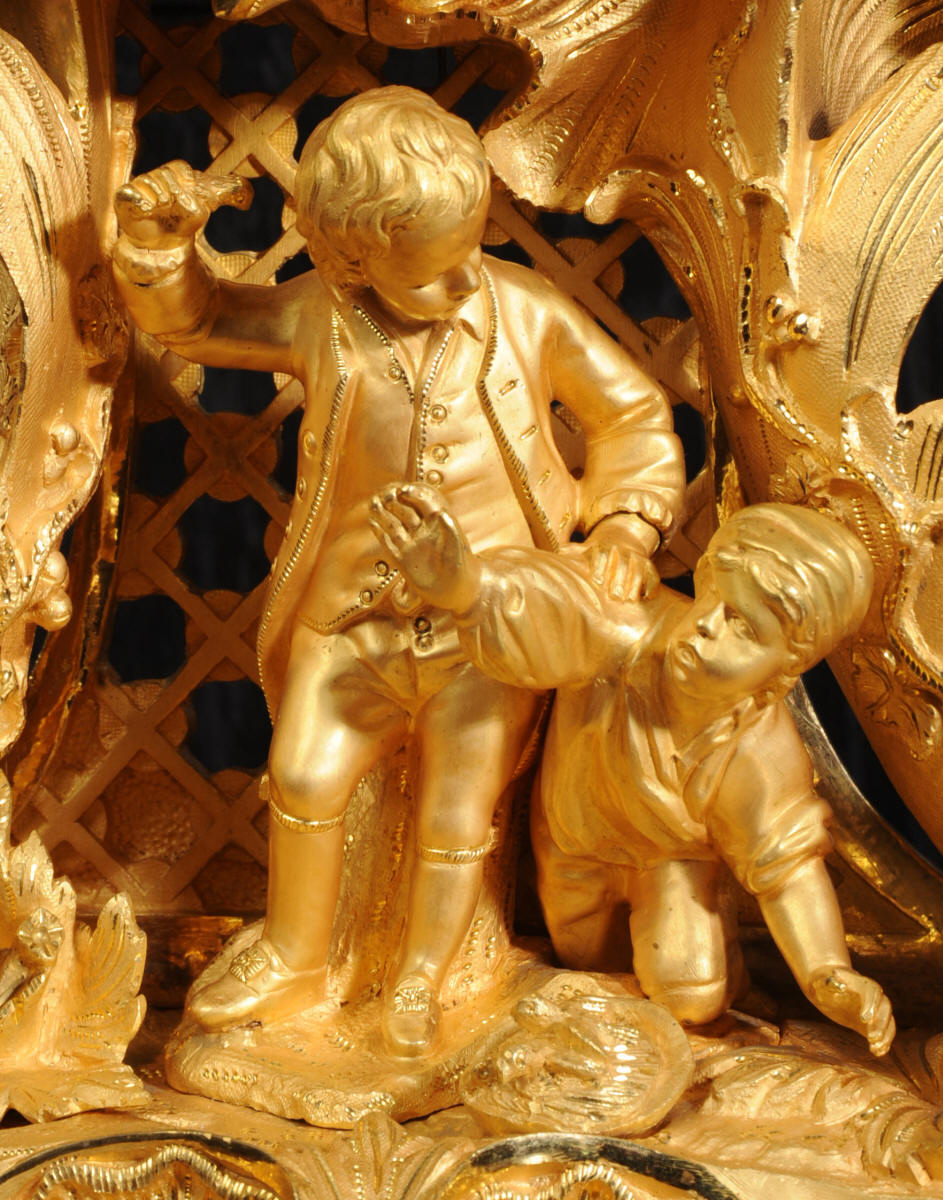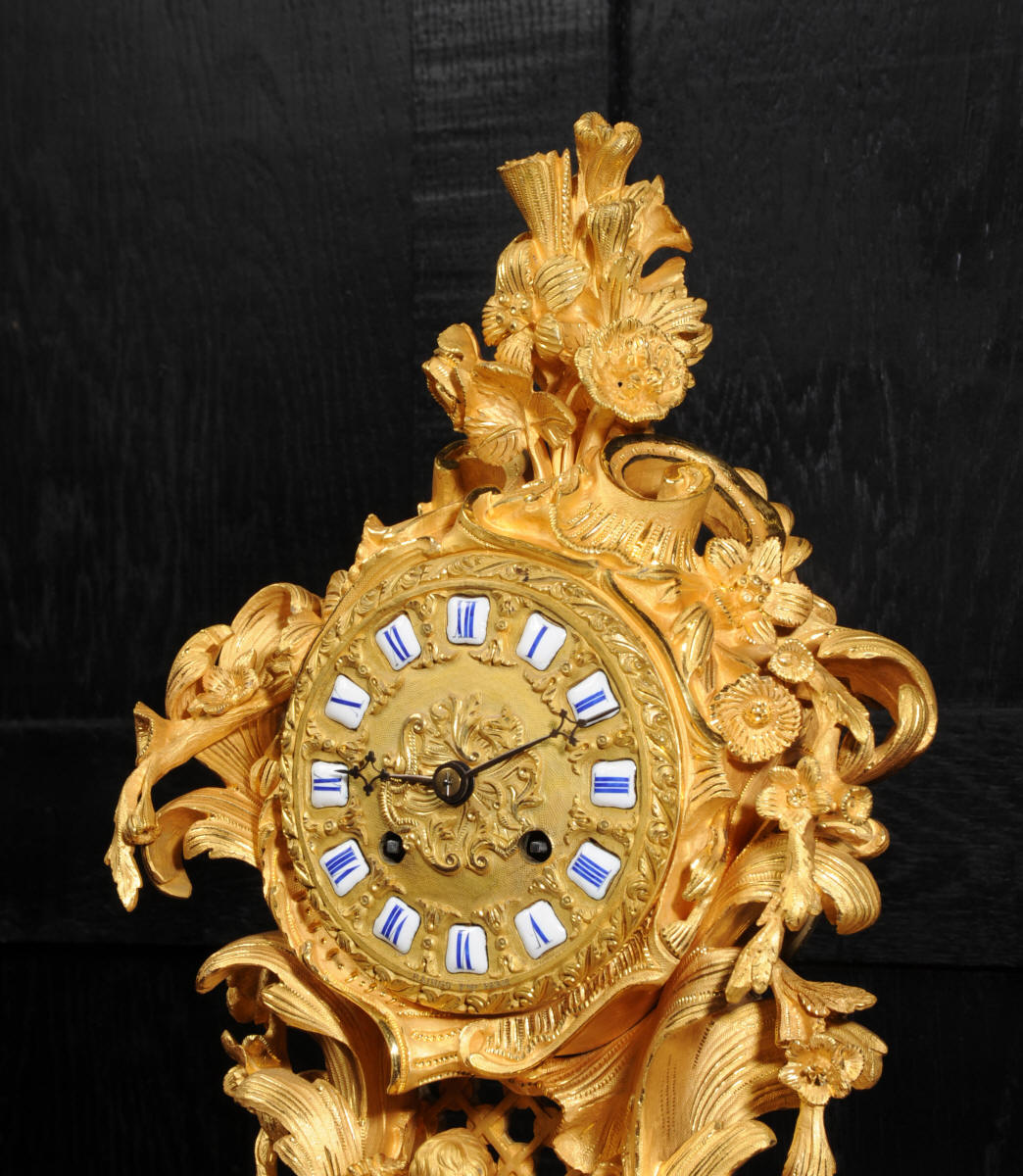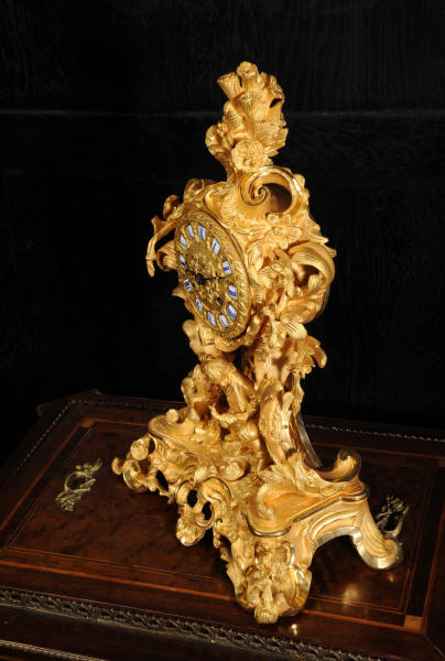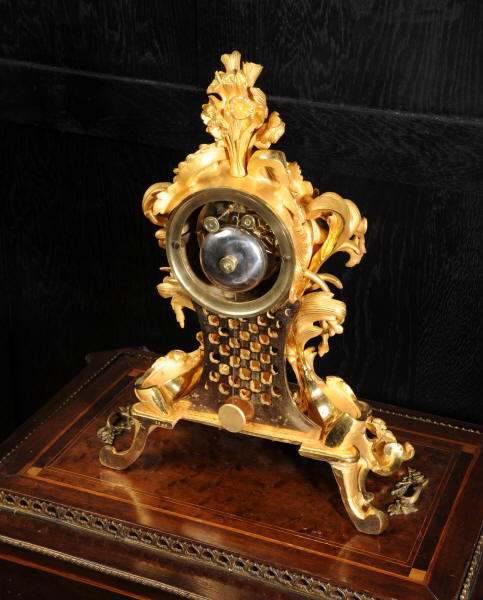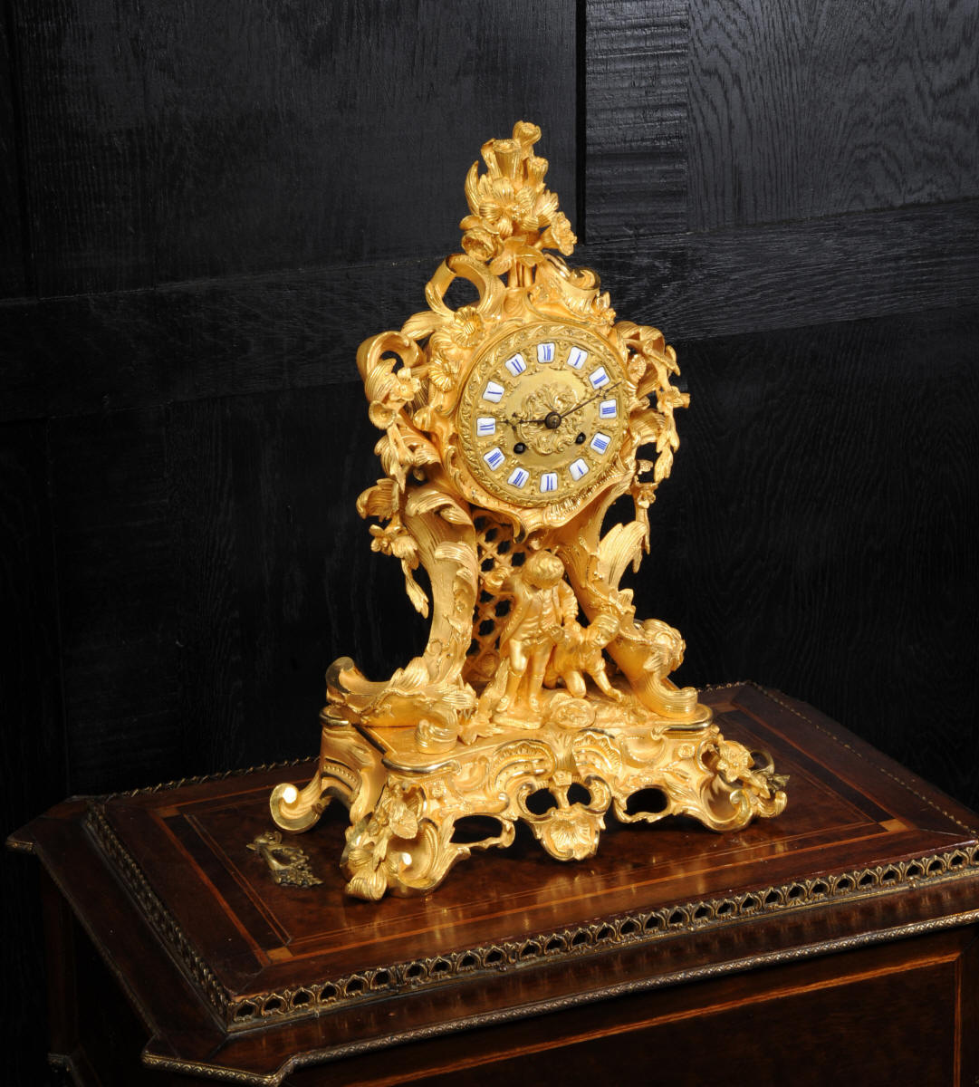 The clock is Rococo in style, decorated profusely with finely modeled foliage and floral swags. It sits upon a heavy integral base on two sweeping 'C' scroll brackets. A niche below the dial houses of scene of two boys tussling over a birds nest. Behind the niche is a fretted panel to allow a glimpse of the pendulum gently swinging behind. The clock is modelled in the round, it would display very nicely in the centre of a room or in front of a mirror. The dial is also ormolu with 12 individual enamel cartouches and blued steel hands. To the bottom of the dial is the Raingo Freres signature. the hand fretted and blued steel hands are original. Please note that this type of clock does not have a glass bezel or a rear door. Unusually, the case is marked with the movement serial number, confirming originality. Zacharie Raingo was apprenticed in Paris in 1790 and went on to establish Raingo Freres in 1813. Initially specialising in precision astronomical clocks and then after 1825 clocks and bronzes. Clients included the Emperor and Empress. The firm exhibited at many of the important exhibitions of the second half of the 19th century and was known for the fine quality of its ormolu. The French movement is by Raingo Freres and is of high quality. It is the early version of the Pendule de Paris movement with silk suspension. It is in excellent clean and running condition having been fully overhauled by our clockmaker. Pendulum is an old replacement. It runs for 8 days and strikes the hours and halves on a bell. Click the video clip below to hear the bell and watch the clock running! Condition of the case is excellent, the original gilding is superb, clean and bright with hardly any wear or discolouration and there are no losses. The dial is also in excellent condition with no damage. A superb early clock in exceptional condition to add to your collection.