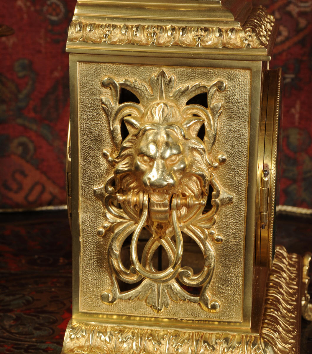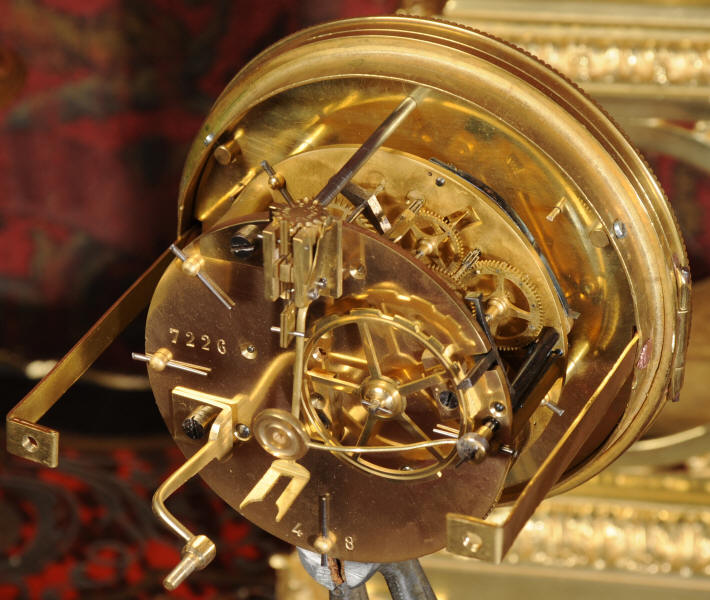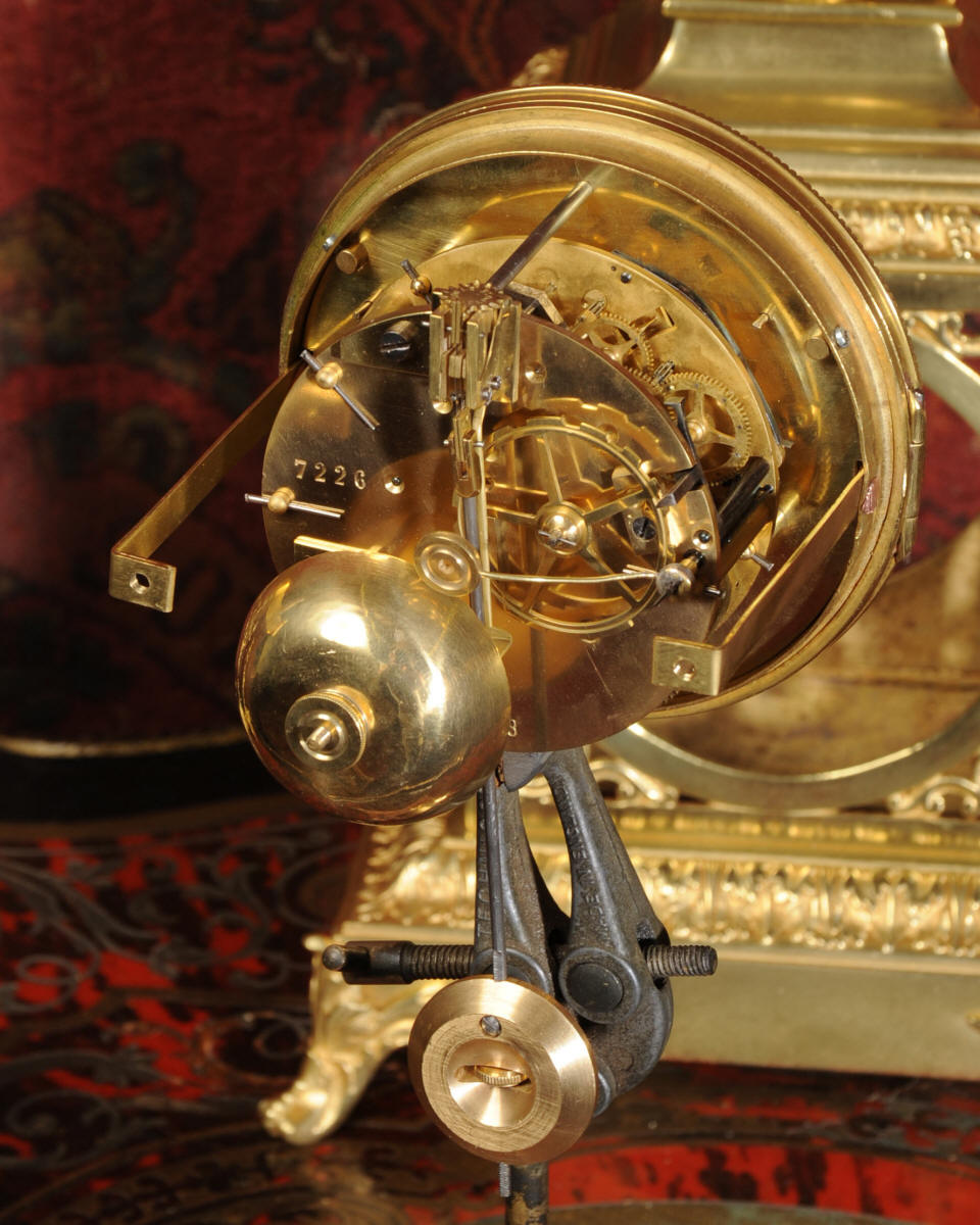 The French movement is of high quality and is in excellent clean and running condition having been fully overhauled by our clockmaker. Pendulum is a replacement. It runs for 8 days and strikes the hours and halves on a bell. Click the video clip below to hear the bell and watch the clock running!