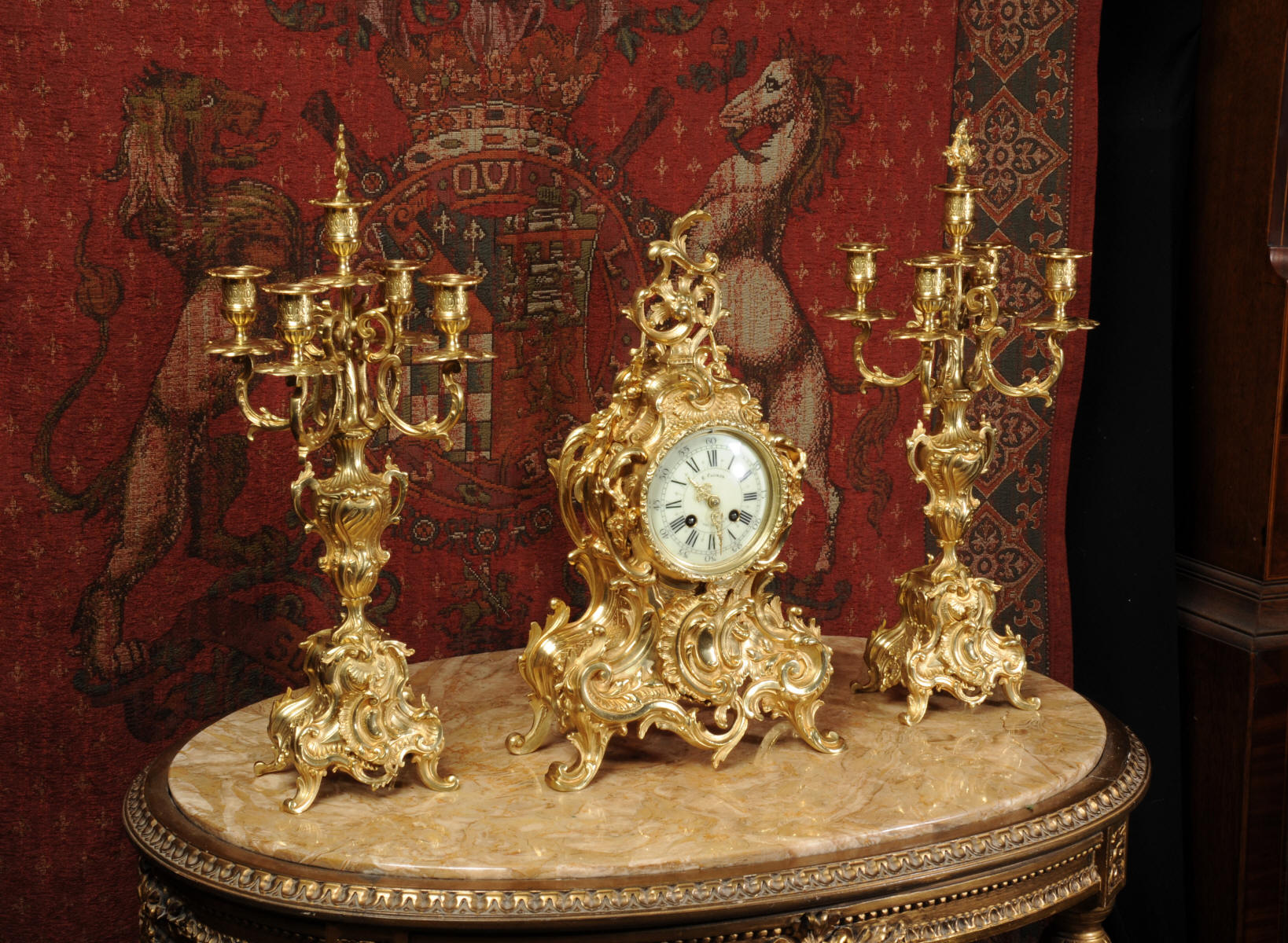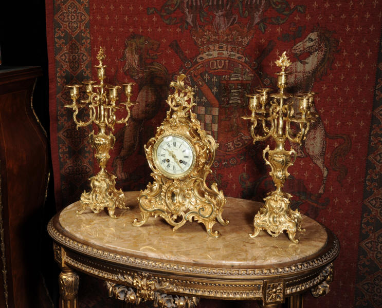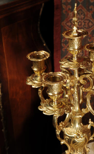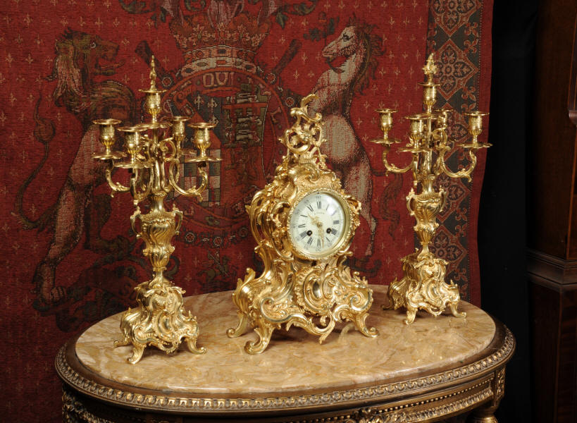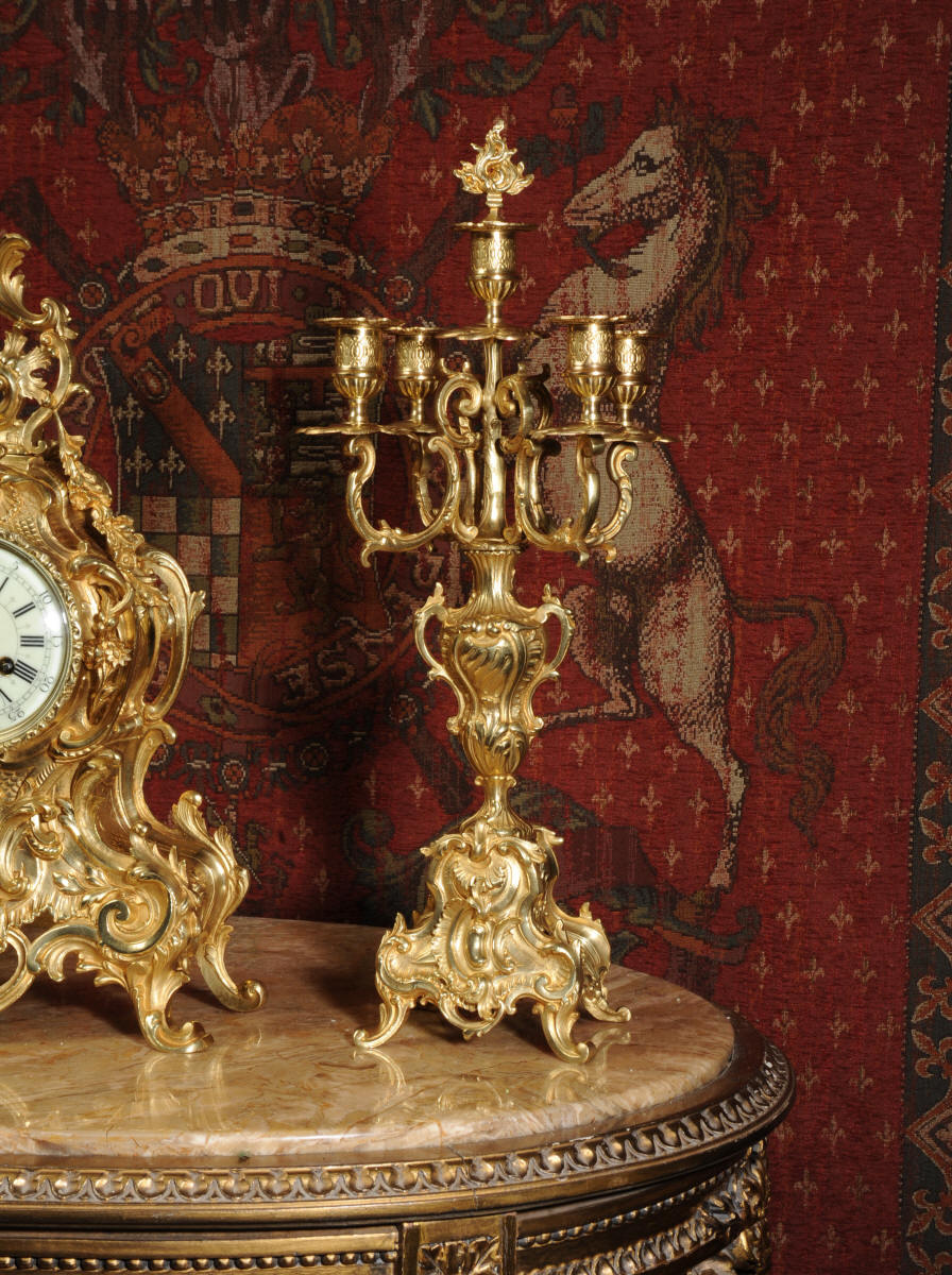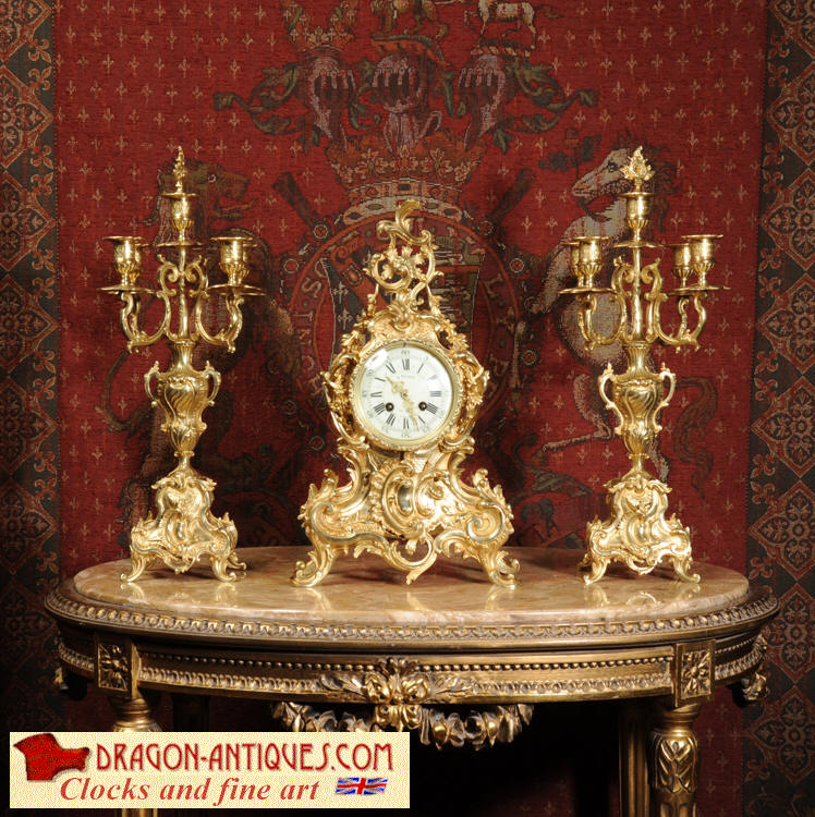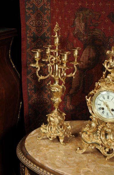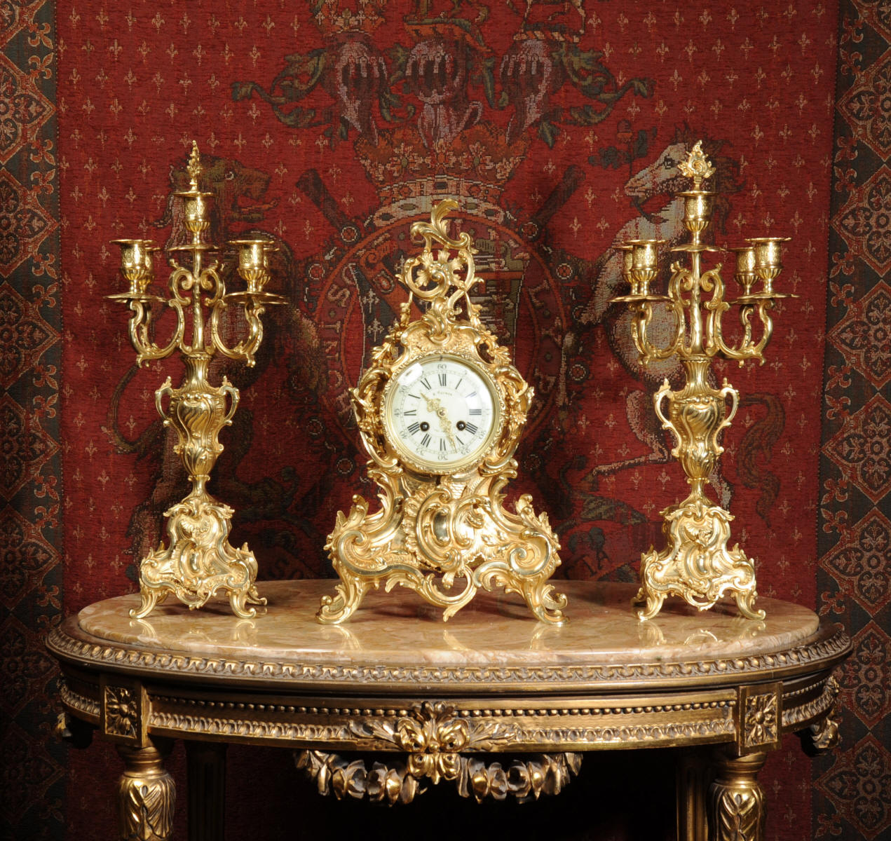 Condition of the case is excellent, the original gilding is beautifully clean and bright with hardly any wear or discolouration and there are no losses. The dial is also in excellent condition with no damage. Candelabra are slightly distorted. The original glass has some faint bubbles from new and a slight chip to the edge. The set makes a stunning display as you can see below.