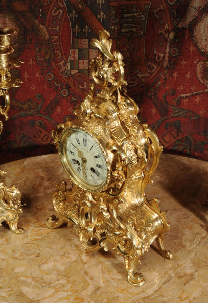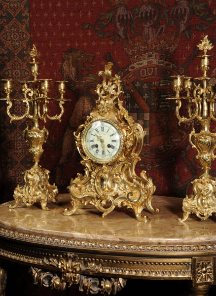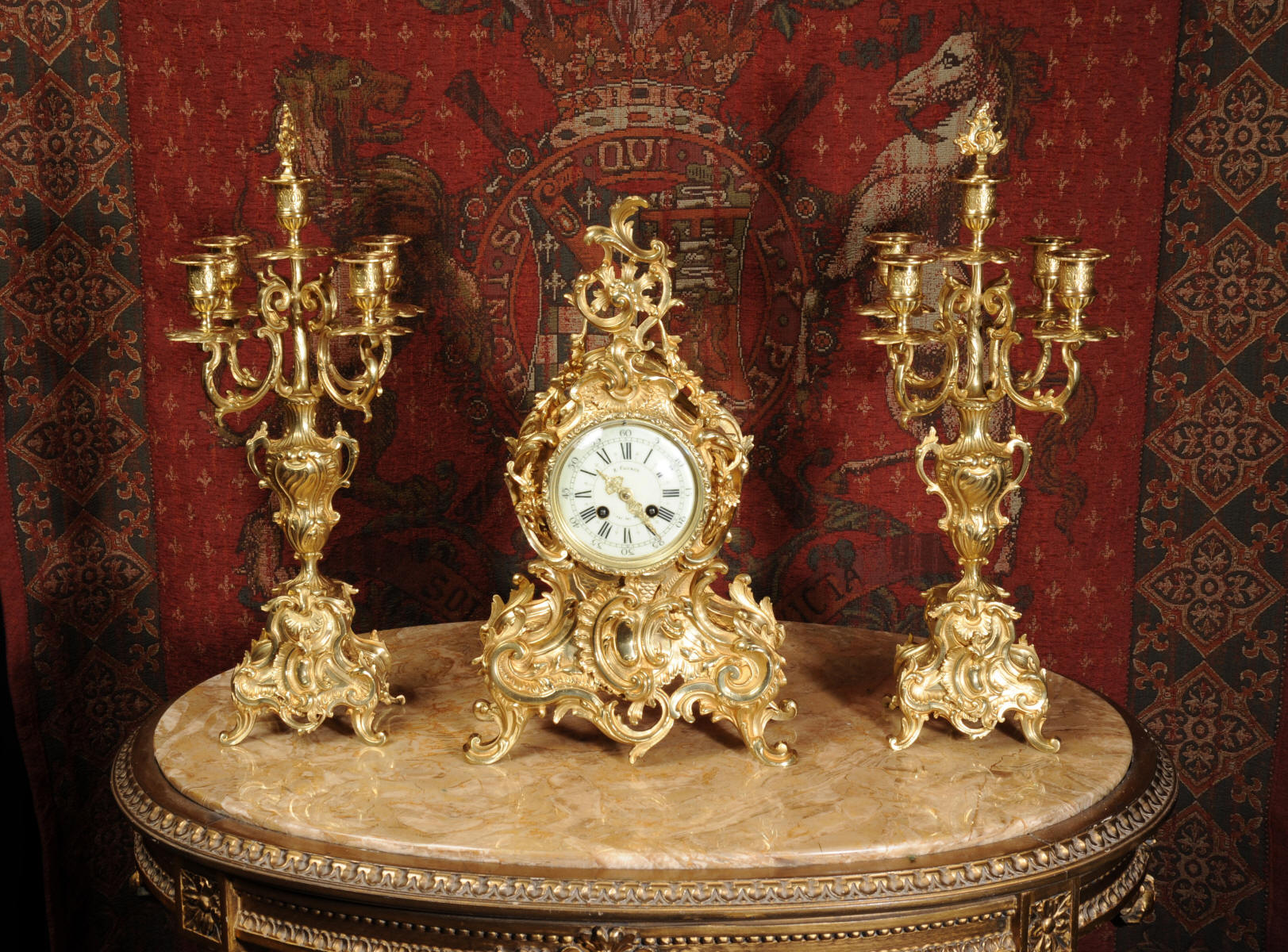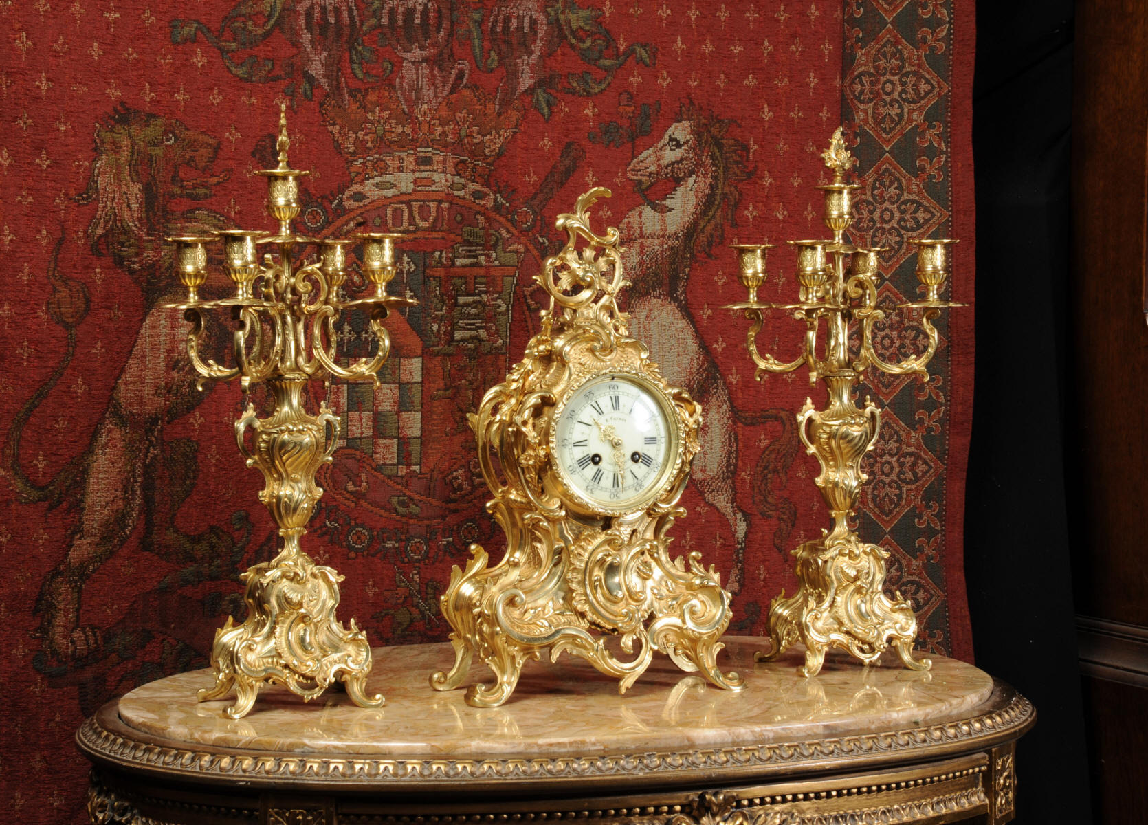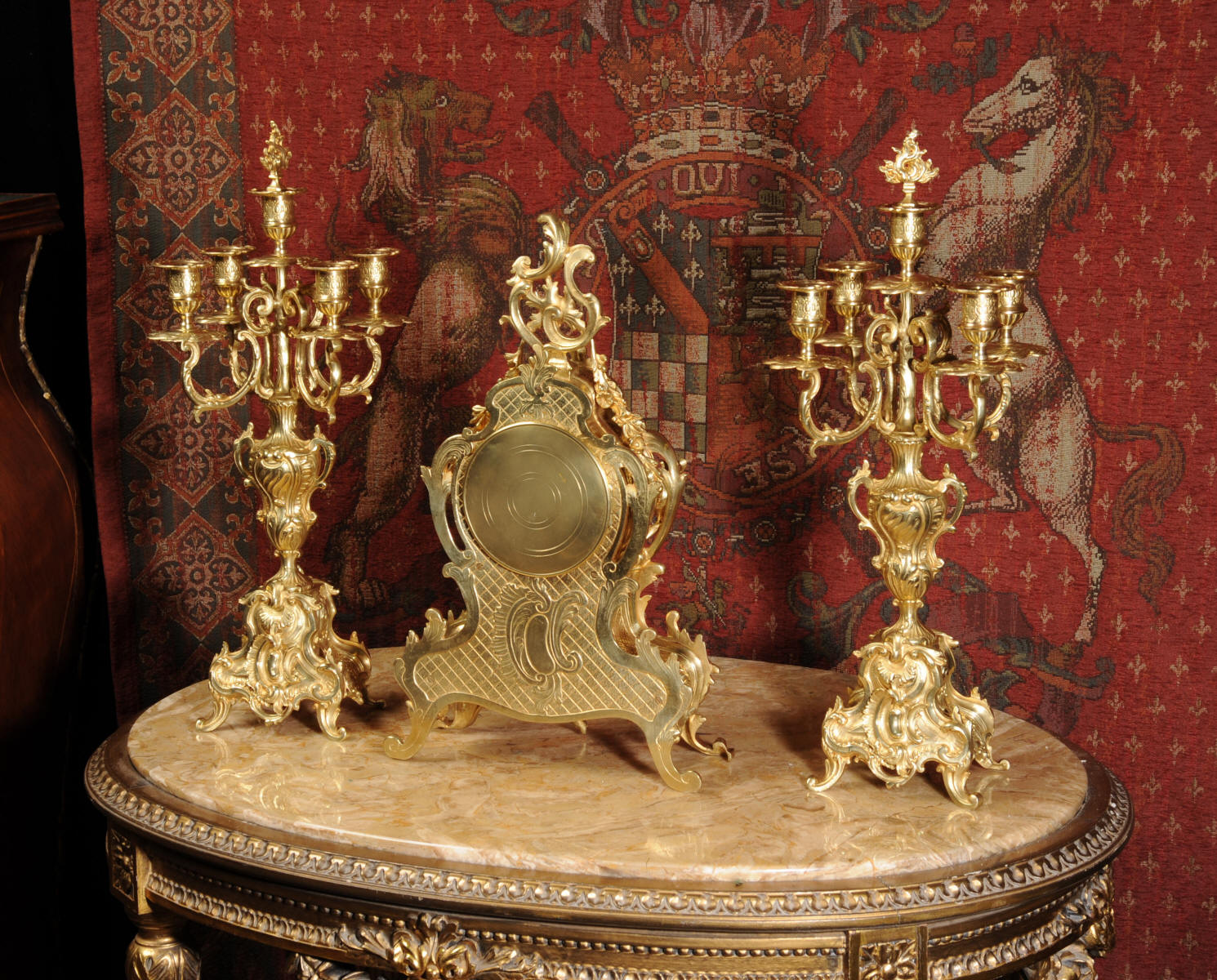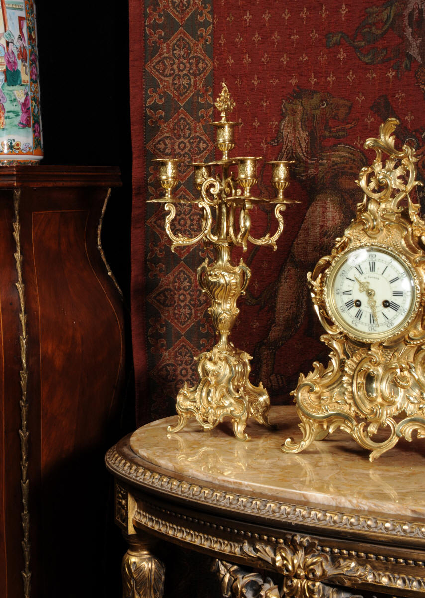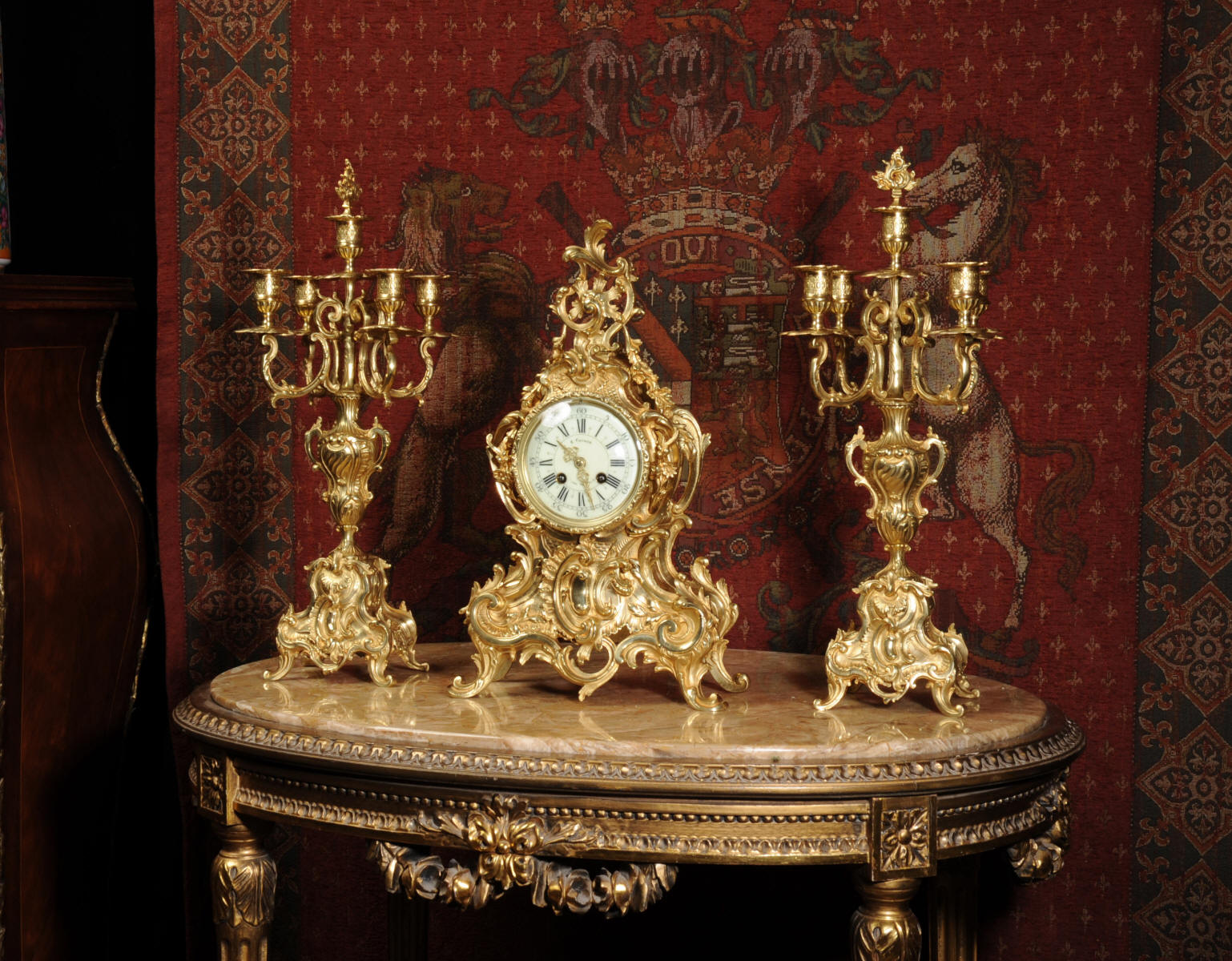 Condition of the case is excellent, the original gilding is beautifully clean and bright with hardly any wear or discolouration and there are no losses. The dial is also in excellent condition with no damage. Candelabra are slightly distorted. The original glass has some faint bubbles from new and a slight chip to the edge. The set makes a stunning display as you can see below.