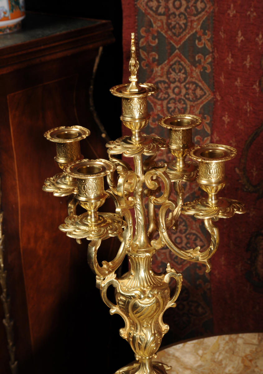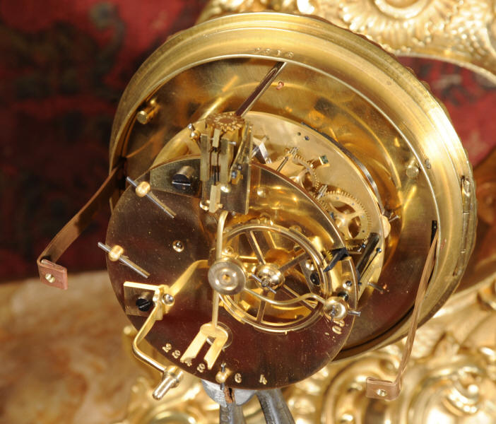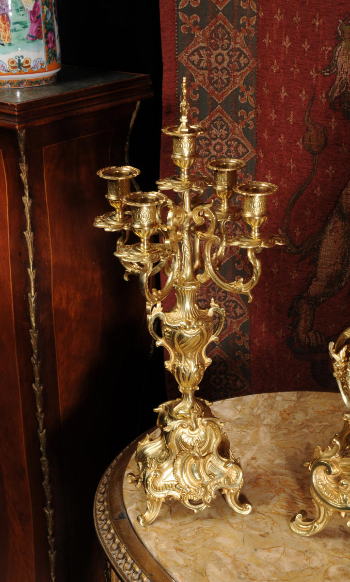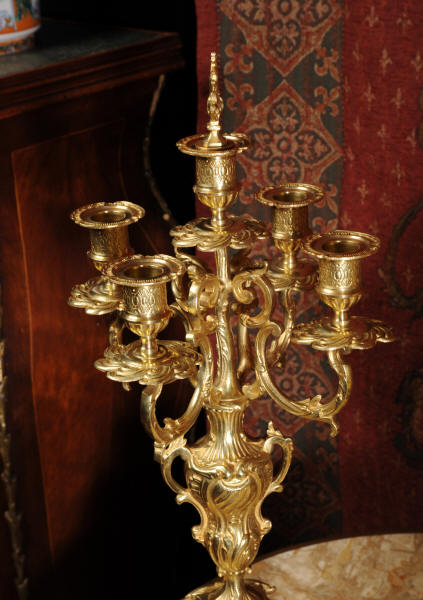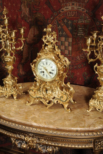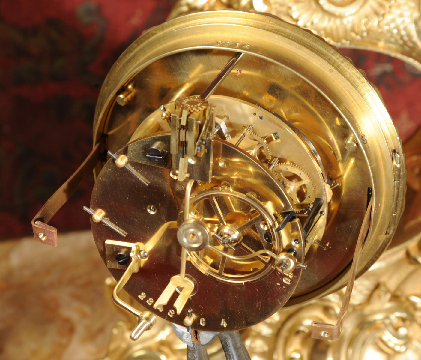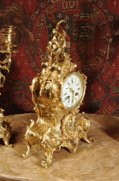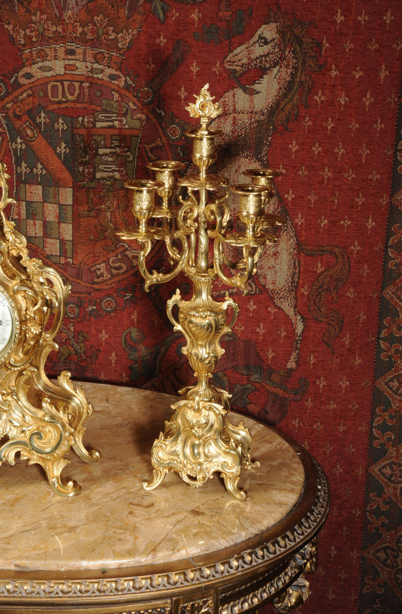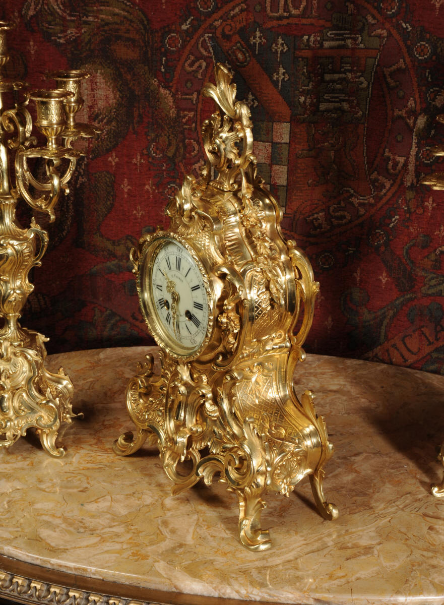 Condition of the case is excellent, the original gilding is beautifully clean and bright with hardly any wear or discolouration and there are no losses. The dial is also in excellent condition with no damage. Candelabra are slightly distorted. The original glass has some faint bubbles from new and a slight chip to the edge. The set makes a stunning display as you can see below.