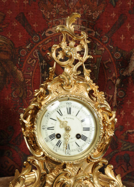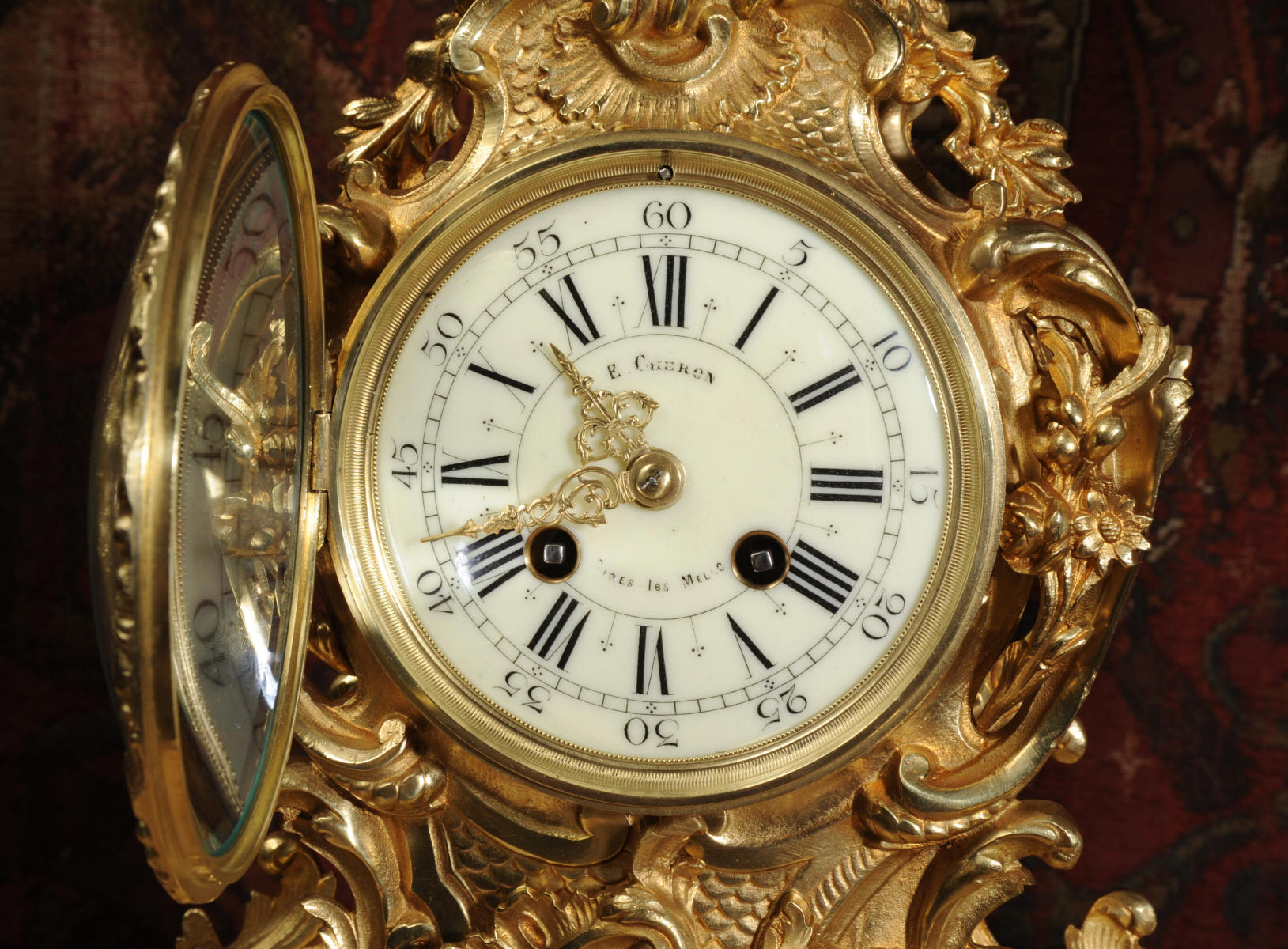 The stunning large dial is cream enamel on copper with a separate outside minute ring. It is complete with it's original finely fretted gilt brass hands and convex glazed Rococo bezel. The dial is signed to the centre by the retailer E. Chéron.