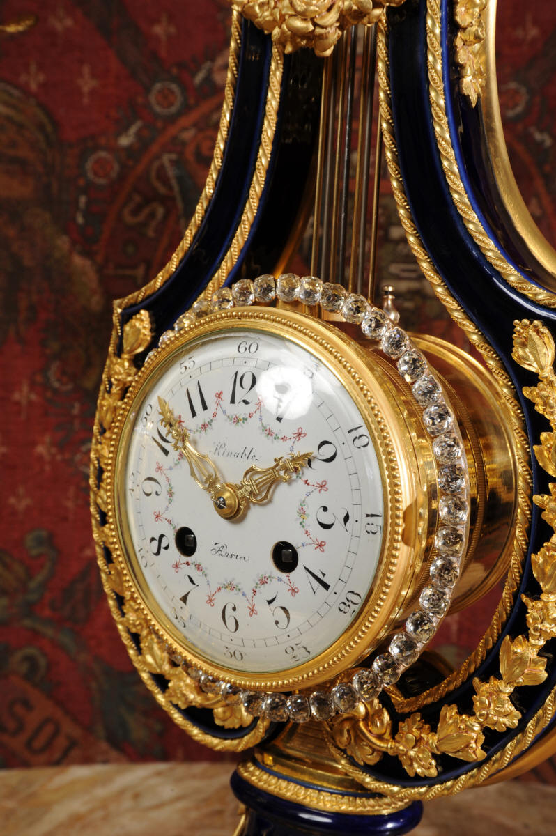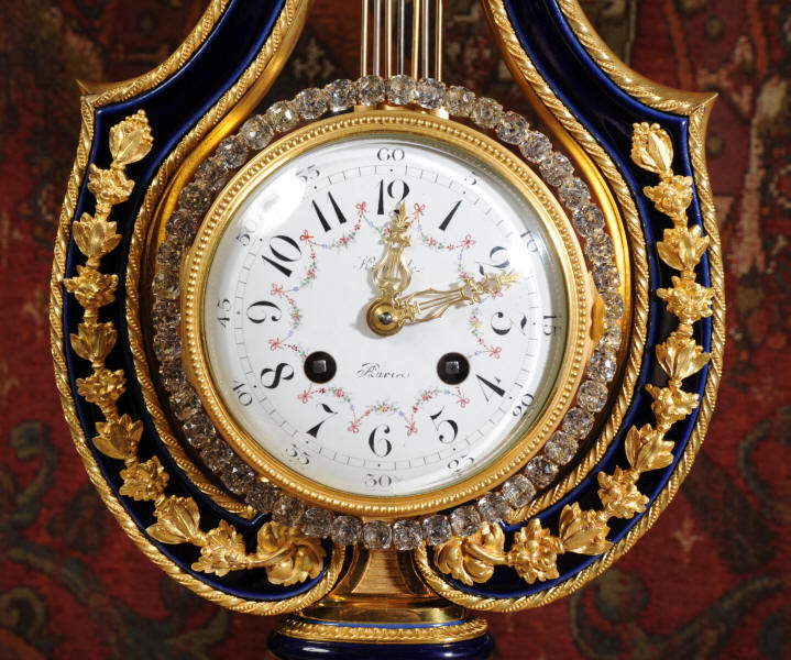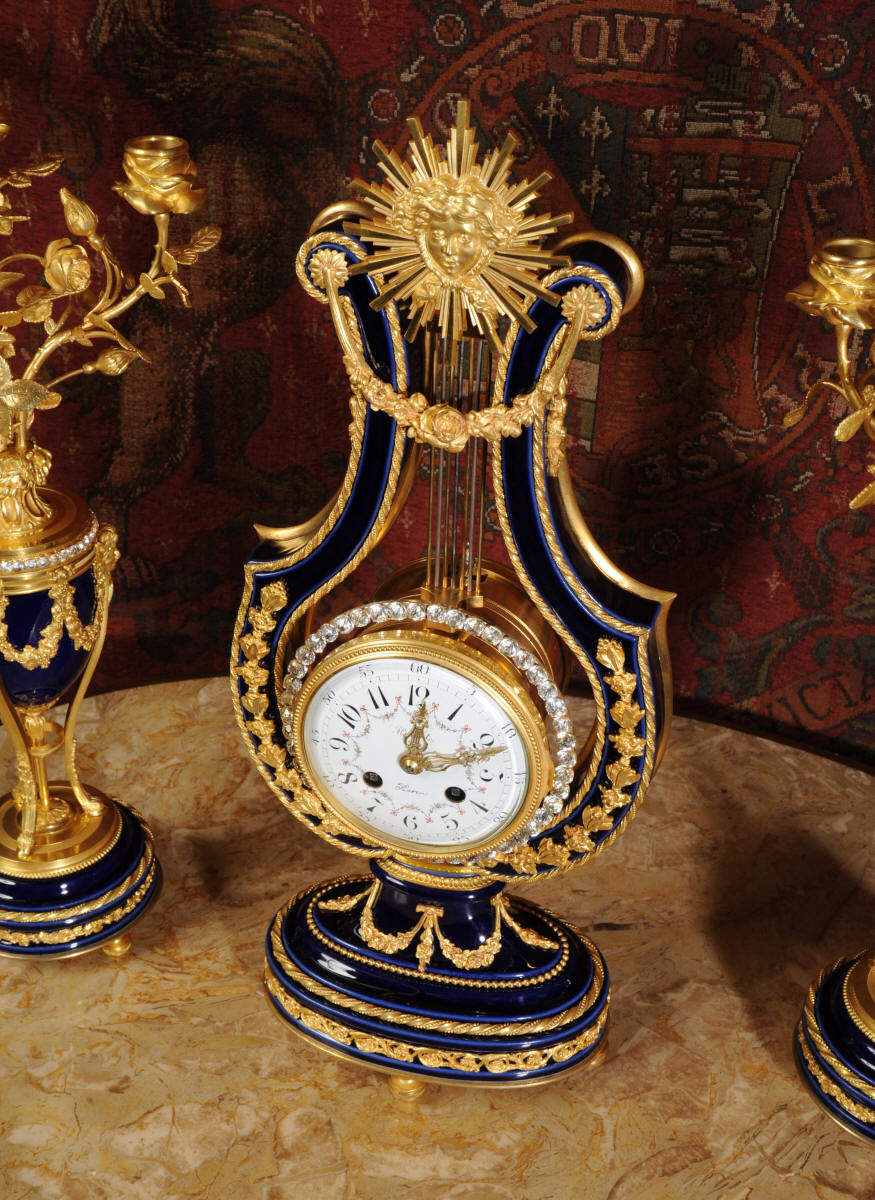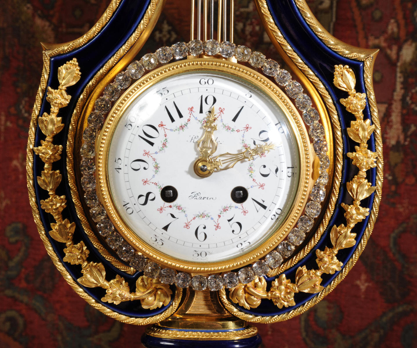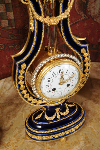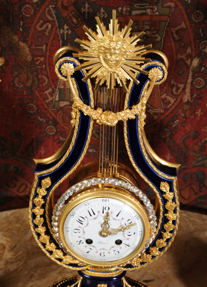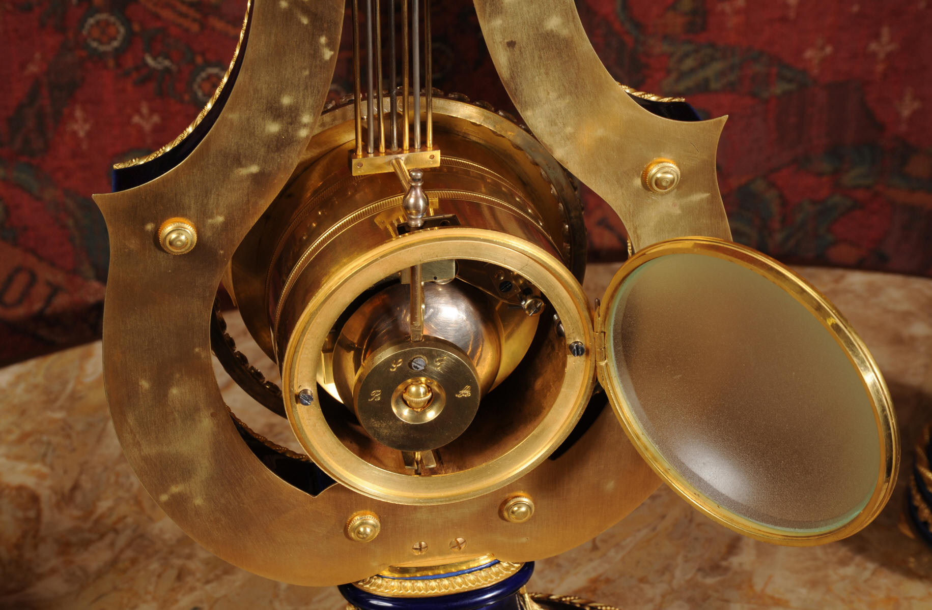 Beau Bleu Porcelain and Ormolu Lyre Clock with Mystery Pendulum