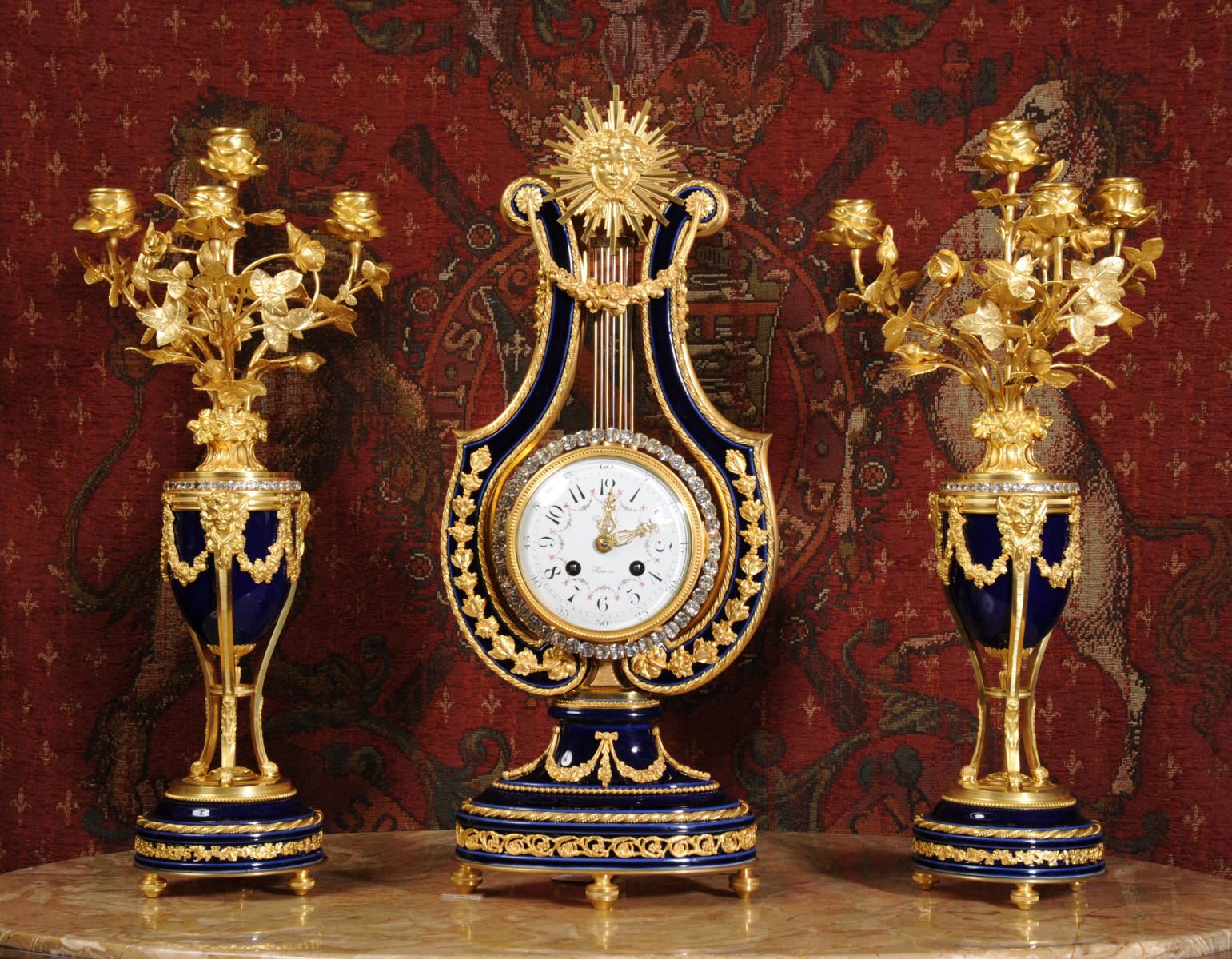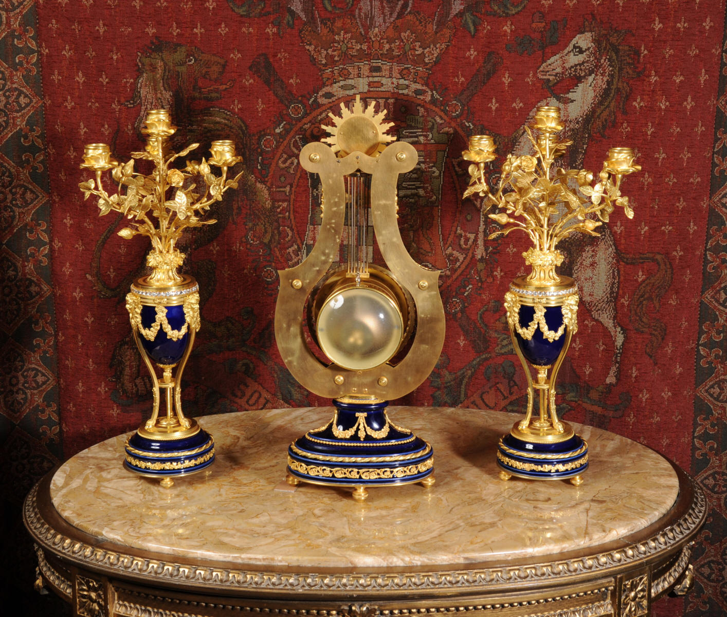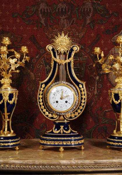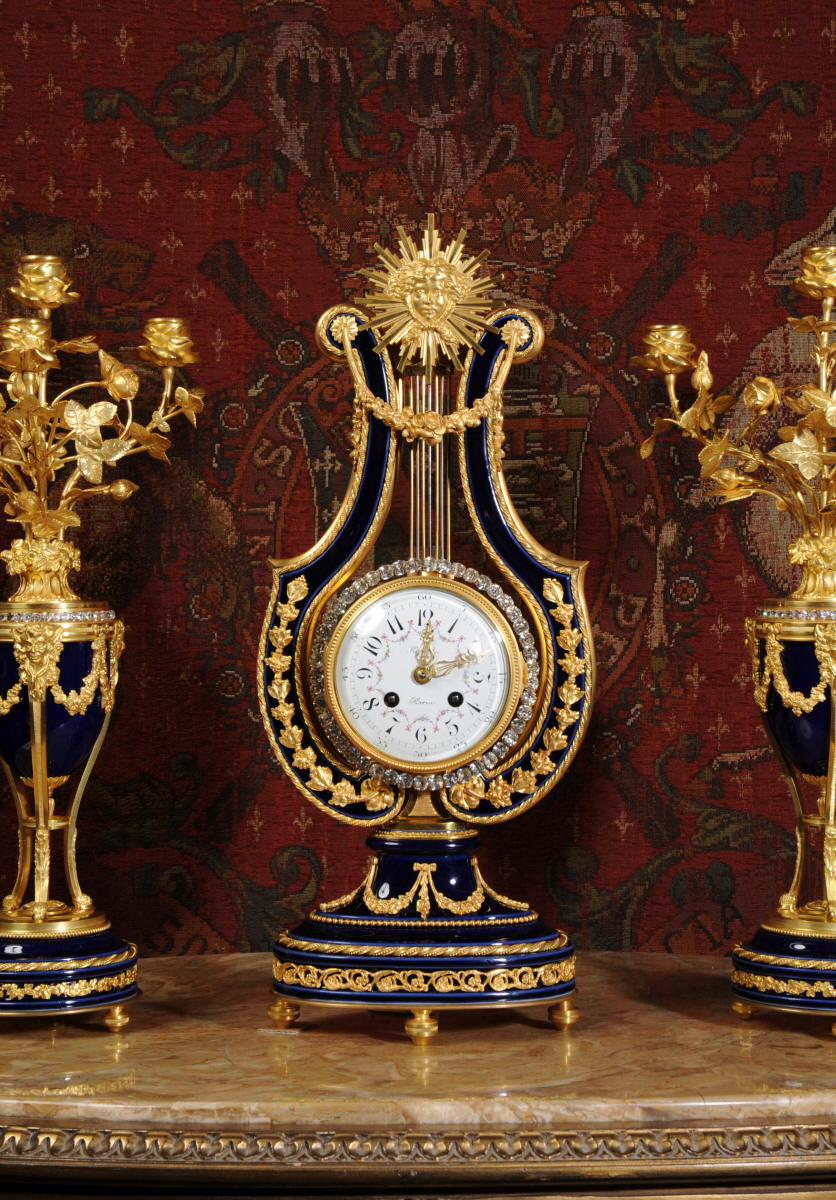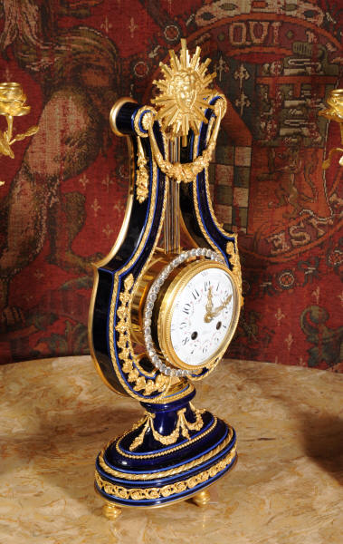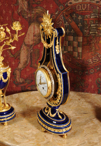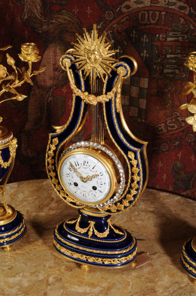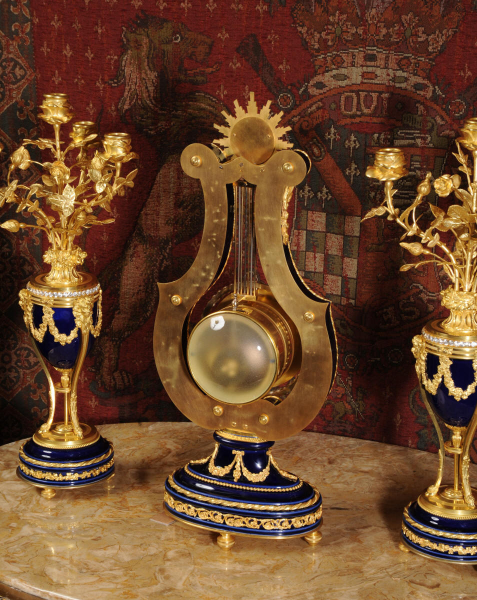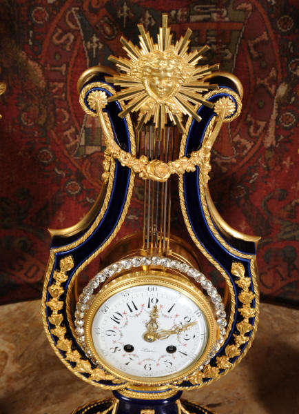 Beau Bleu Porcelain and Ormolu Lyre Clock with Mystery Pendulum