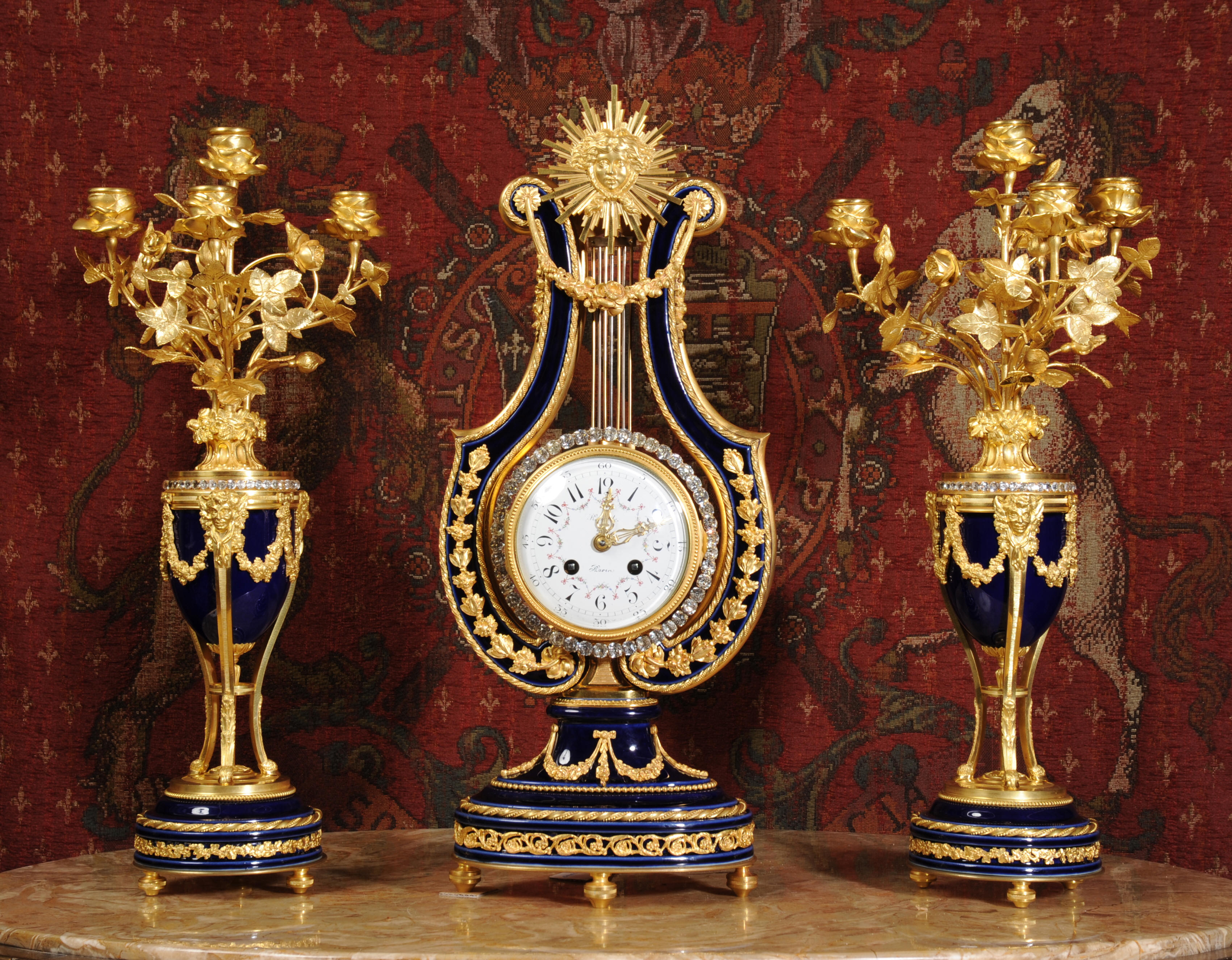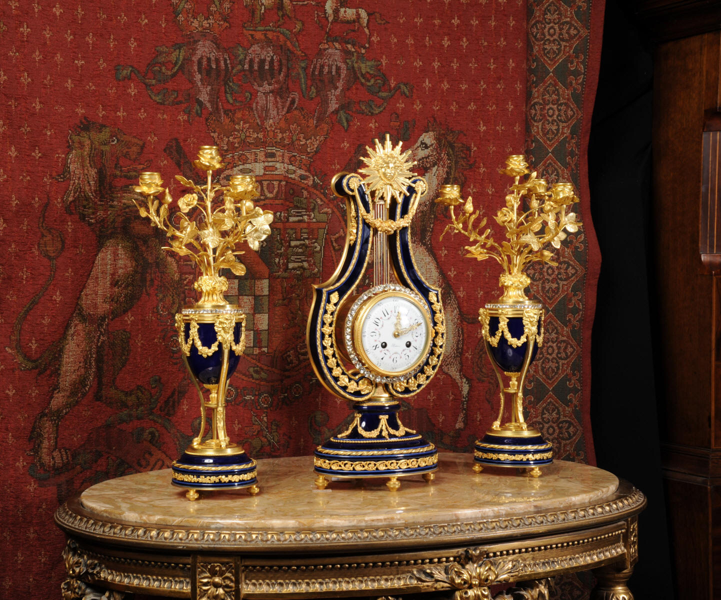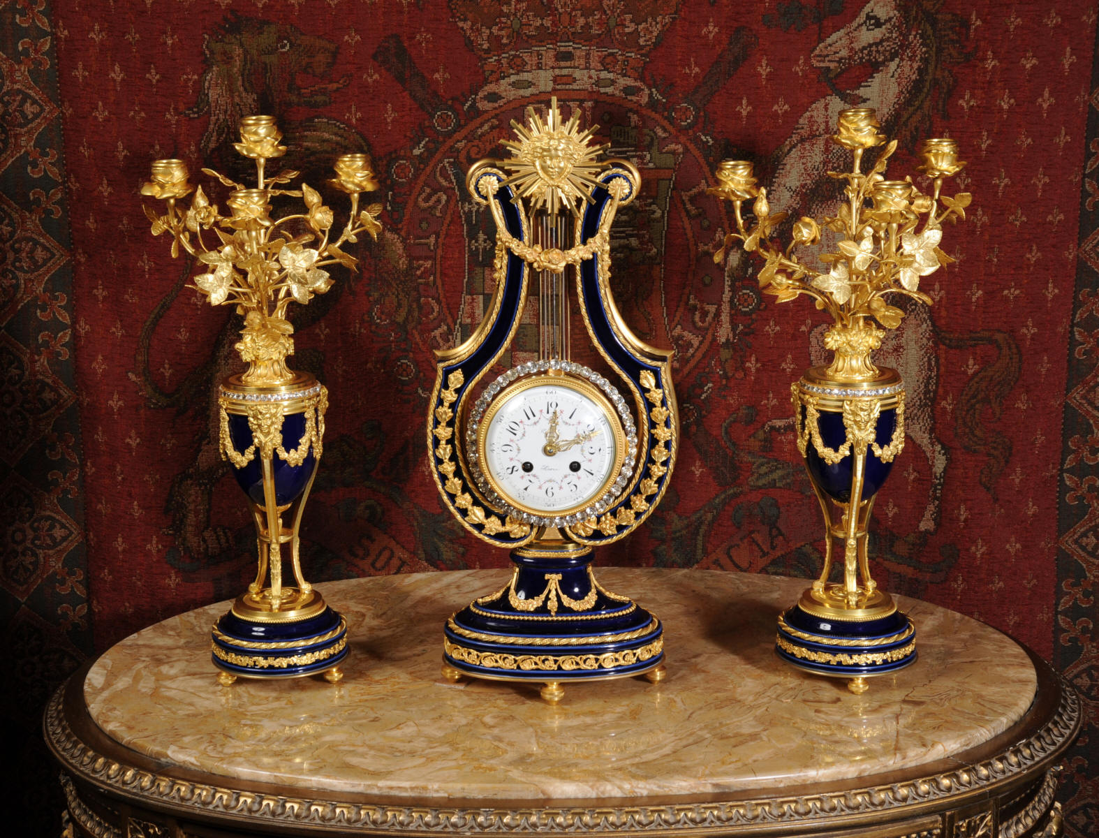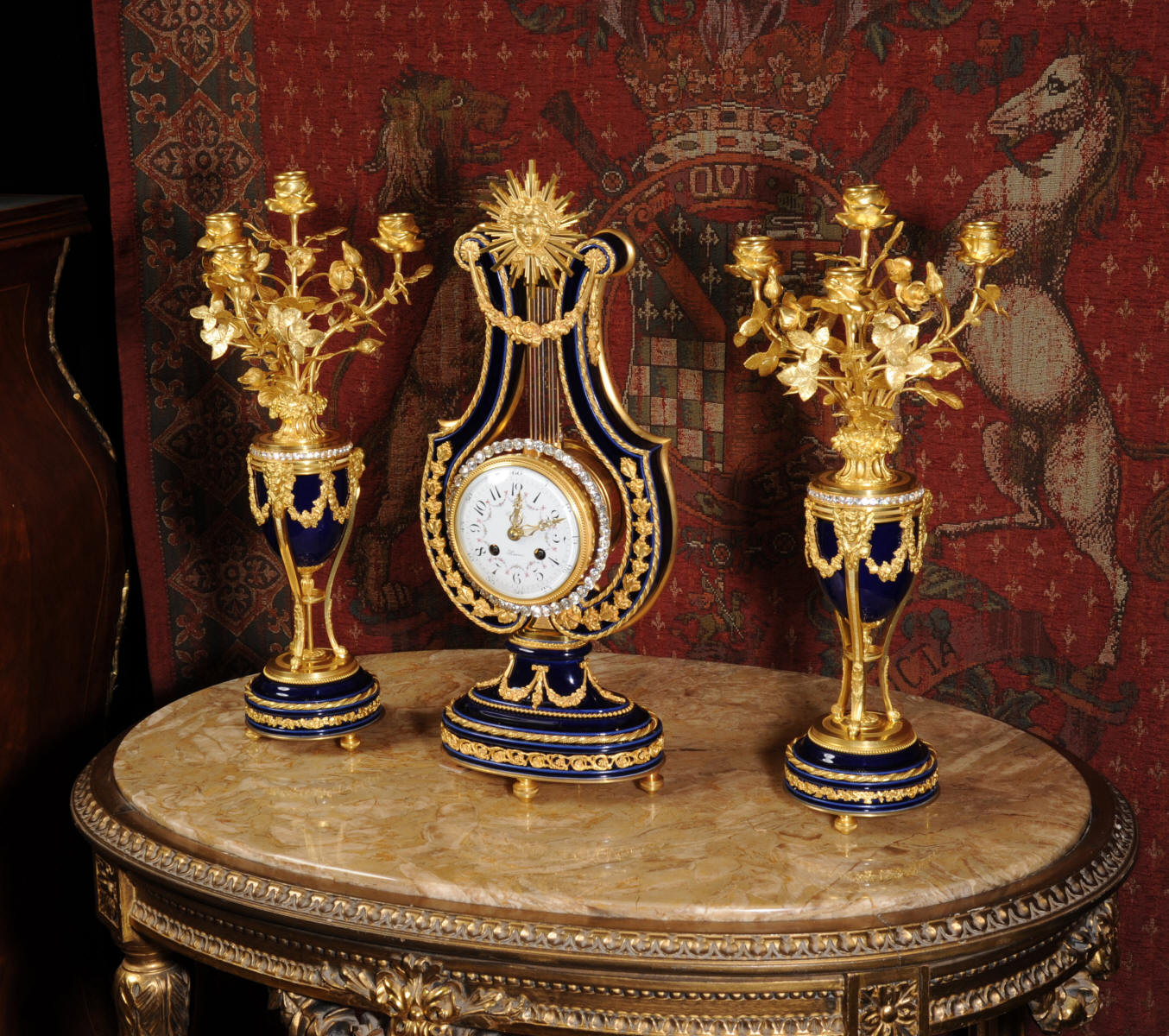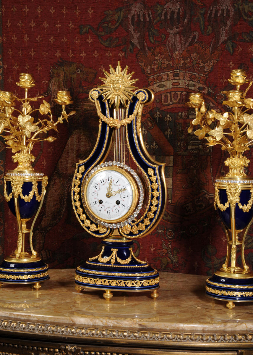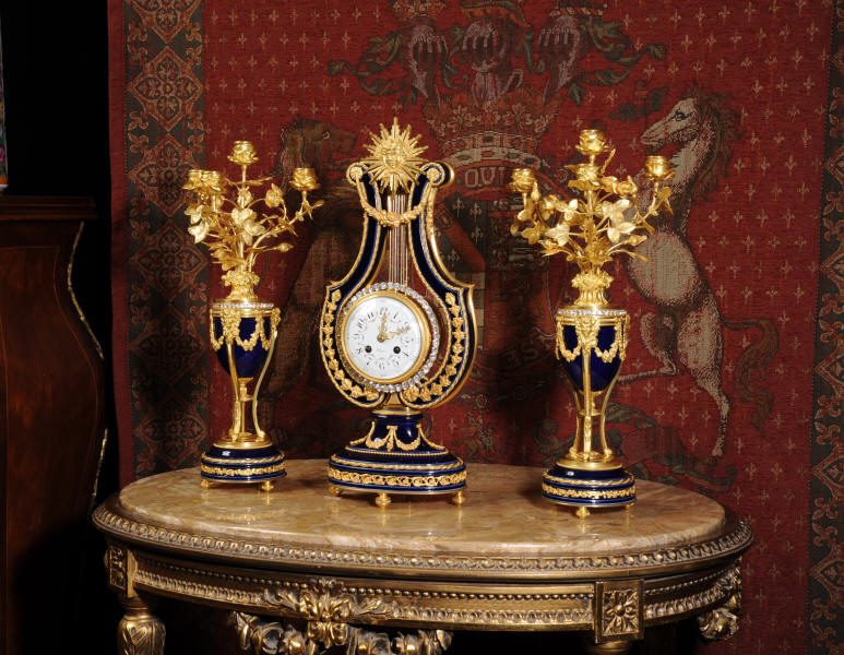 Beau Bleu Porcelain and Ormolu Lyre Clock with Mystery Pendulum