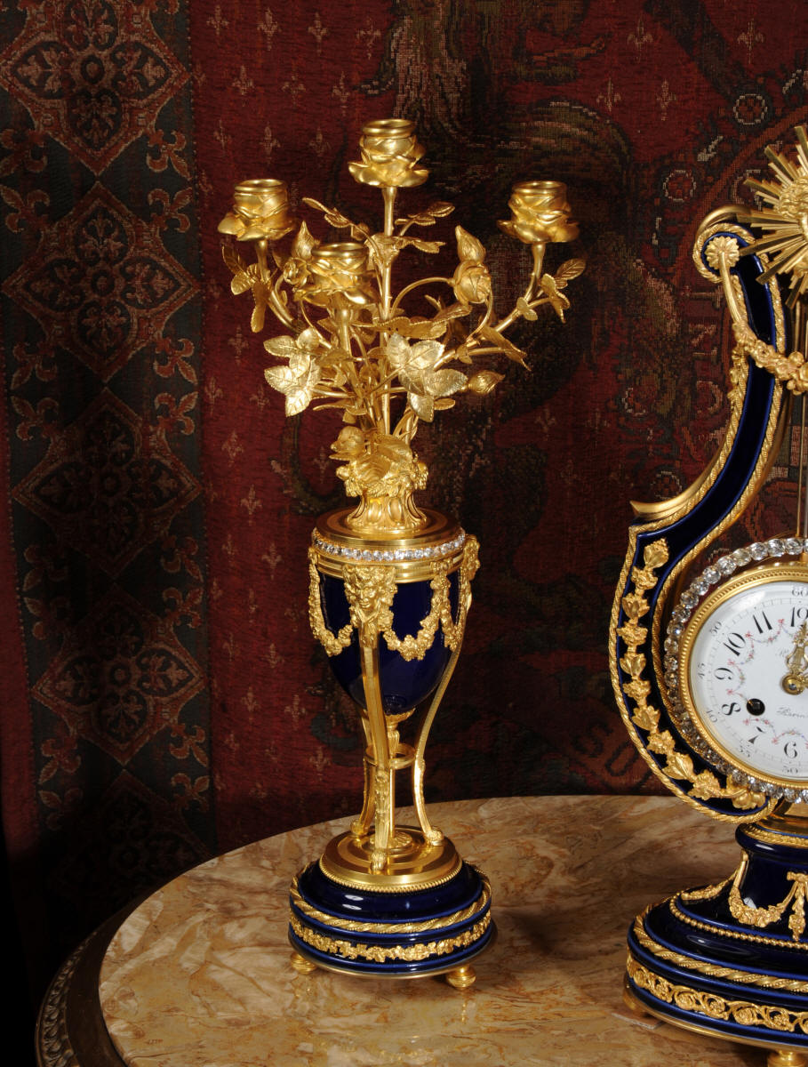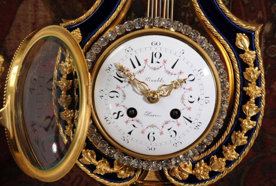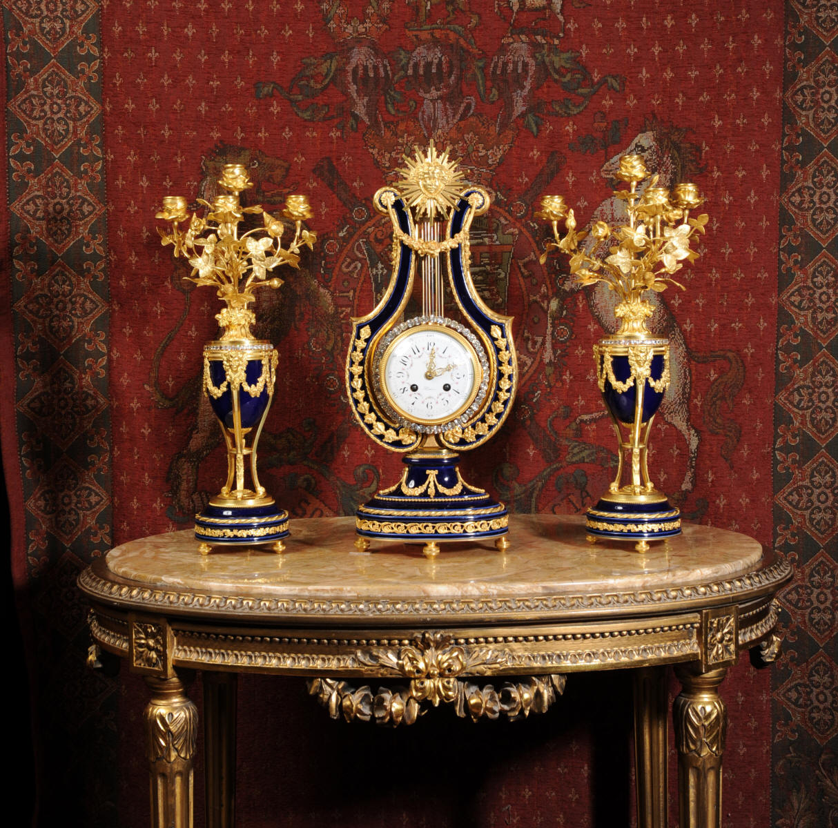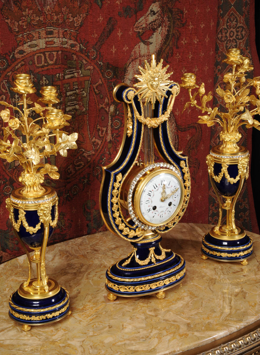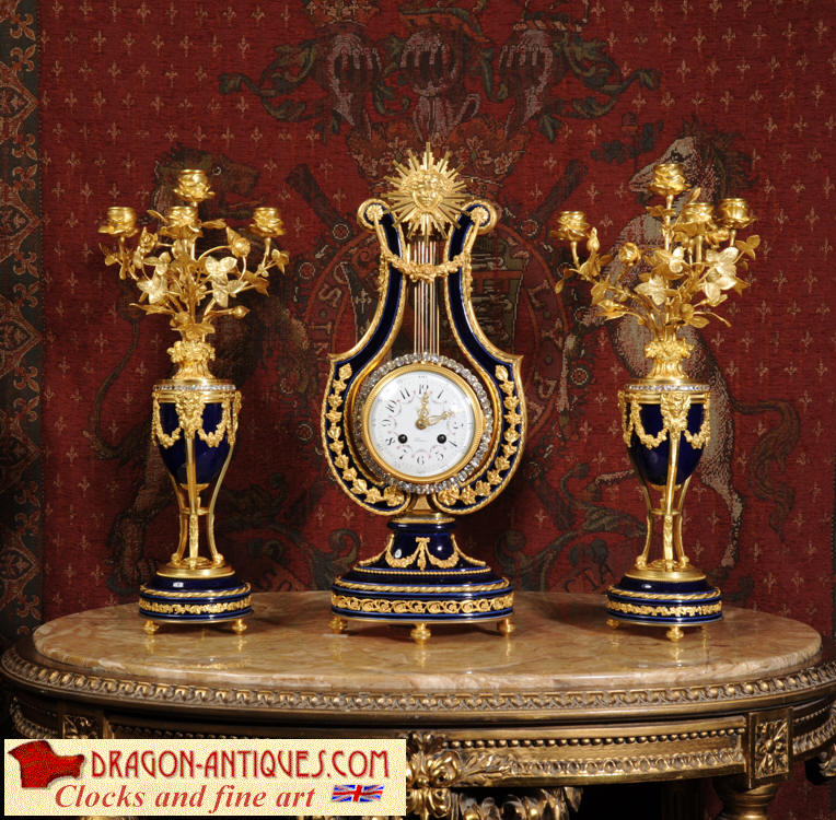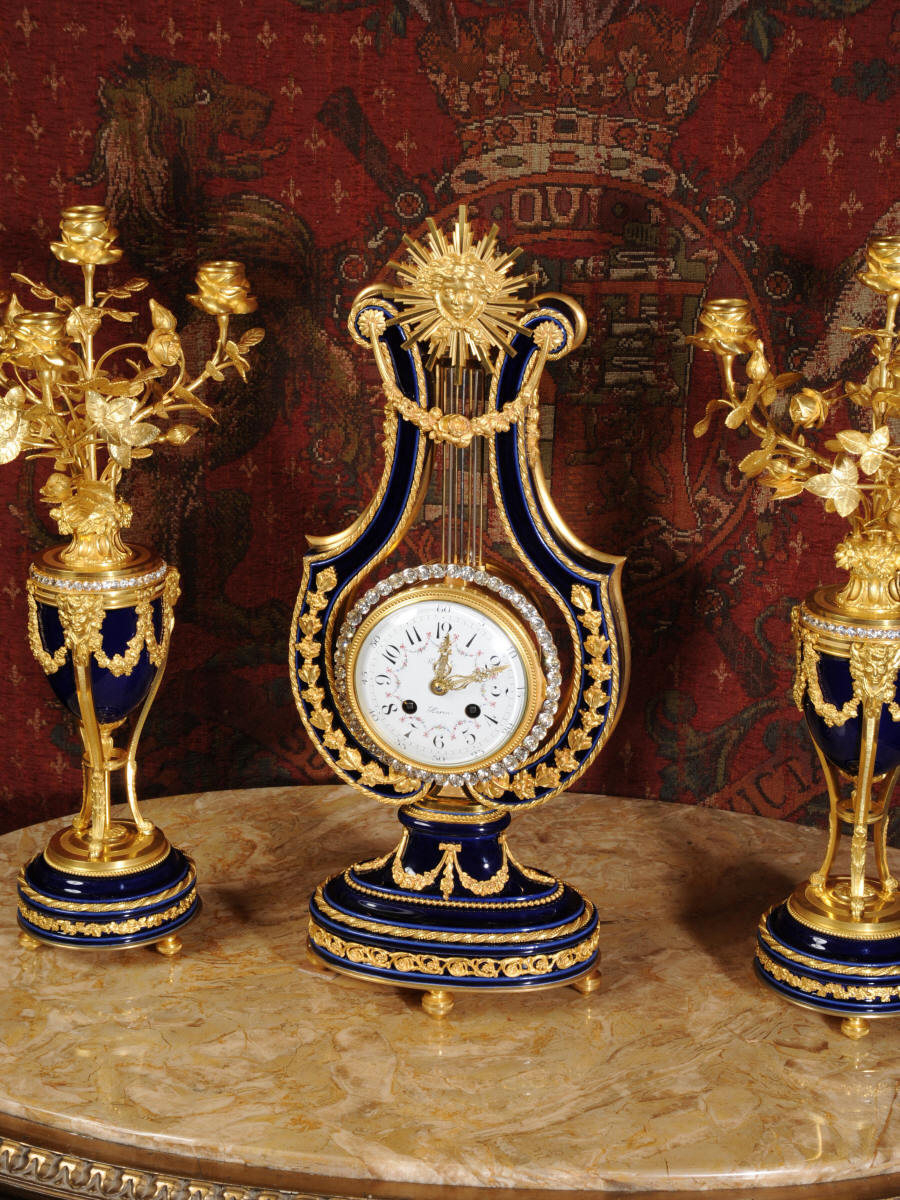 Beau Bleu Porcelain and Ormolu Lyre Clock with Mystery Pendulum