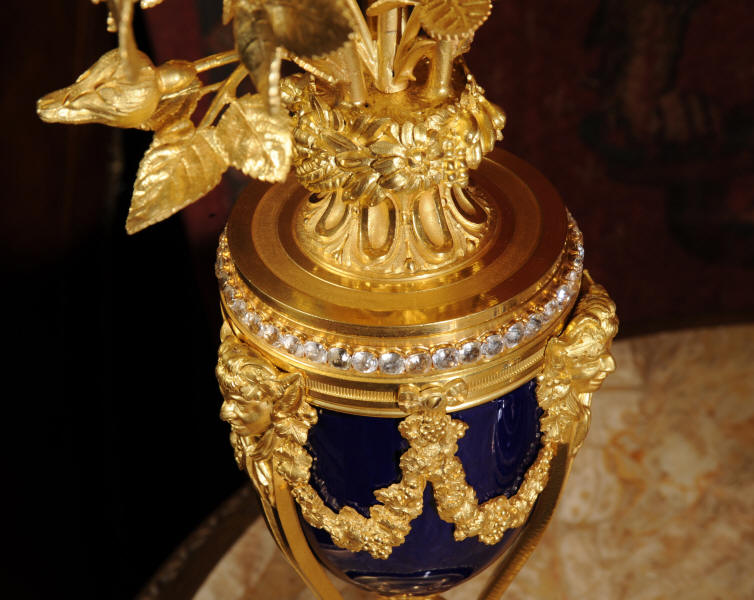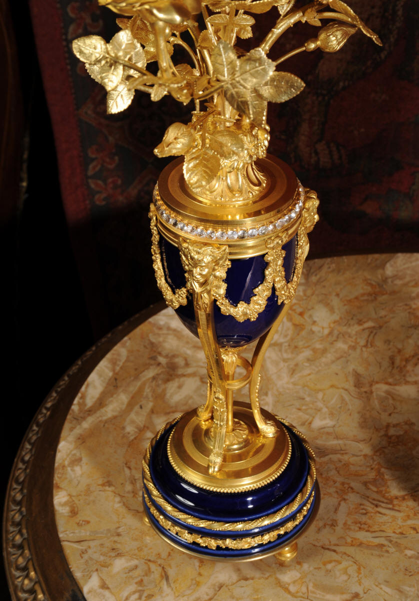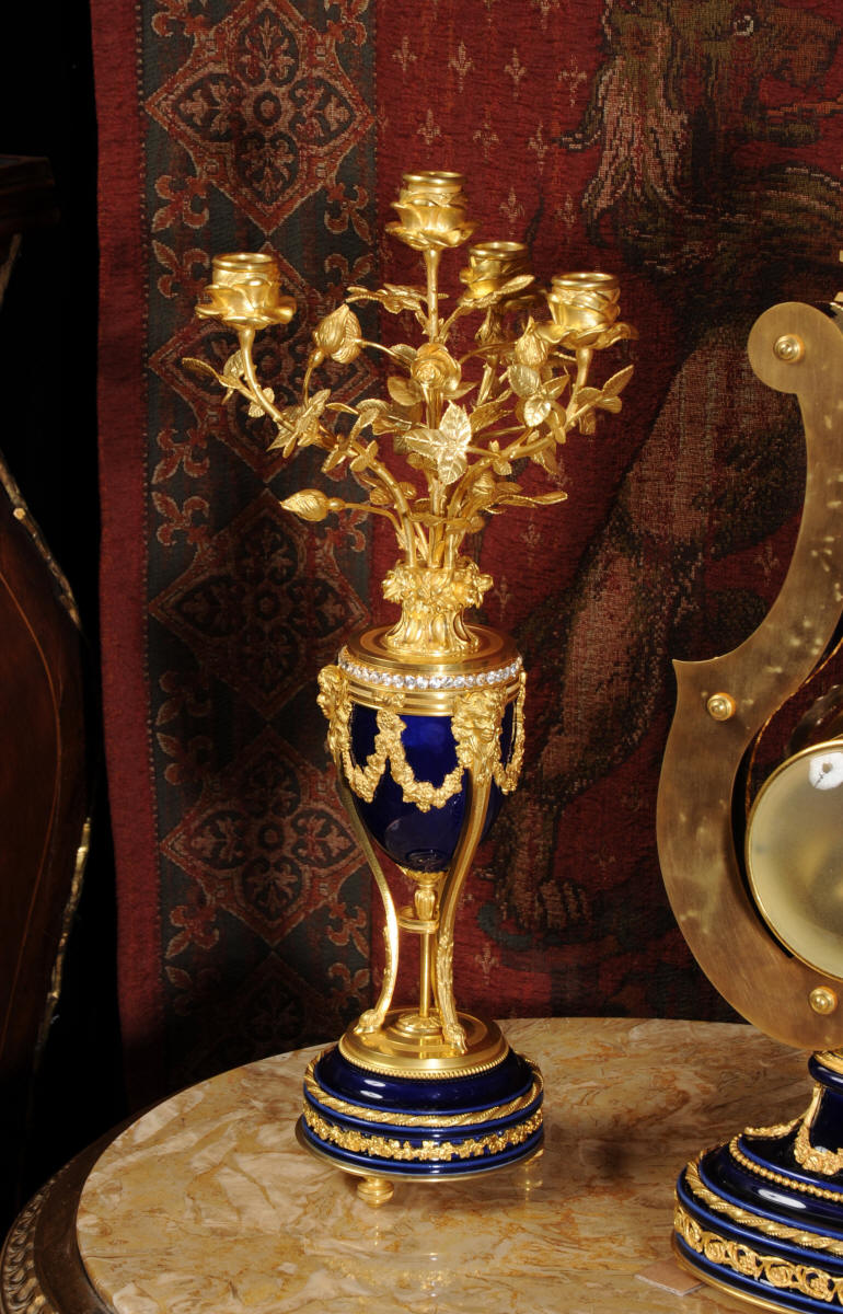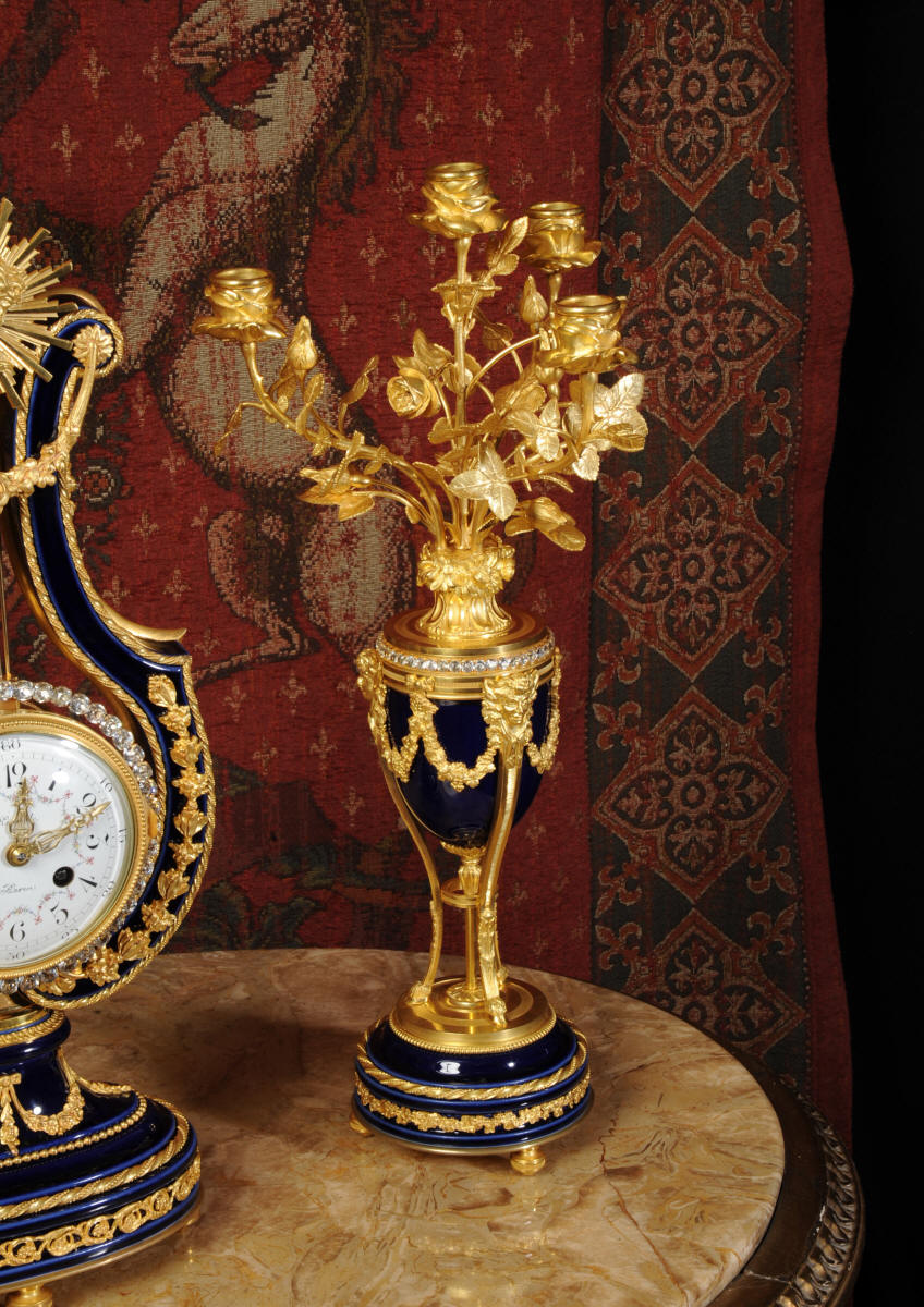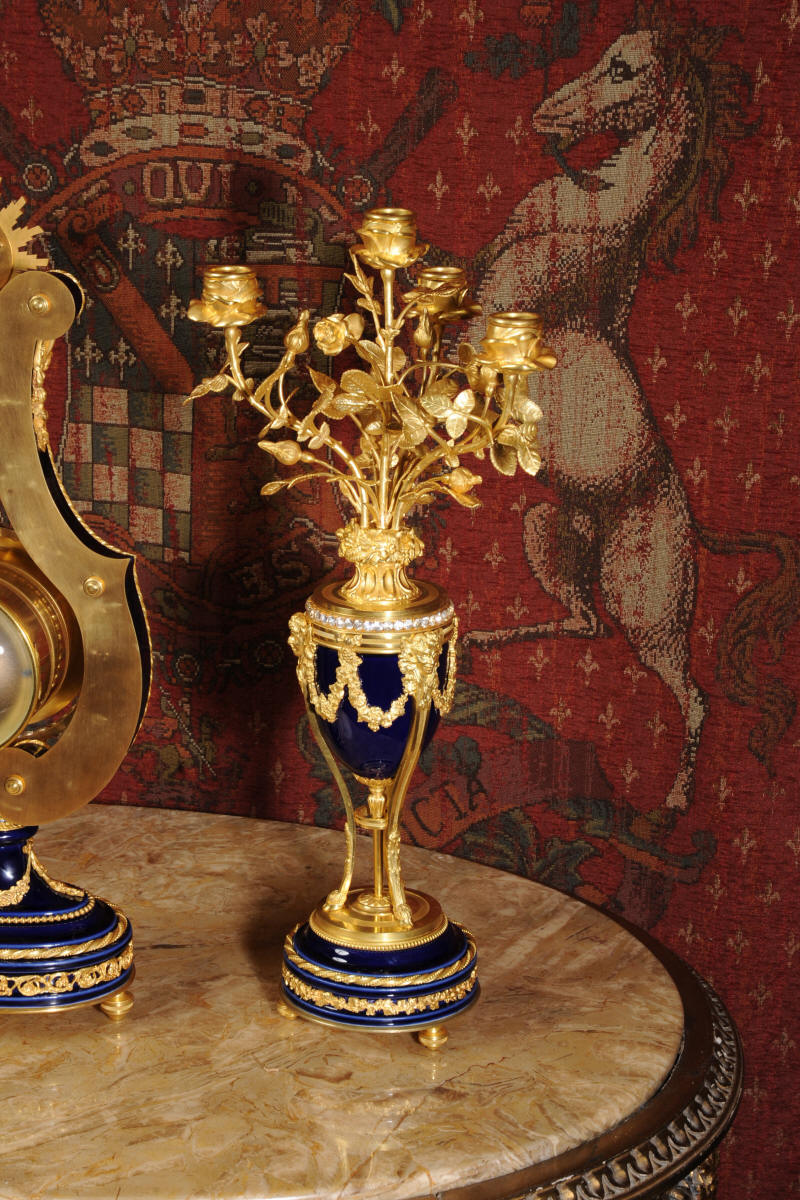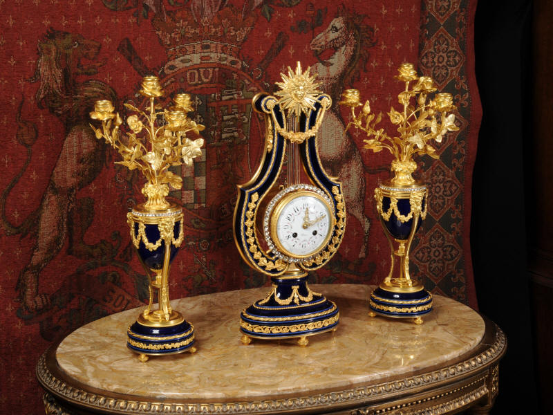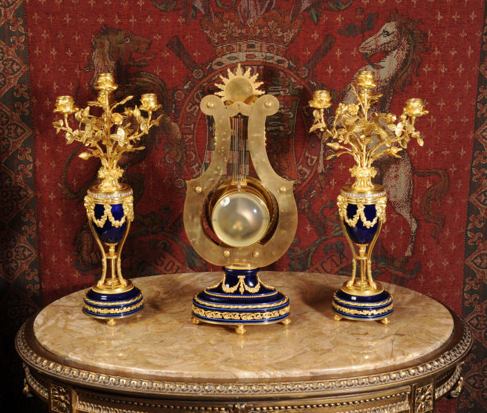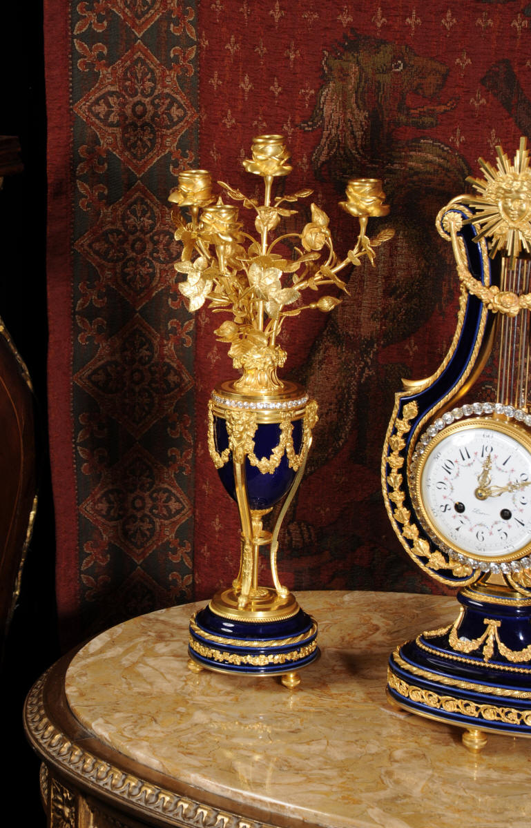 Beau Bleu Porcelain and Ormolu Lyre Clock with Mystery Pendulum