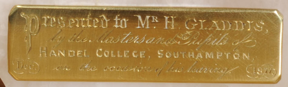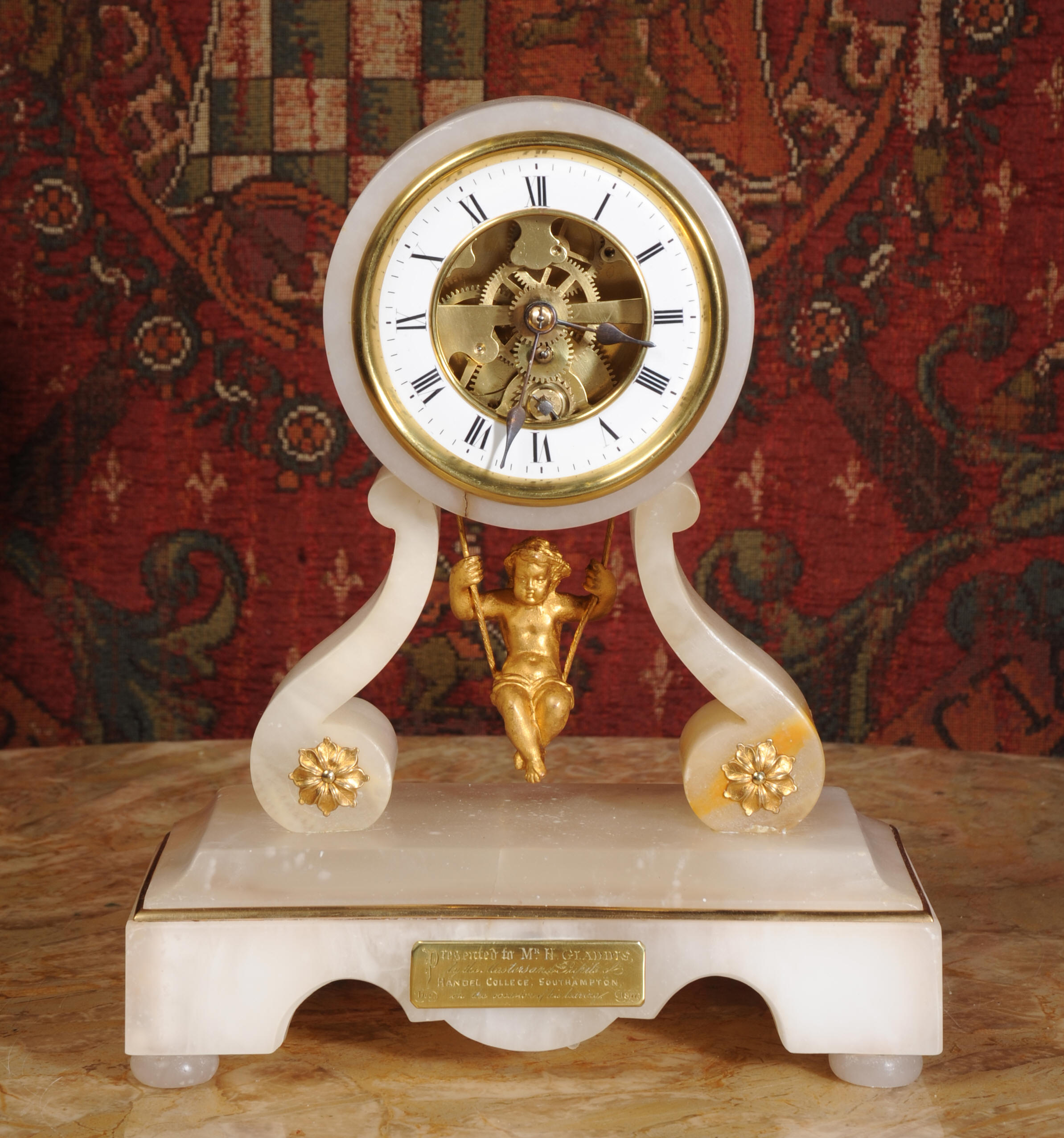 The dial is enamel on copper in the form of a ring around the centre which is open to allow the skeletonised movement to be seen. Please note, this type of clock does not have a glazed bezel or a rear door. On the base of the clock is a presentation plaque dated 1877.