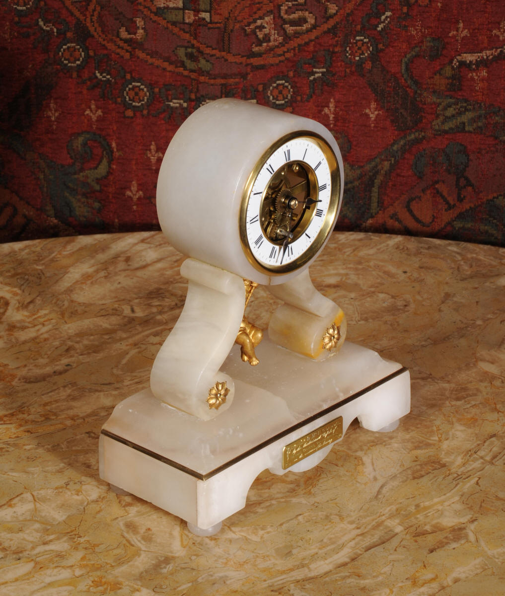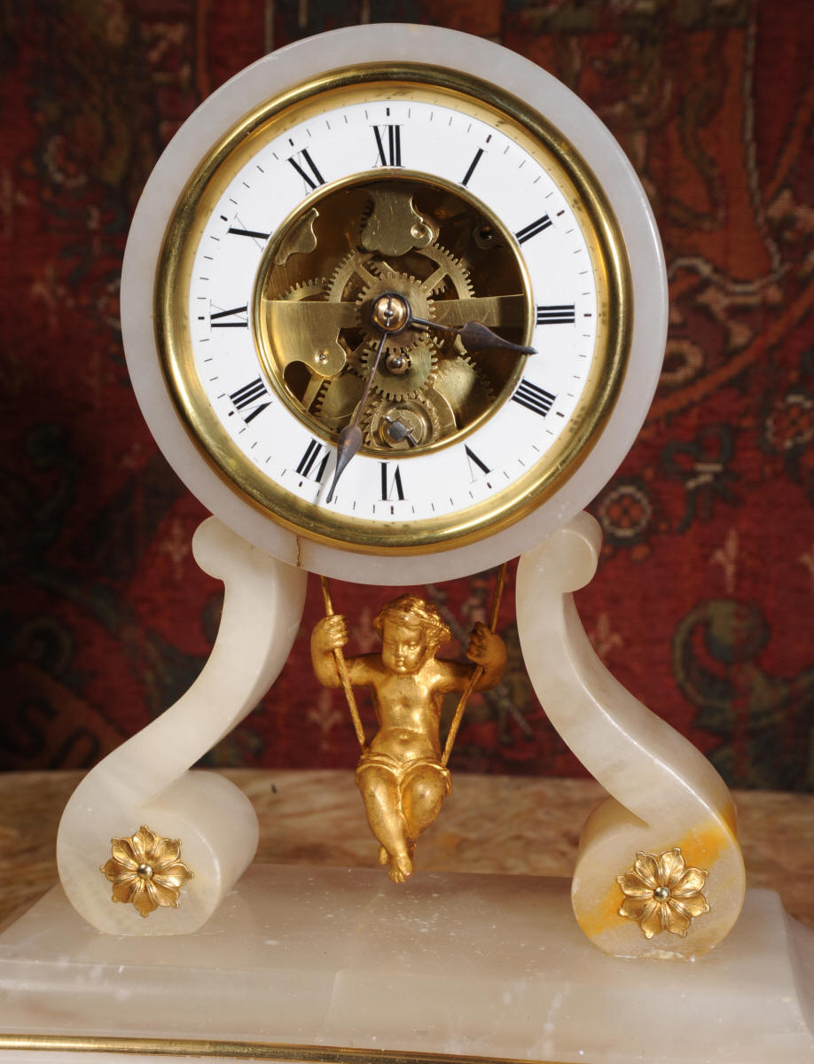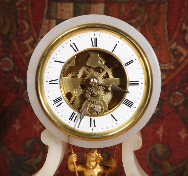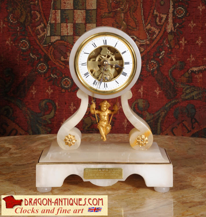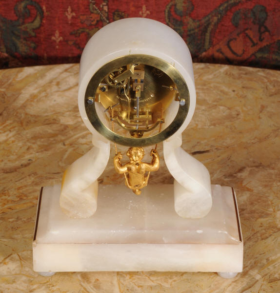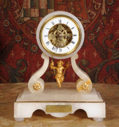 Condition of the case is very good, alabaster is a delicate material and there are one or two marks, discolouration and nibbles to the edges, particularly to the rear of the top. There are some small groves in the rear of the drum. The dial is also in excellent condition with no damage. The metal work including the cherub is in excellent clean and bright condition This is a rare and delightful clock to add to your collection.