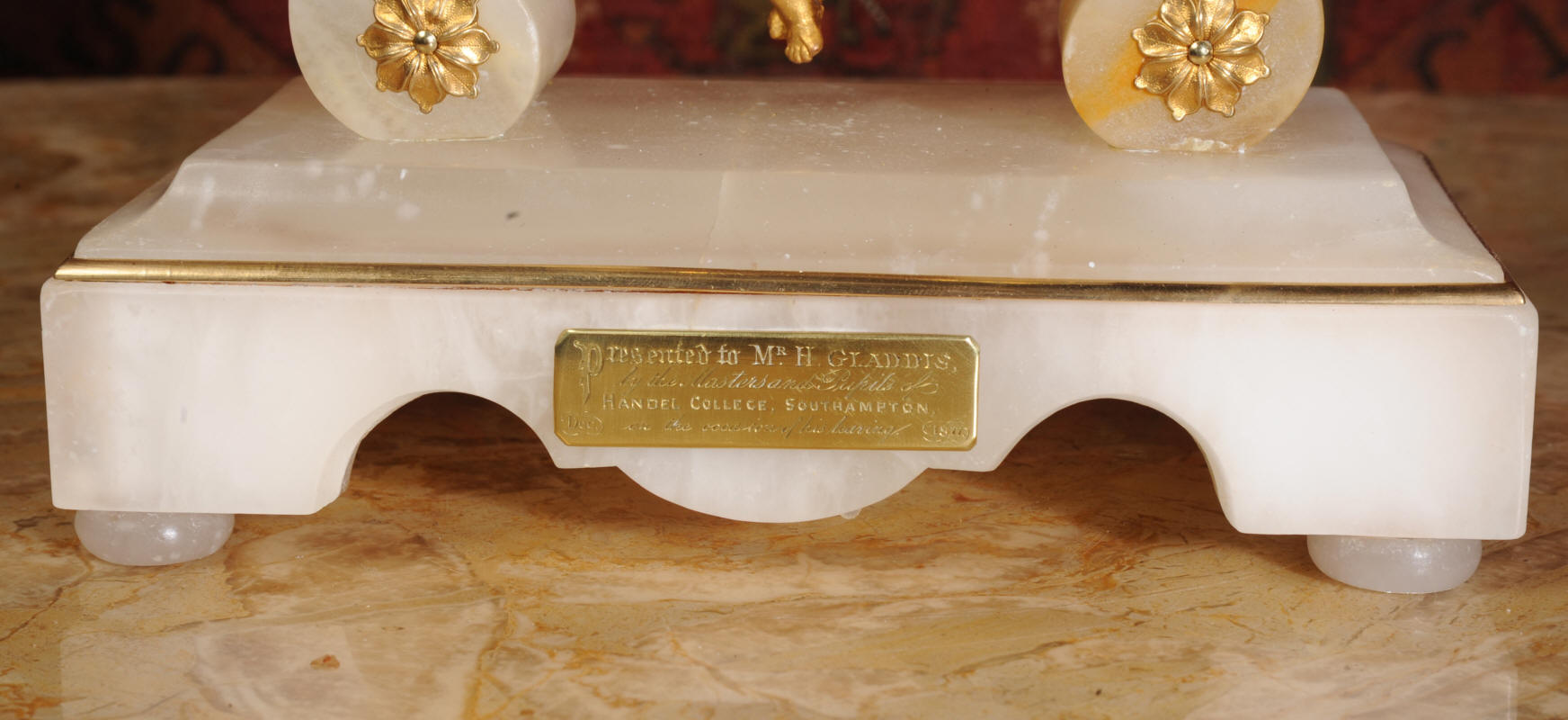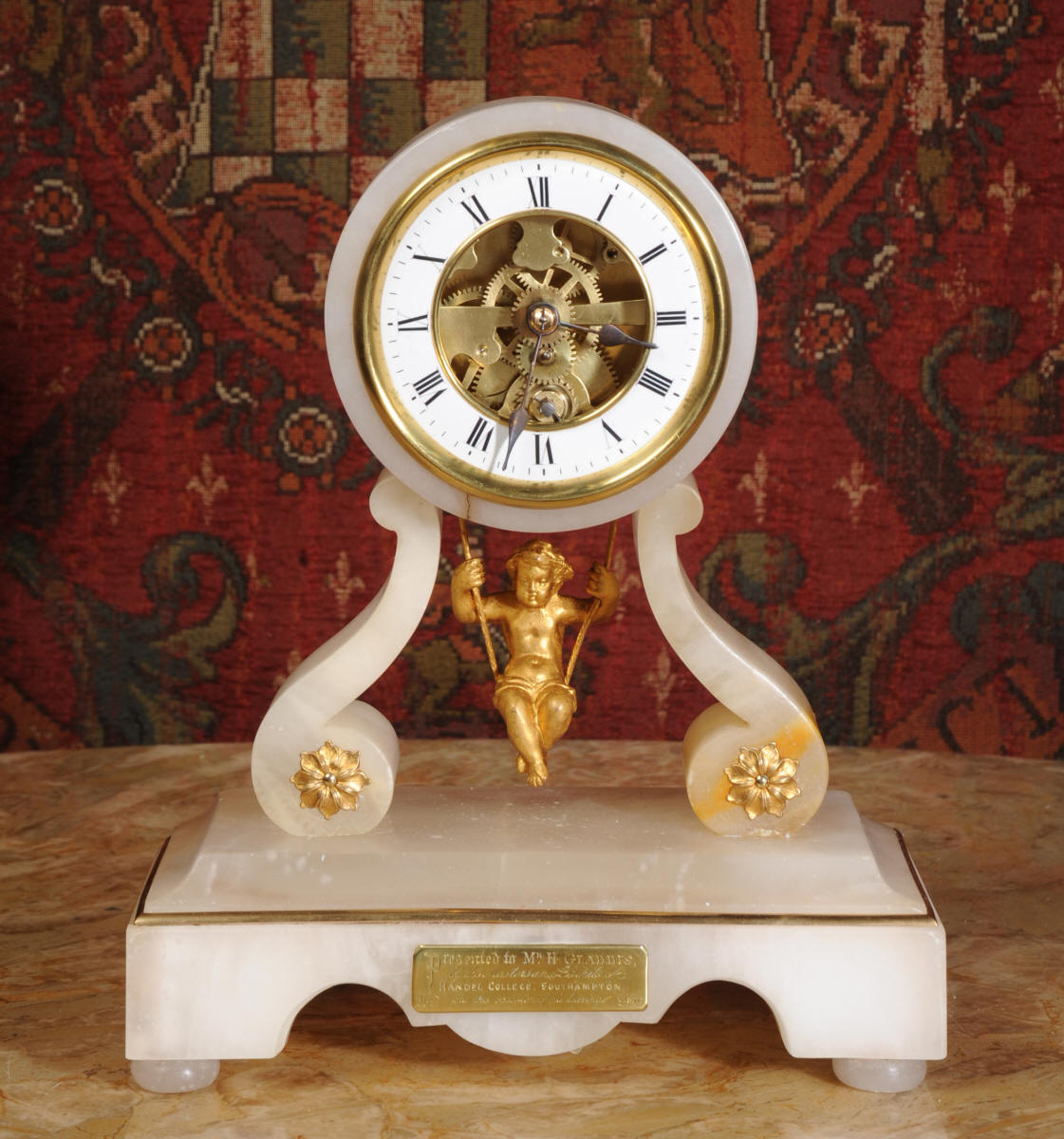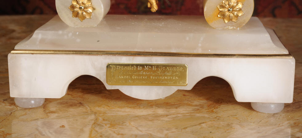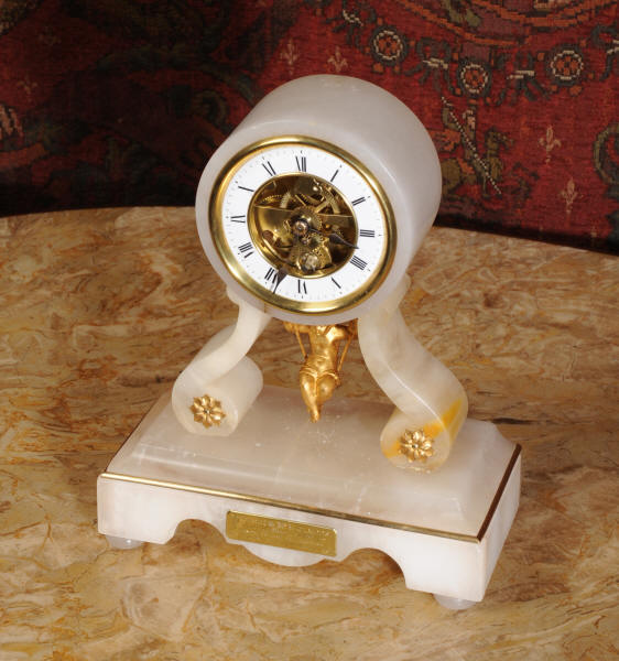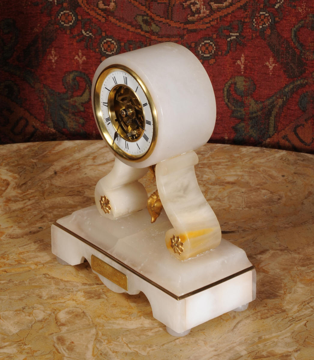 Condition of the case is very good, alabaster is a delicate material and there are one or two marks, discolouration and nibbles to the edges, particularly to the rear of the top. There are some small groves in the rear of the drum. The dial is also in excellent condition with no damage. The metal work including the cherub is in excellent clean and bright condition This is a rare and delightful clock to add to your collection.
