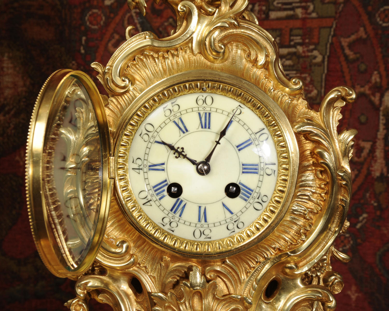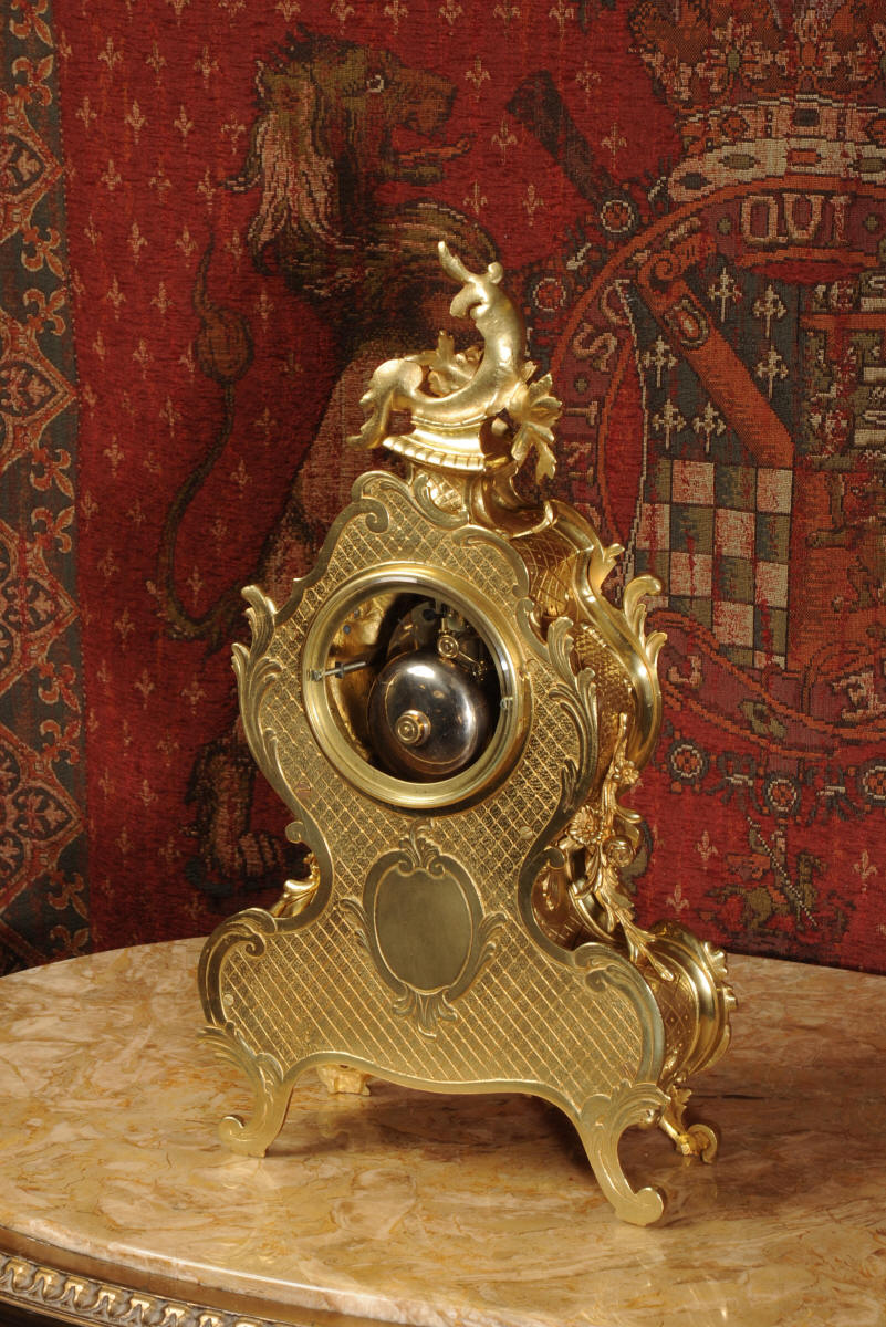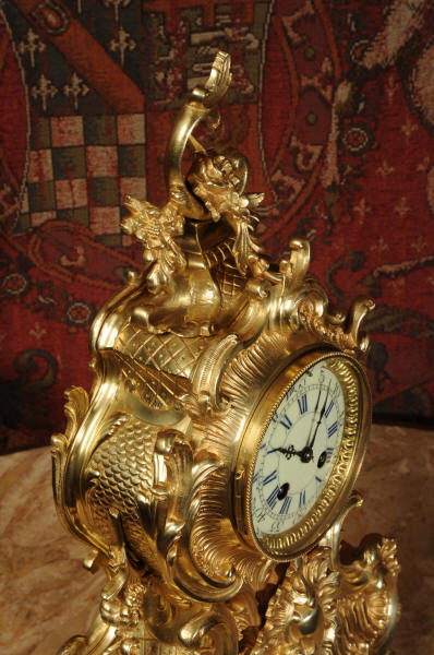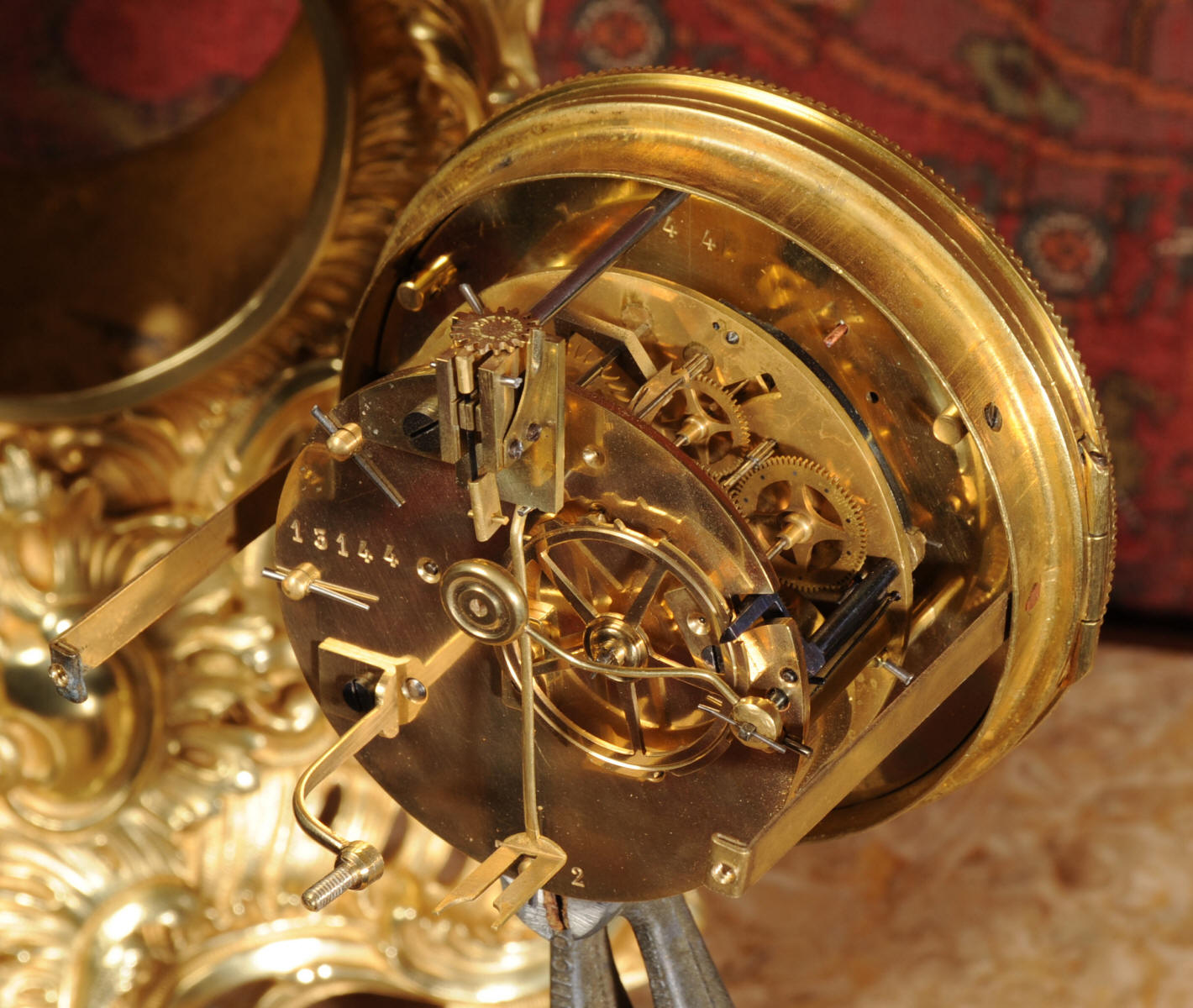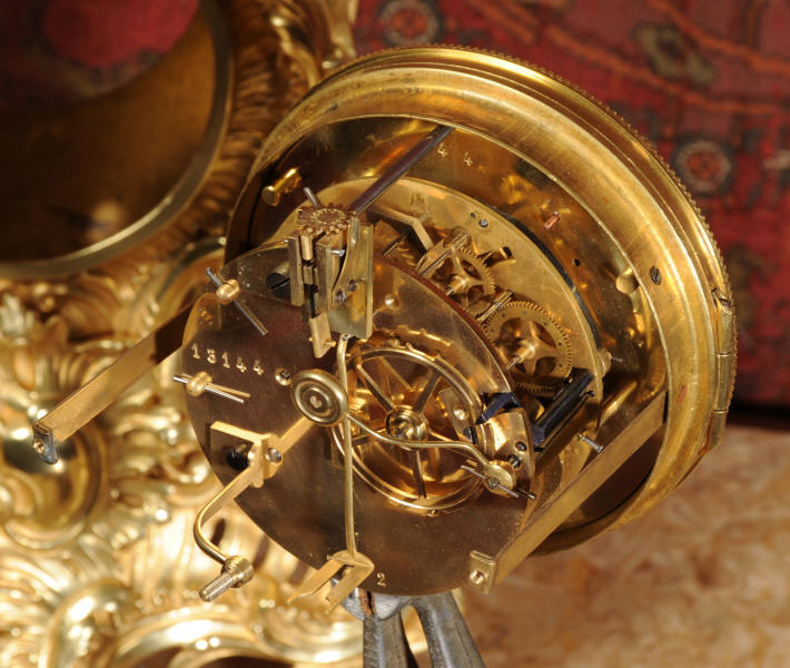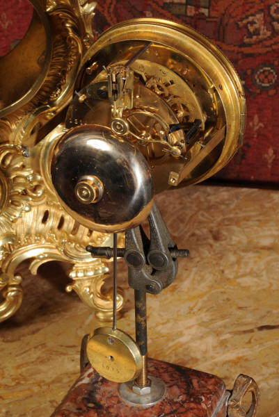 The French movement is of high quality and is in excellent clean and running condition having been fully overhauled by our clockmaker. Pendulum is an old replacement. It runs for 8 days and strikes the hours and halves on a large sonorous bell. Click the video clip below to hear the bell and watch the clock running!