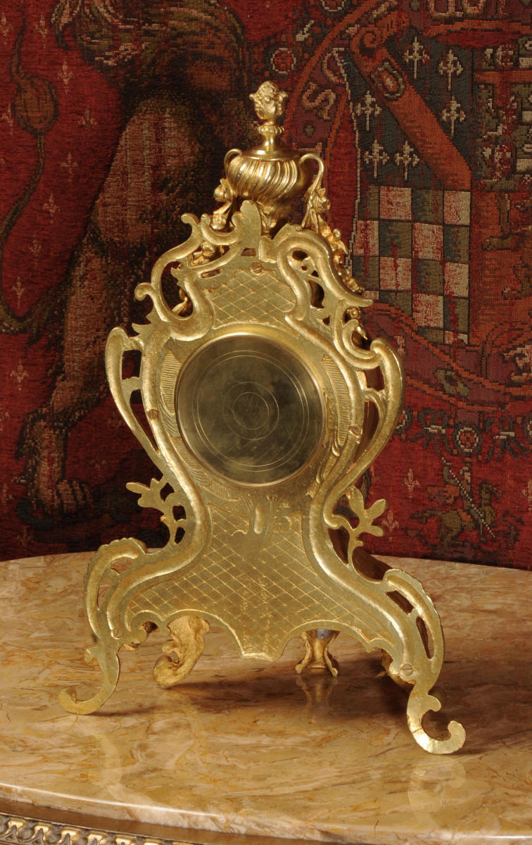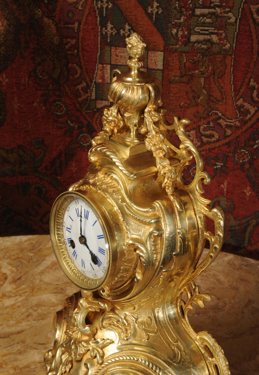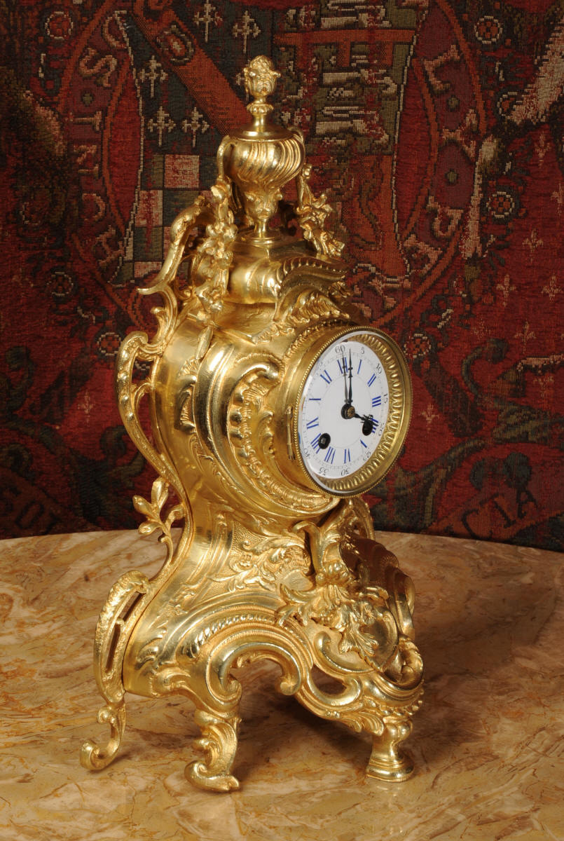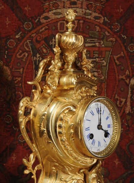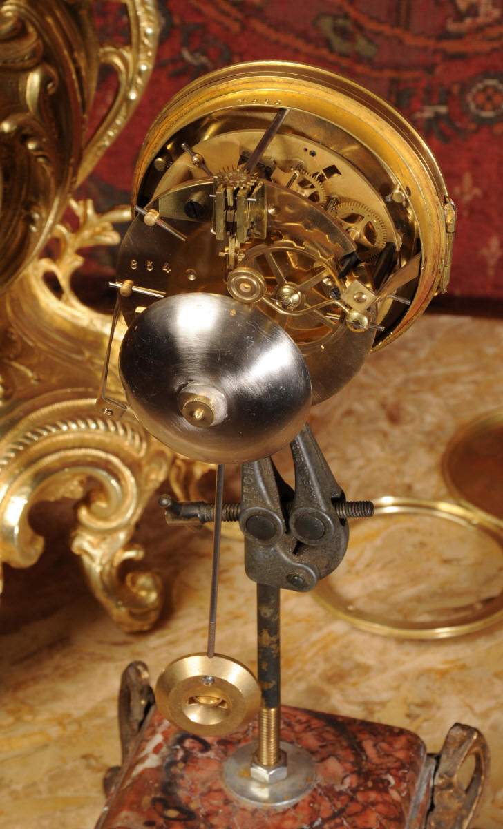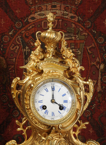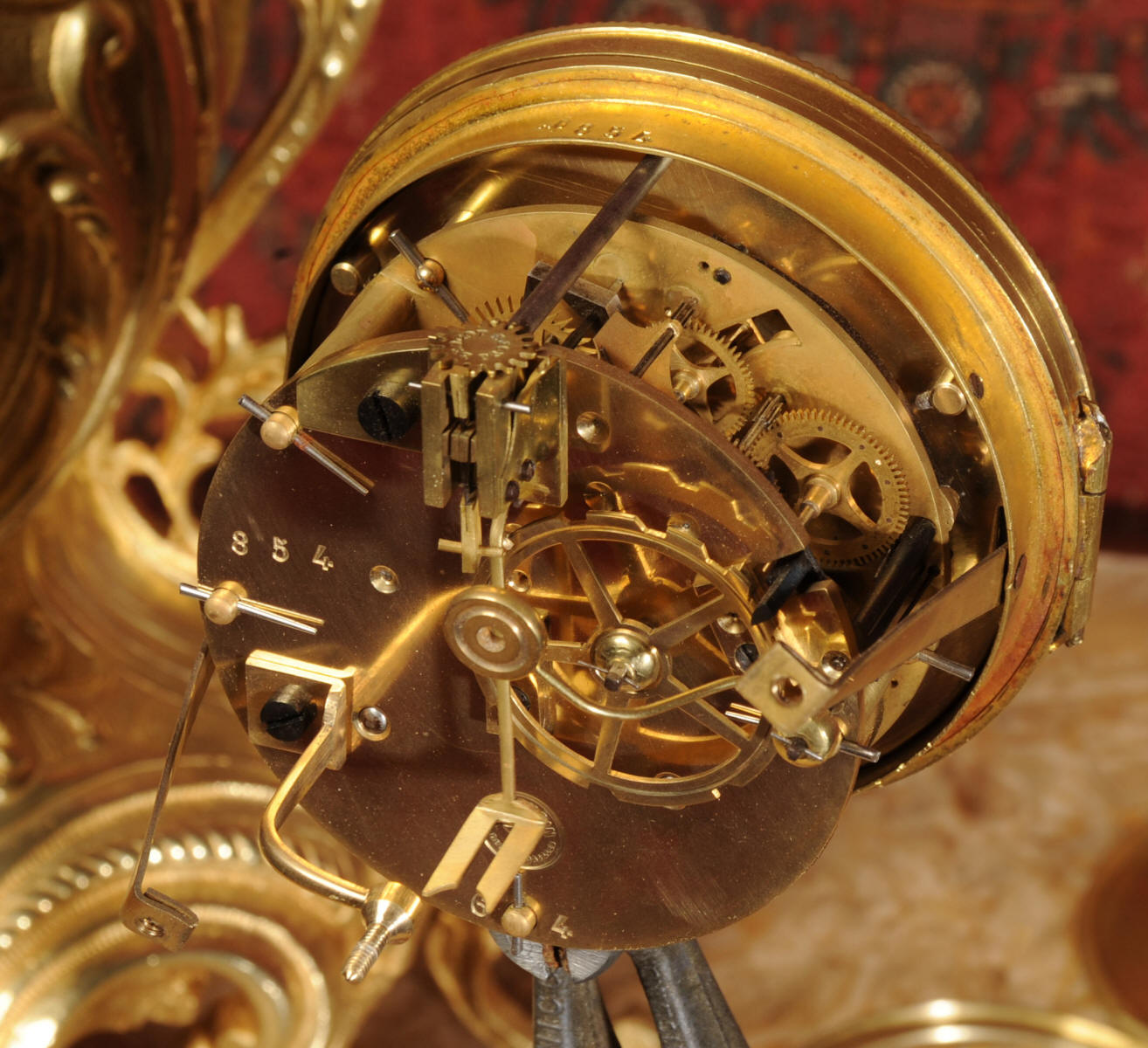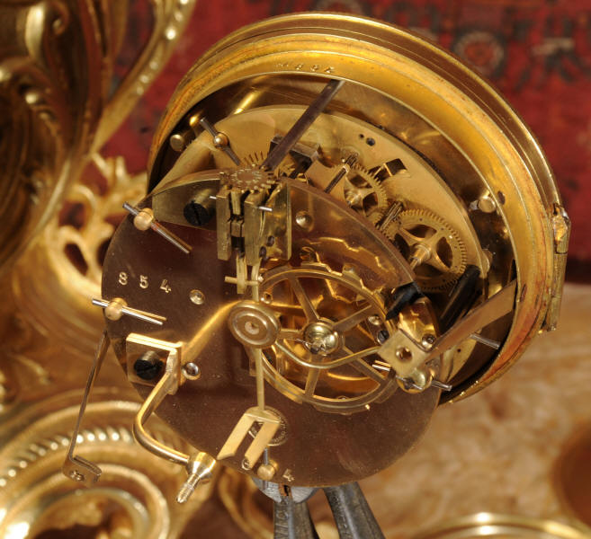The French movement is by A. D. Mougin and is of high quality. It is in excellent clean and running condition having been fully overhauled by our clockmaker. Pendulum is a replacement. It runs for 8 days and strikes the hours and halves on a bell. Click the video clip below to hear the bell and watch the clock running!