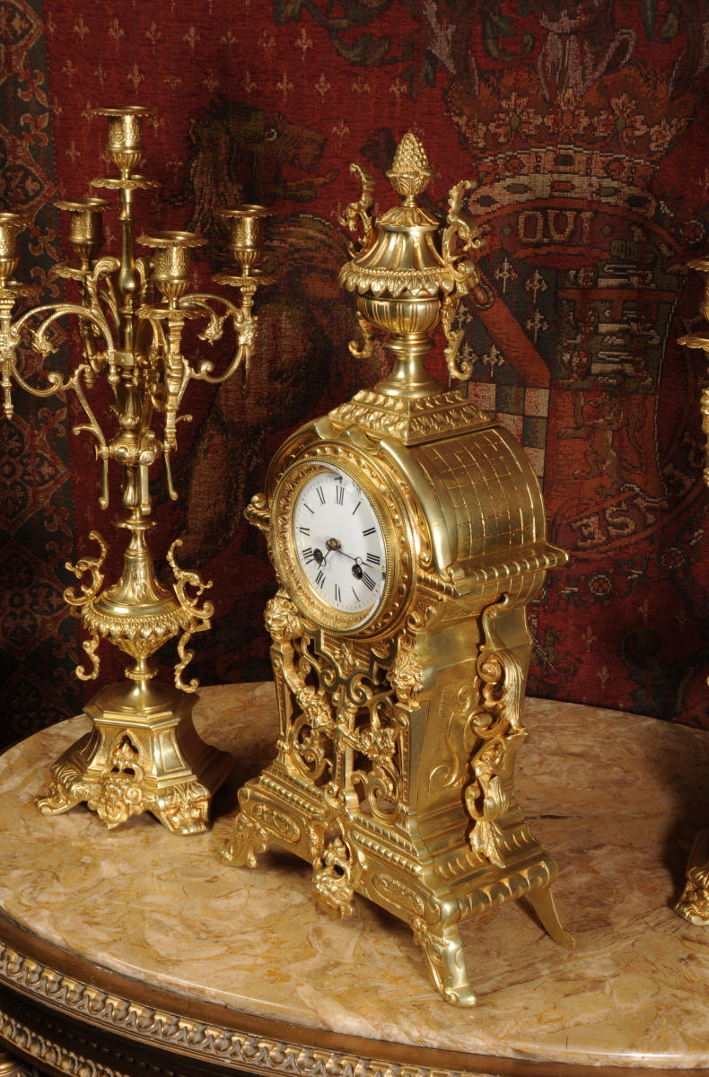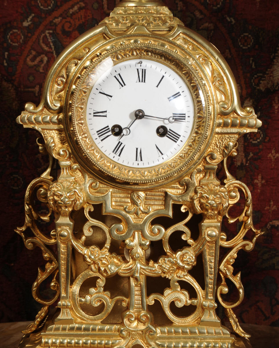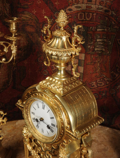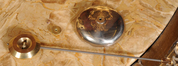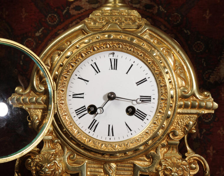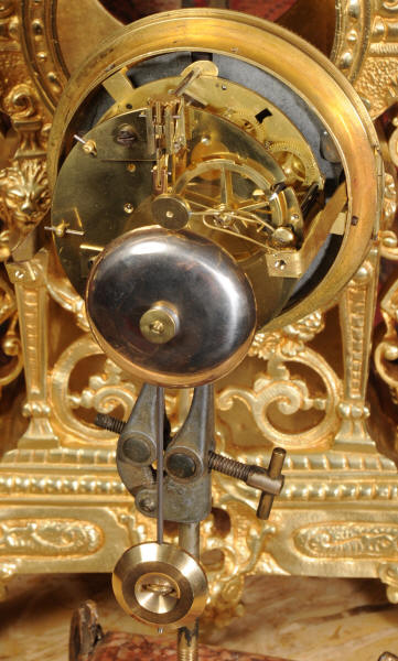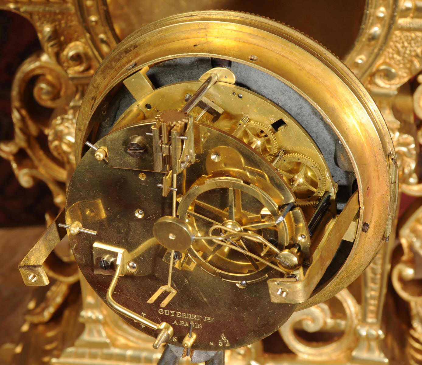 The French movement is of high quality and is by the Paris maker Guyerdet, his mark is on the movement backplate. It is the earlier design of the Pendule De Paris movement with outside strike hammer spring stop and narrow anchor escapement. He is listed in Tardy as working in the Rue Du Temple in 1860. It is in excellent clean and running condition having been fully overhauled by our clockmaker. Pendulum is a replacement. It runs for 8 days and strikes the hours and halves on a bell. Click the video clip below to hear the bell and watch the clock running!