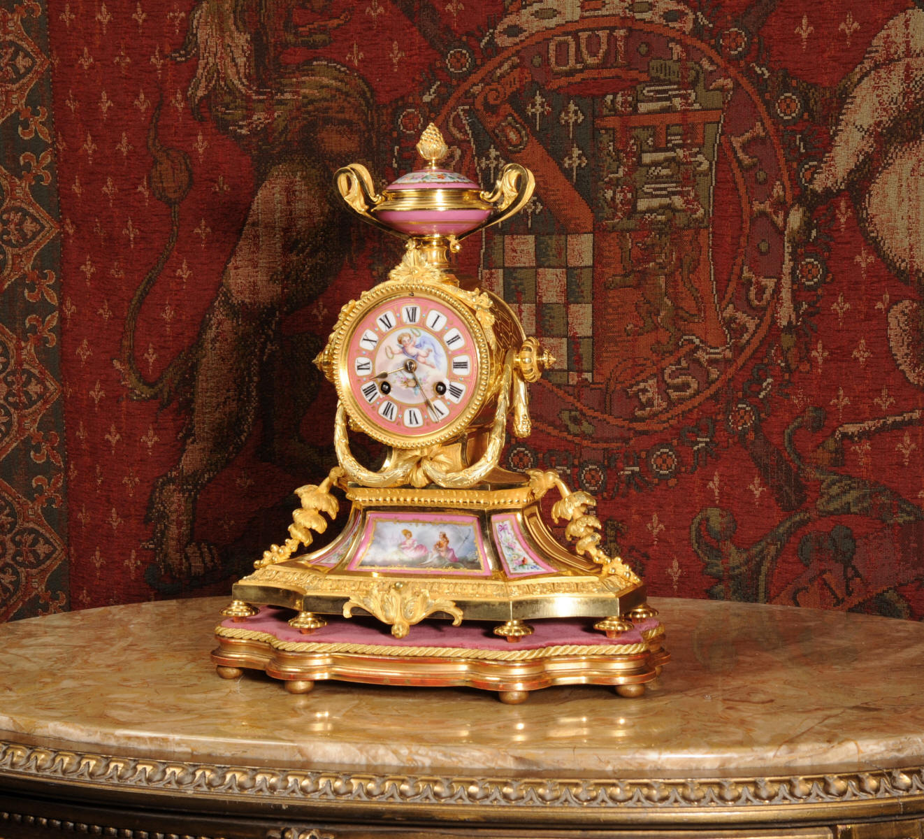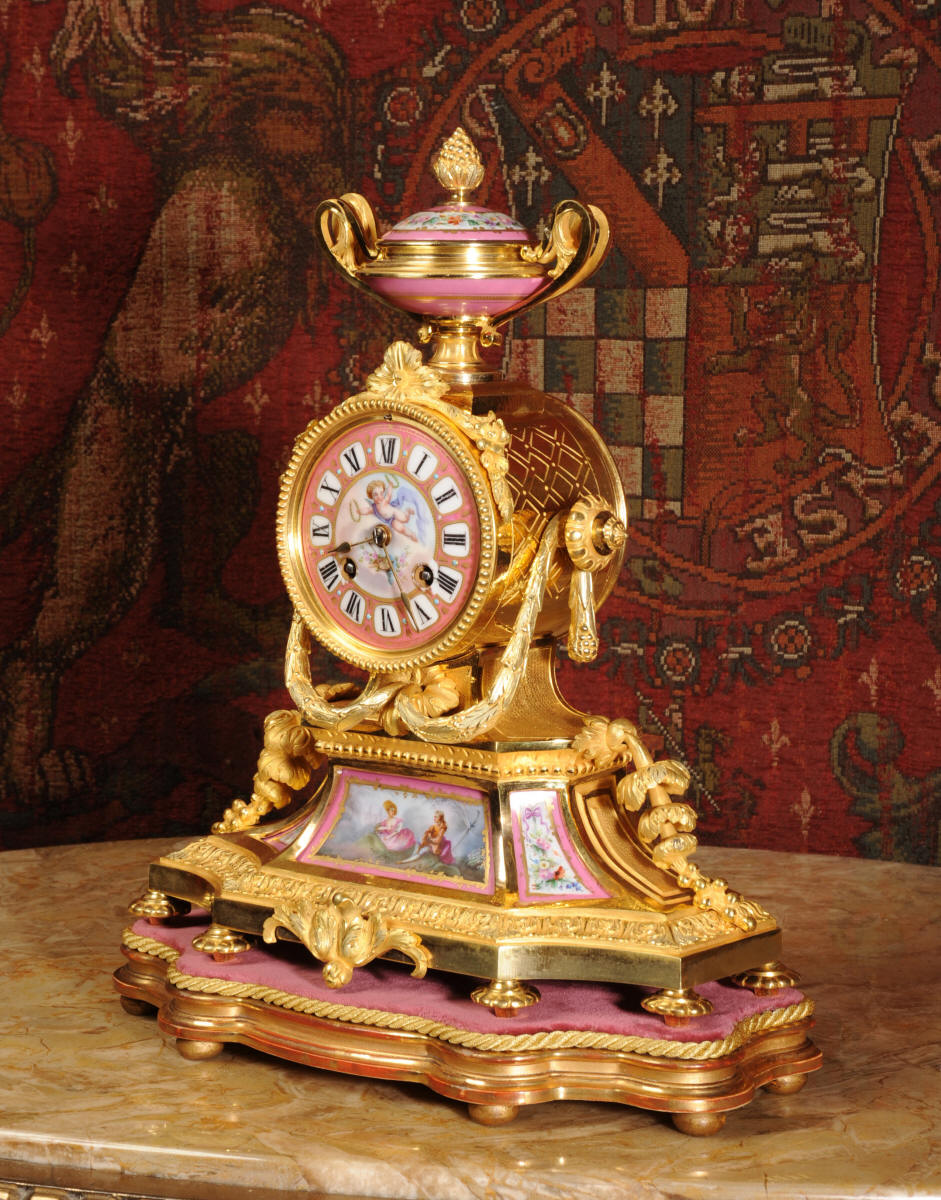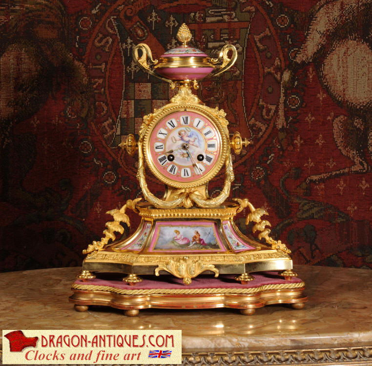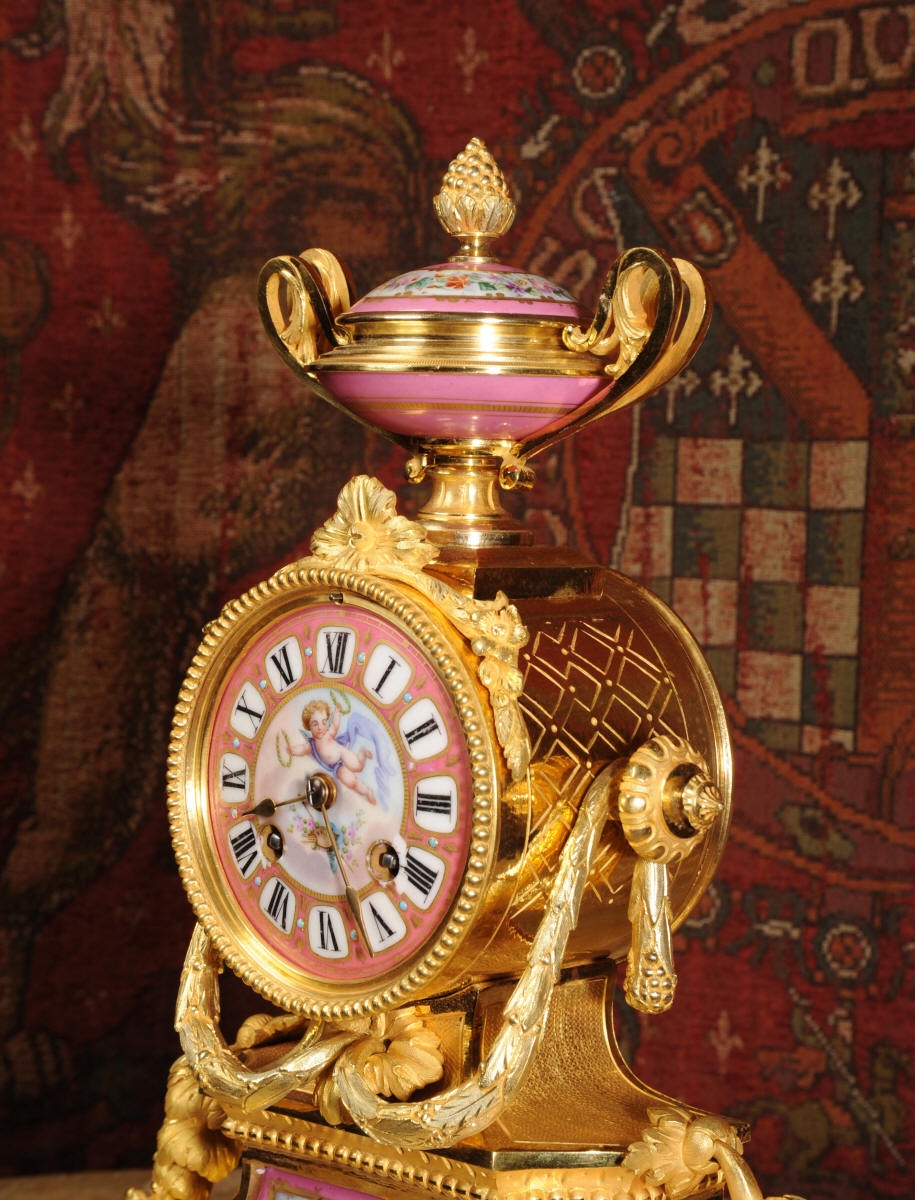 The dial is mounted in a gilded drum with a pink porcelain urn above. This is decorated with floral swags and ormolu handles. Laurel swags hang below the dial. The original gesso base is covered with pink velvet, it bears a number that is one less then that of the clock, however it is a perfect fit and therefore we think this is an original numbering error. The rear door is glazed with convex frosted glass. (Please note that this style of clock does not have a glazed bezel over the dial).