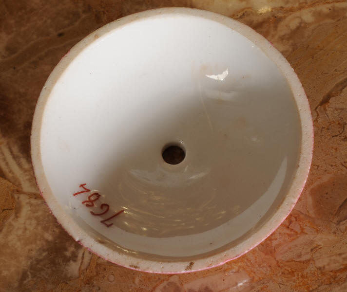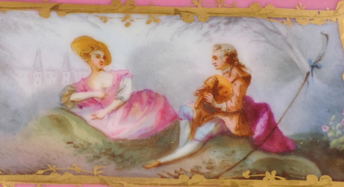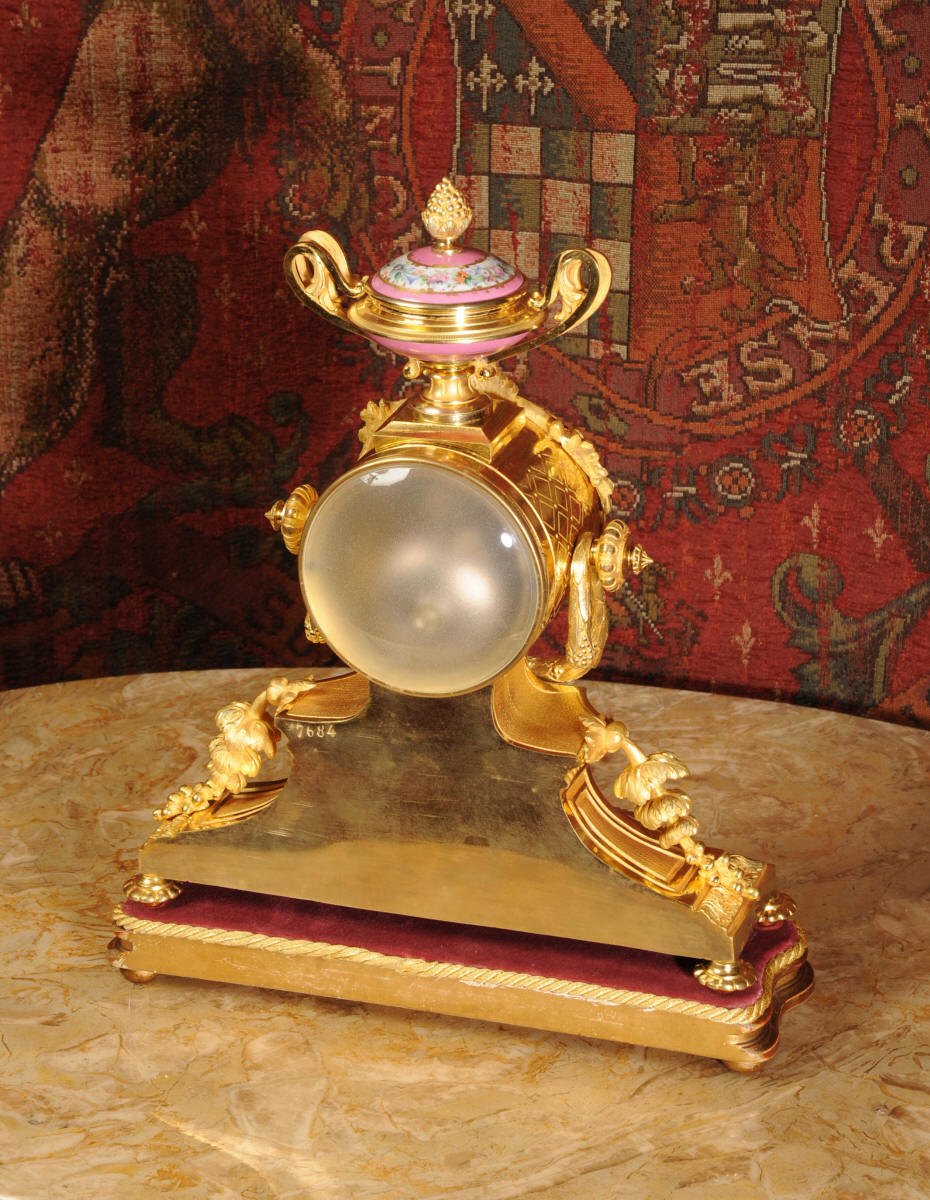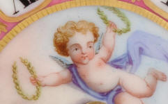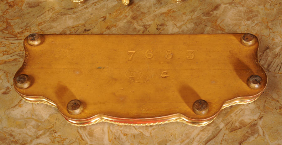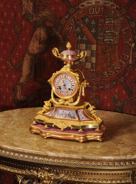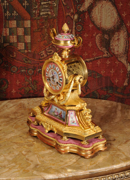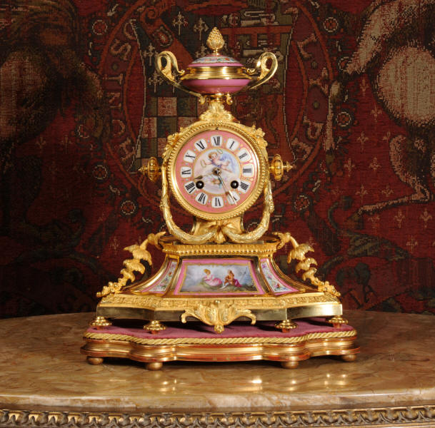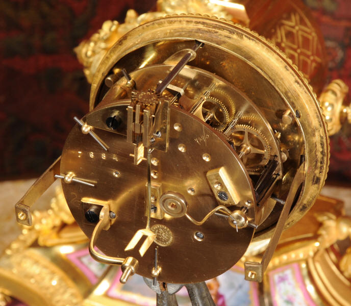 The dial is mounted in a gilded drum with a pink porcelain urn above. This is decorated with floral swags and ormolu handles. Laurel swags hang below the dial. The original gesso base is covered with pink velvet, it bears a number that is one less then that of the clock, however it is a perfect fit and therefore we think this is an original numbering error. The rear door is glazed with convex frosted glass. (Please note that this style of clock does not have a glazed bezel over the dial).