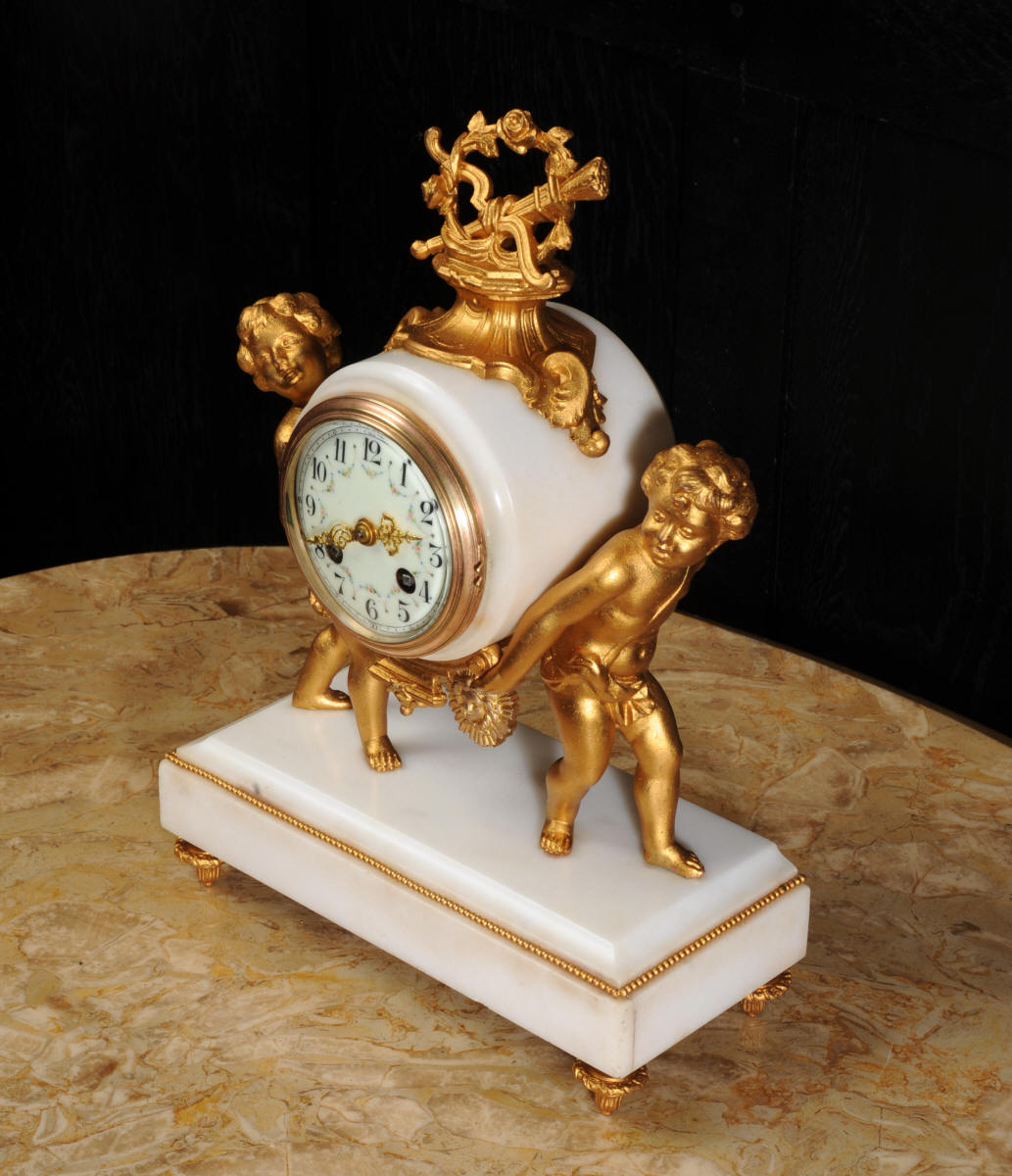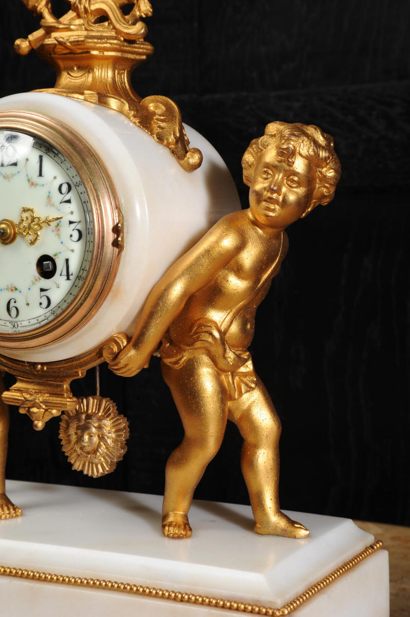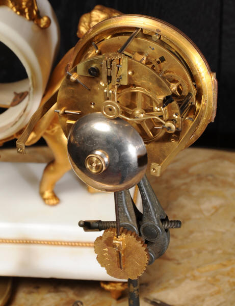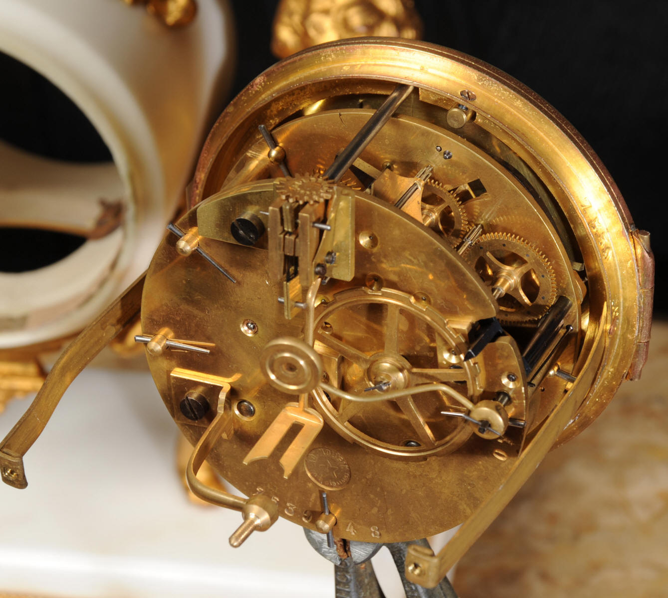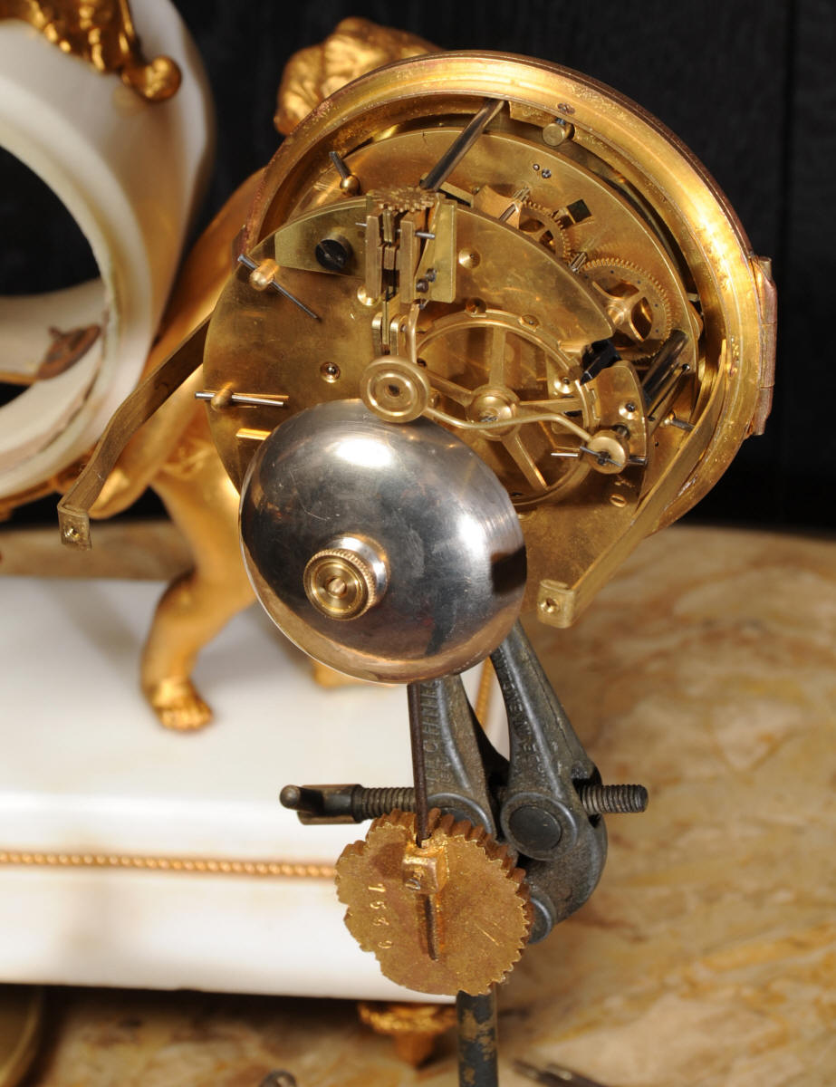 The French movement is by A. D. Mougin and is of high quality and is in excellent clean and running condition having been fully overhauled by our clockmaker. Pendulum is a original. It runs for 8 days and strikes the hours and halves on a bell. Click the video clip below to hear the bell and watch the clock running! Condition of the case is very good, the gilding is beautifully clean and bright with some wear and discolouration. The marble has a good finish with some minor discolouration and some nibbles to the edges, particularly to the marble drum. The dial is also in excellent condition just some tiny nibbles next to the winding holes.