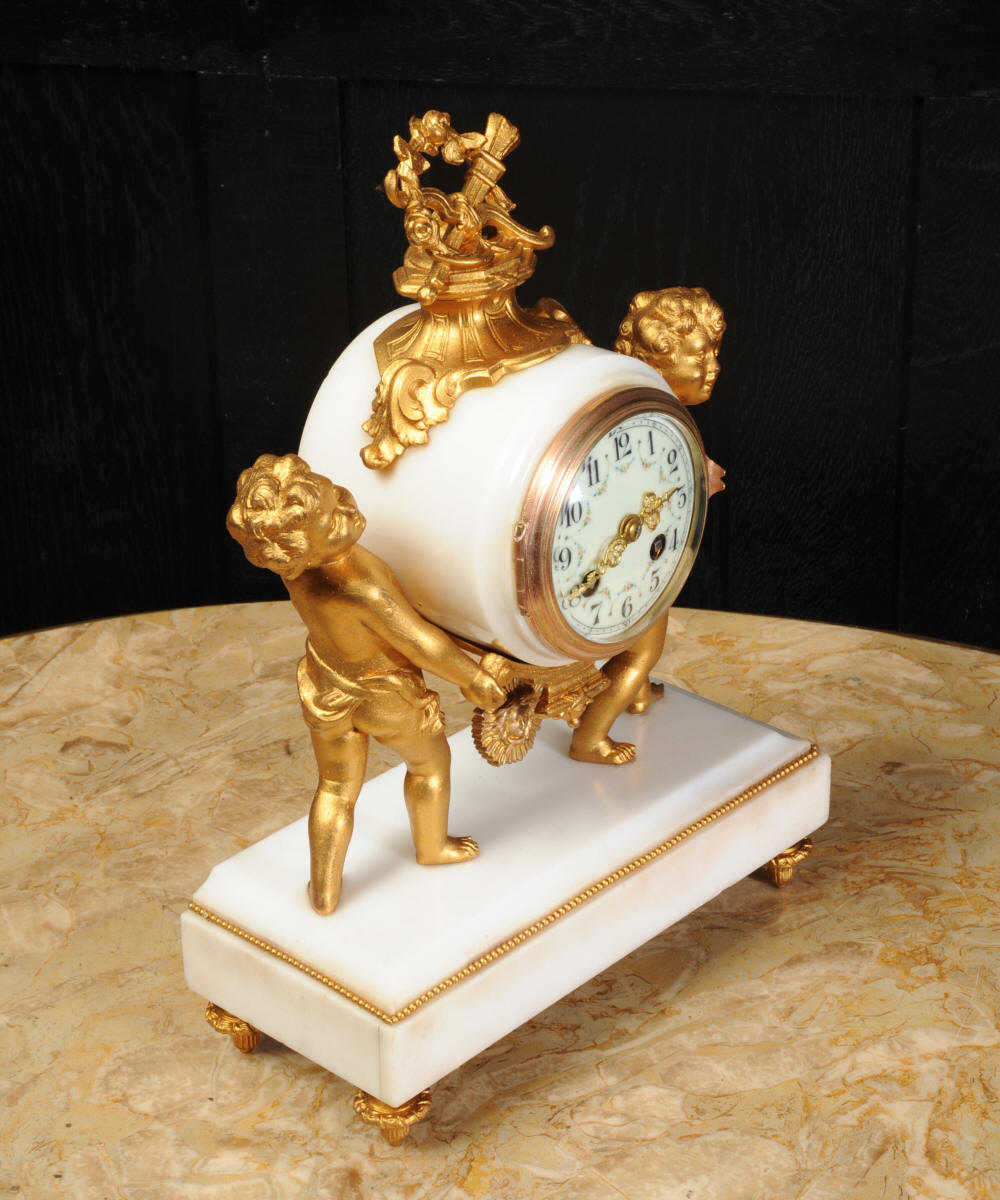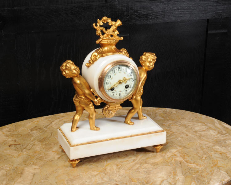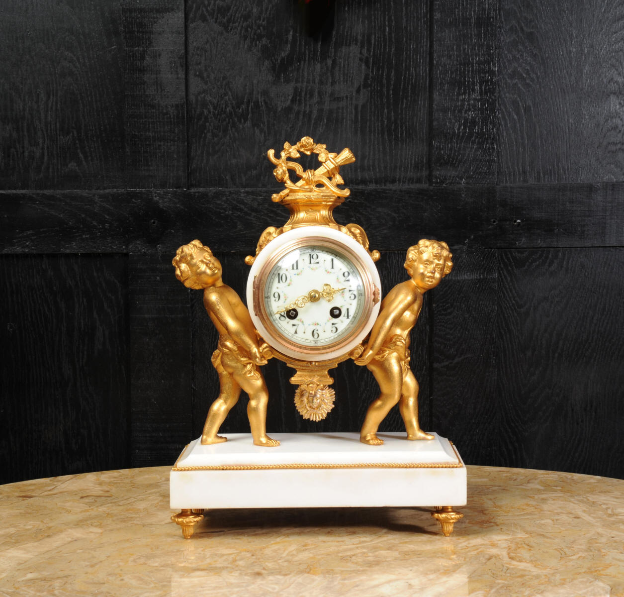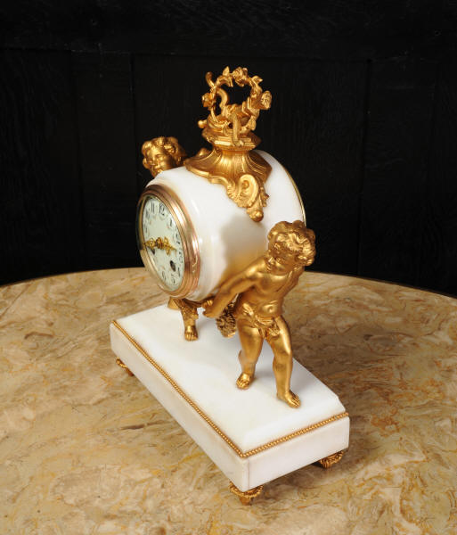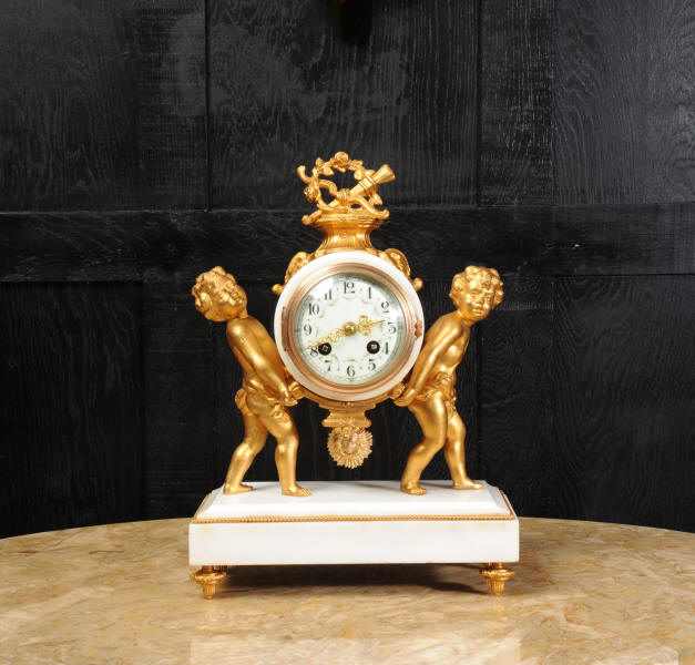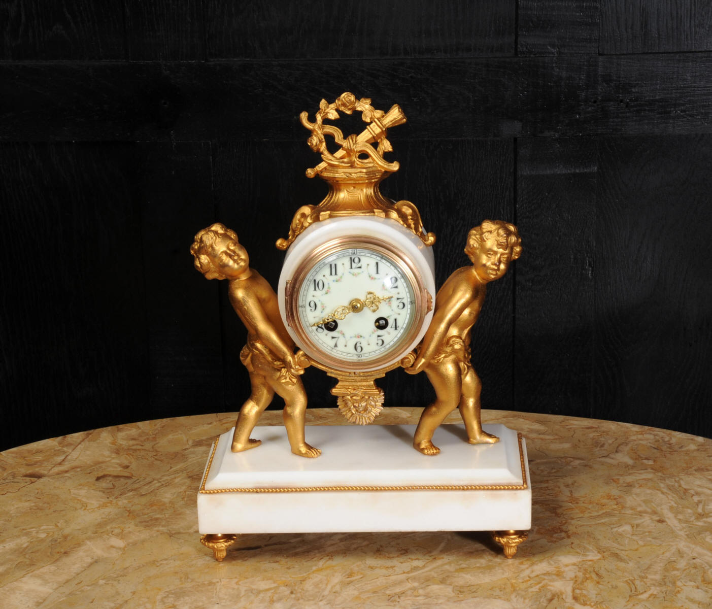 The French movement is by A. D. Mougin and is of high quality and is in excellent clean and running condition having been fully overhauled by our clockmaker. Pendulum is a original. It runs for 8 days and strikes the hours and halves on a bell. Click the video clip below to hear the bell and watch the clock running! Condition of the case is very good, the gilding is beautifully clean and bright with some wear and discolouration. The marble has a good finish with some minor discolouration and some nibbles to the edges, particularly to the marble drum. The dial is also in excellent condition just some tiny nibbles next to the winding holes.