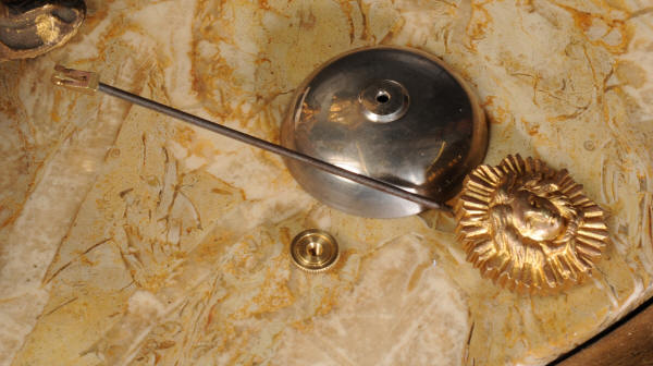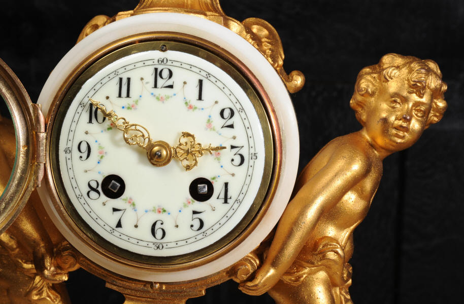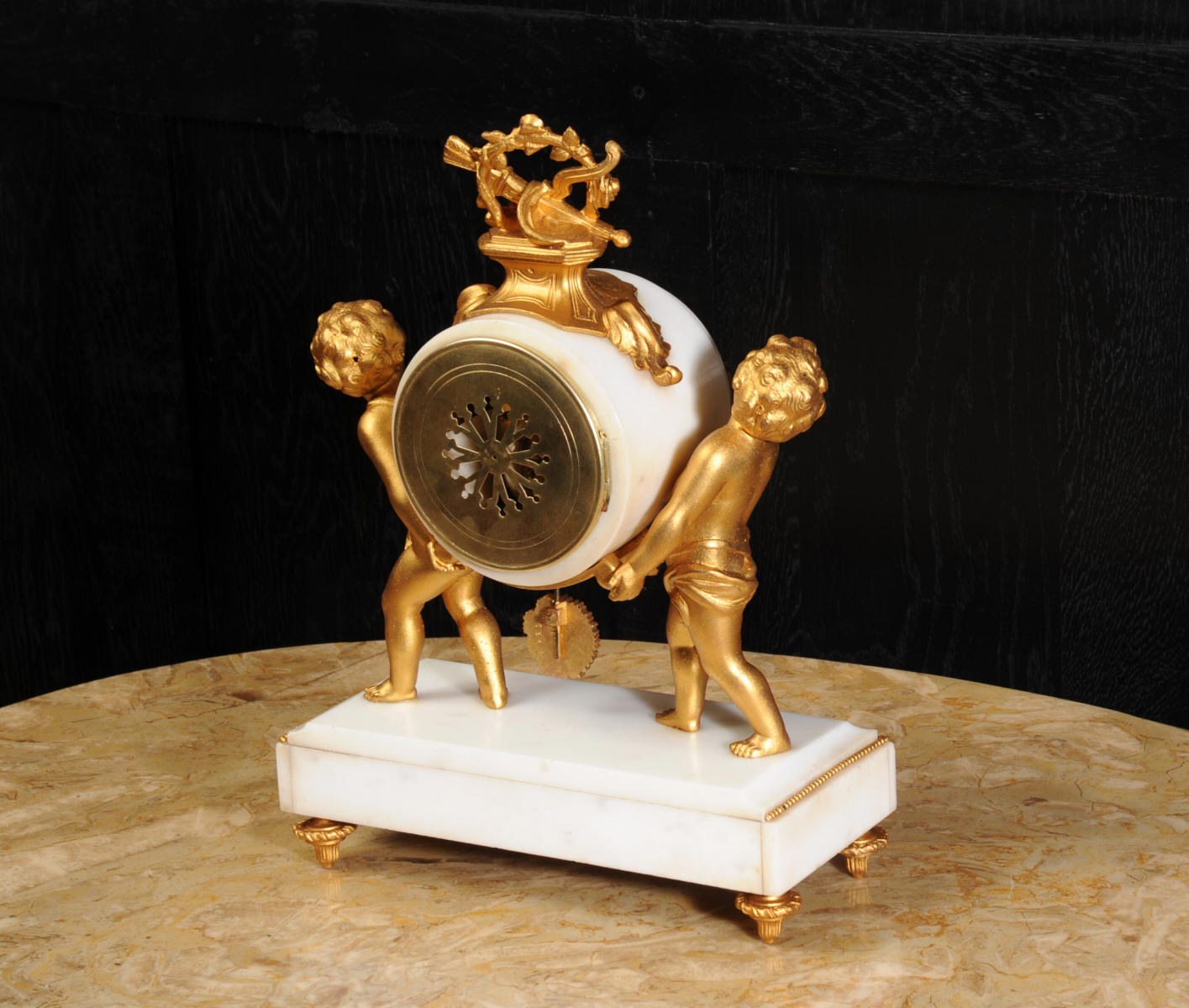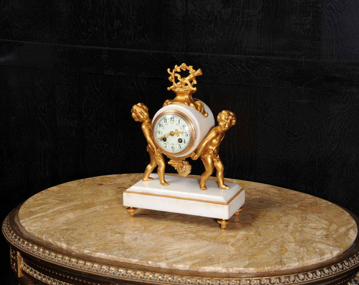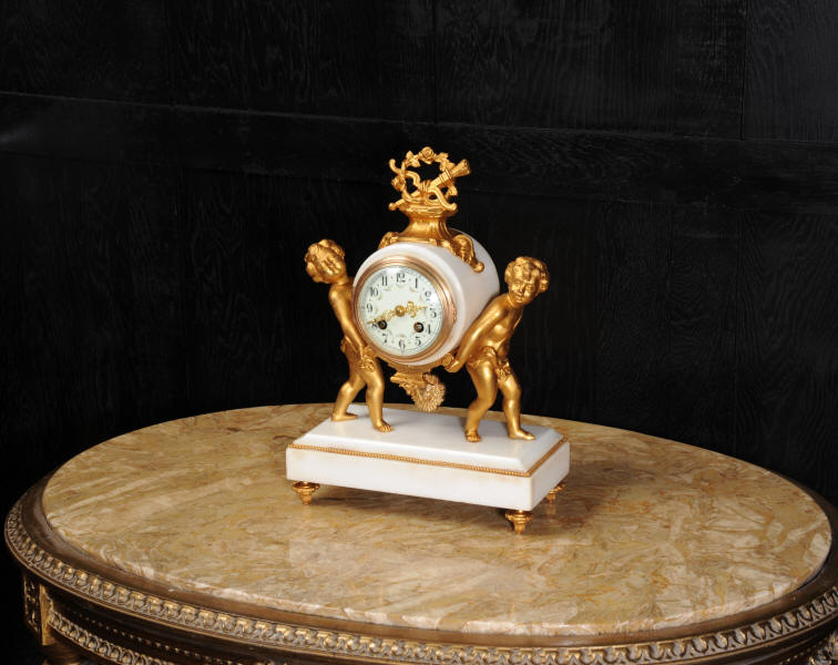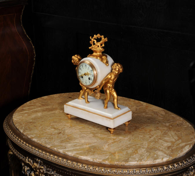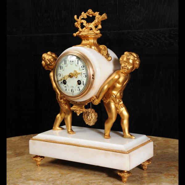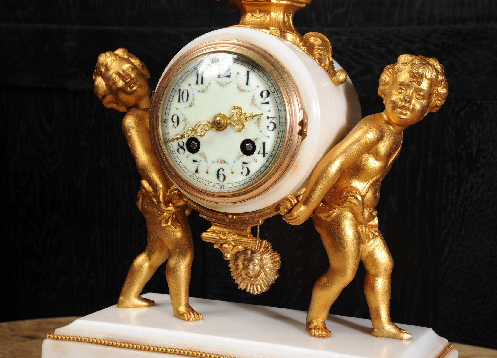 The French movement is by A. D. Mougin and is of high quality and is in excellent clean and running condition having been fully overhauled by our clockmaker. Pendulum is a original. It runs for 8 days and strikes the hours and halves on a bell. Click the video clip below to hear the bell and watch the clock running! Condition of the case is very good, the gilding is beautifully clean and bright with some wear and discolouration. The marble has a good finish with some minor discolouration and some nibbles to the edges, particularly to the marble drum. The dial is also in excellent condition just some tiny nibbles next to the winding holes.