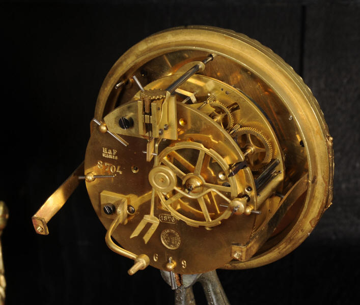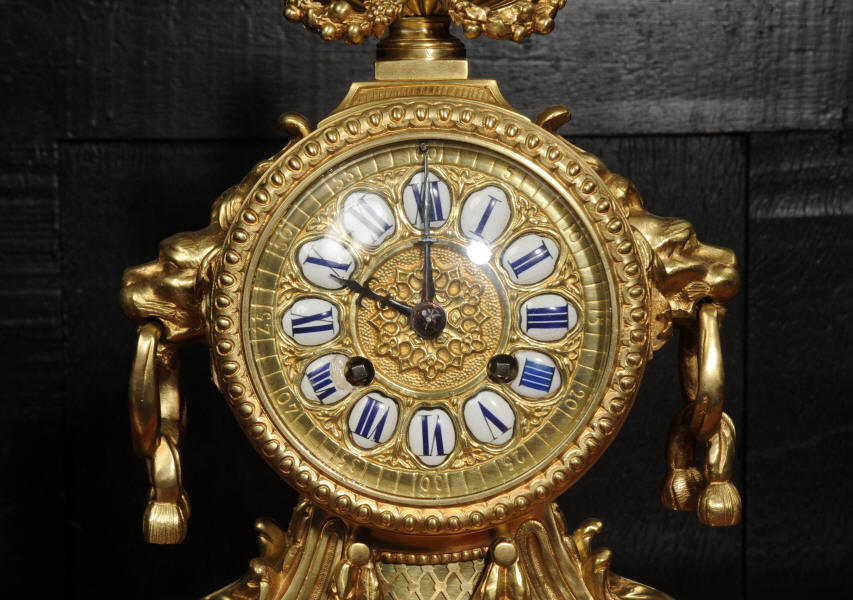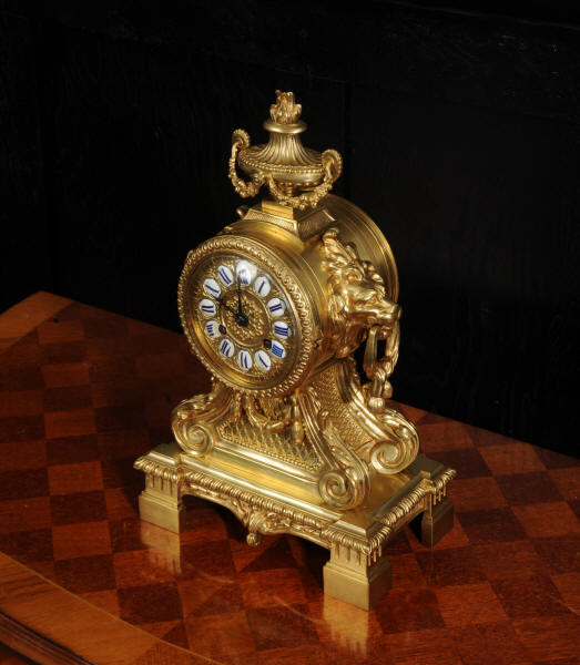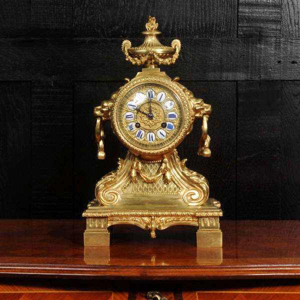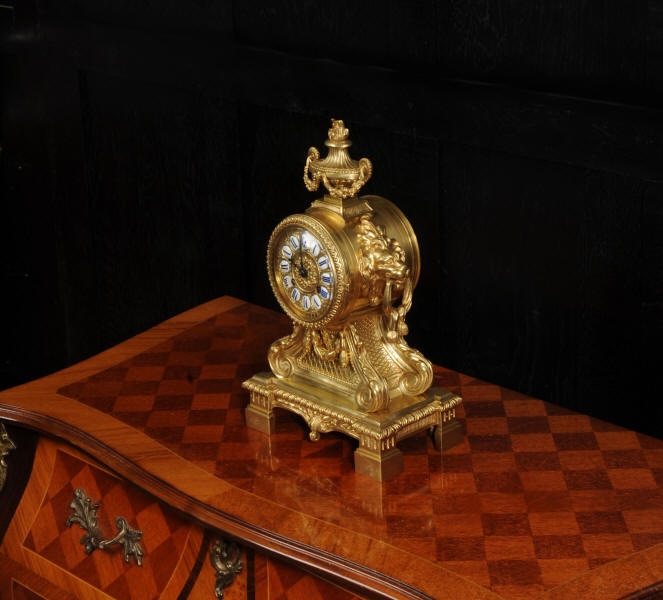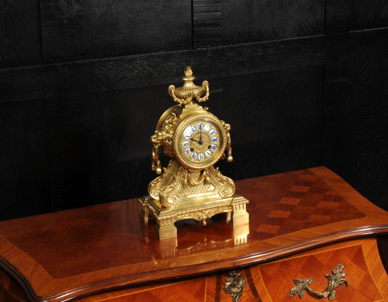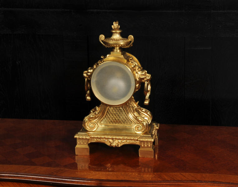 To the top is an elegant flaming urn with pieced handles with a laurel swag. The dial is heavy cast bronze with an engraved minute ring and mounted with porcelain enamel cartouche hours and is complete with original finely cut blued steel hands. The rear door is glazed with frosted glass. The clock is modelled in the round so will display beautifully in the centre of a room or in front of a mirror. The clock houses a fine French movement by Samuel Marti, renowned for precision and quality. It is presented in excellent, clean running order, having been fully overhauled and tested by our clockmaker. The original pendulum accompanies the movement. It runs for eight days and strikes the hours and half-hours on a bell with a clear, pleasing tone. Please click the video below to hear the strike and see the clock in operation. The design of this clock is based on the 18th century by the well known case maker Antoine Foullet (1710-1775). He was a cabinet maker who specialised in clockcases. He became master in 1749 and worked from his workshop on the rue du Faubourg-Saint-Antoine, Paris. Following his death in 1775, an inventory drawn up lists twenty clocks cases, some made entirely of bronze. Foullet's work is represented in the finest collections including The J Paul Getty Museum. A design drawing of a similar clock can be seen on page 192 of Vergoldete Bronzen by Hans Ottomeyer and Peter Proschel. A clock of similar design can be seen on page 239 of Les Plus Belles Pendules Francaises by Giacomo and Aurelie Wannenes 2013. The case is in excellent condition, clean and bright showing hardly any wear or discolouration. The dial is also in very good order overall; there is a chip to the cartouche adjacent to the left-hand winding hole.