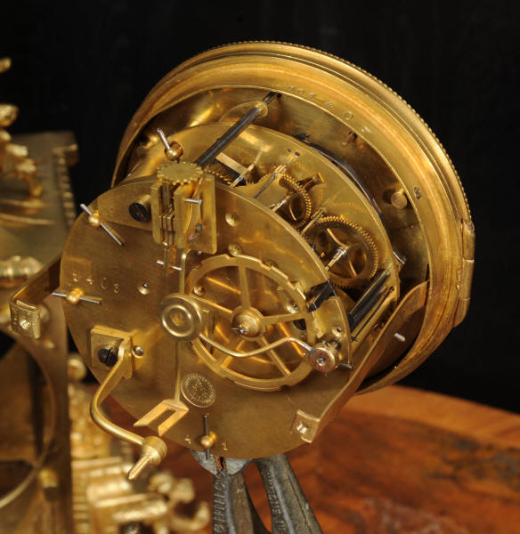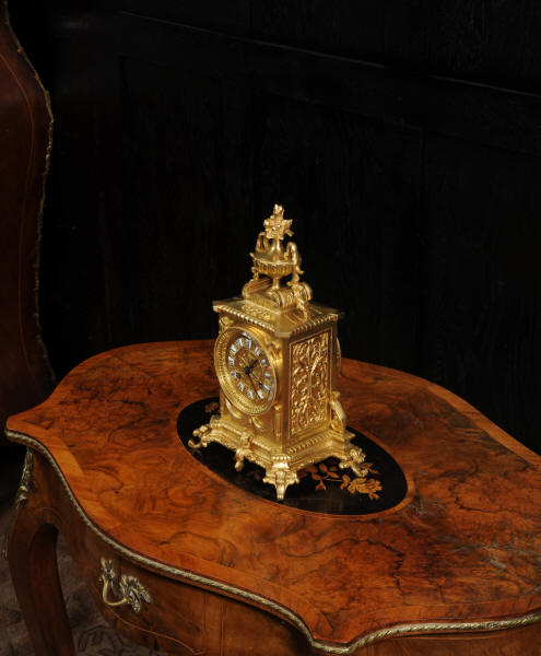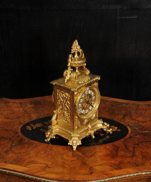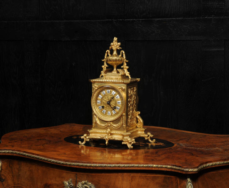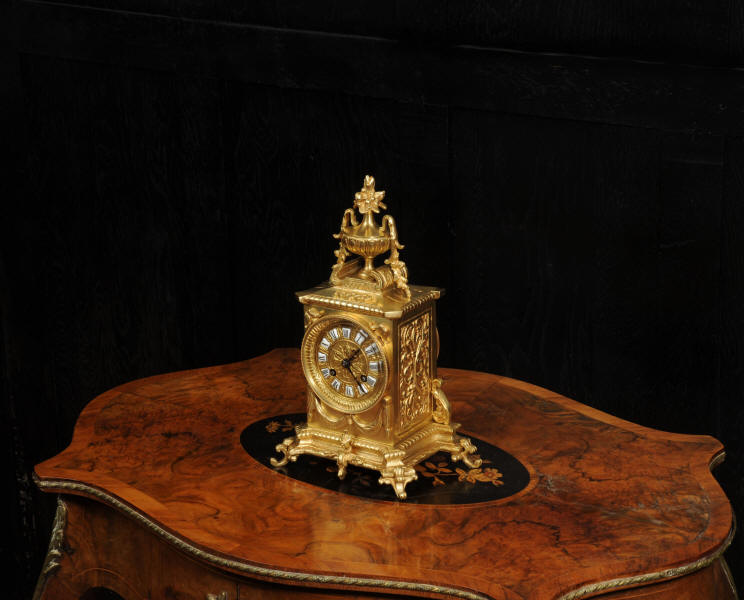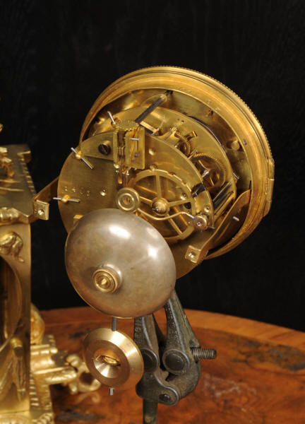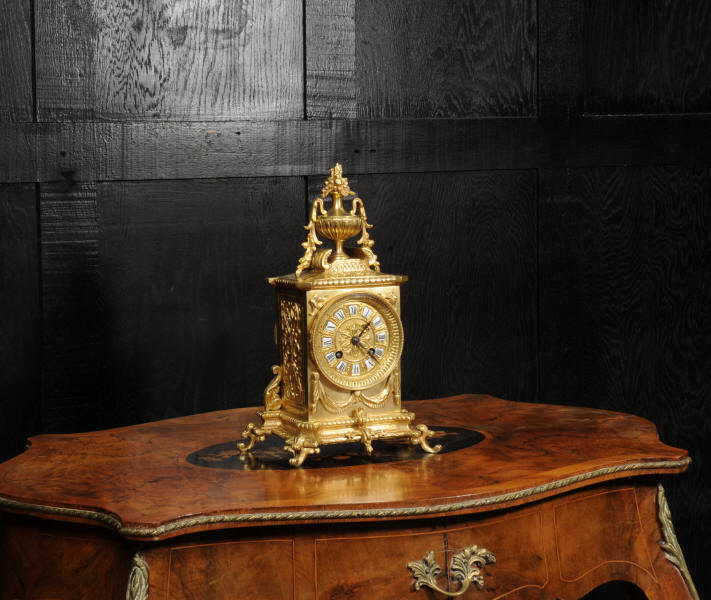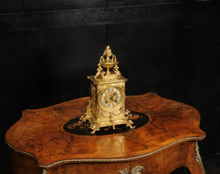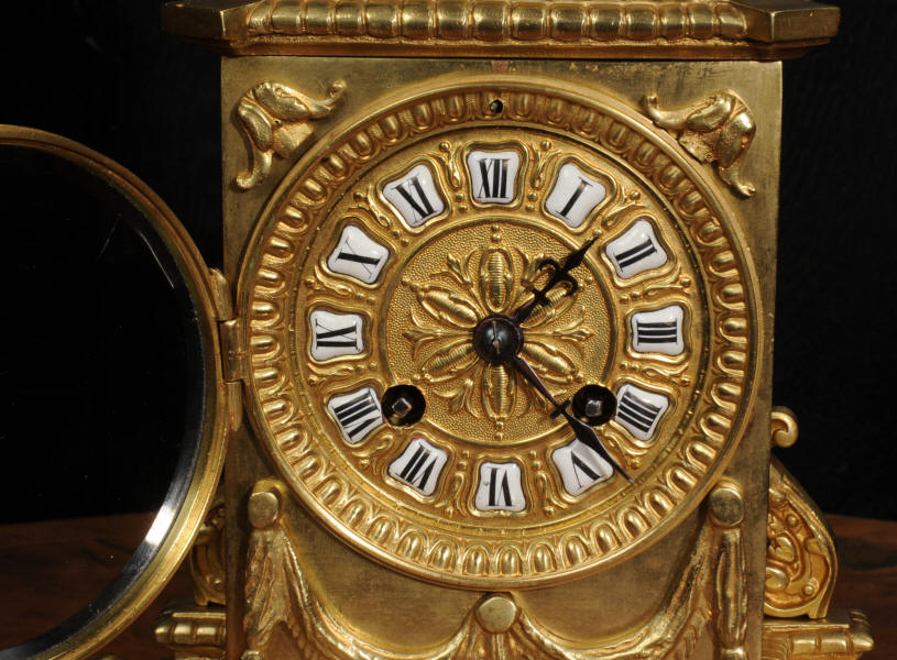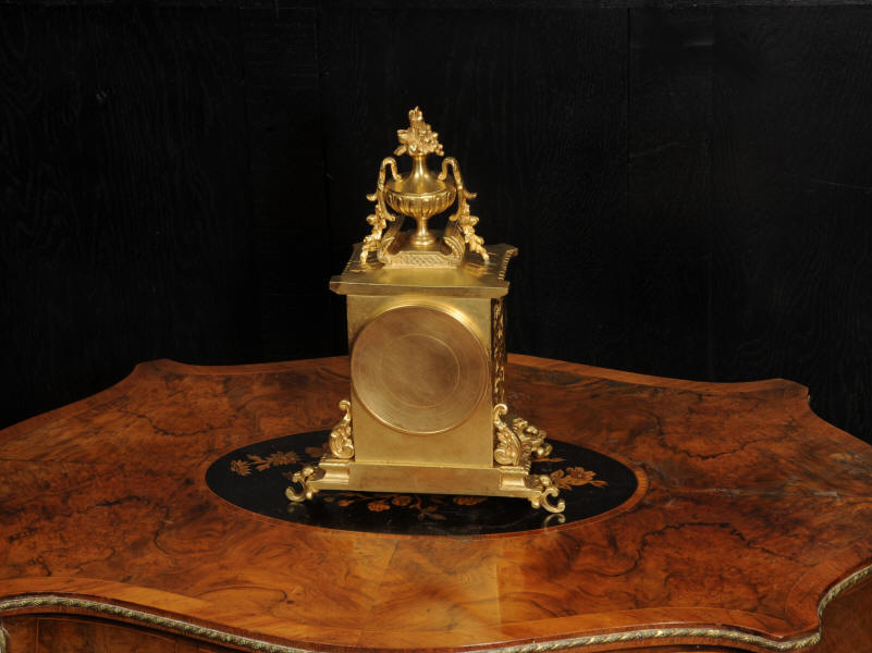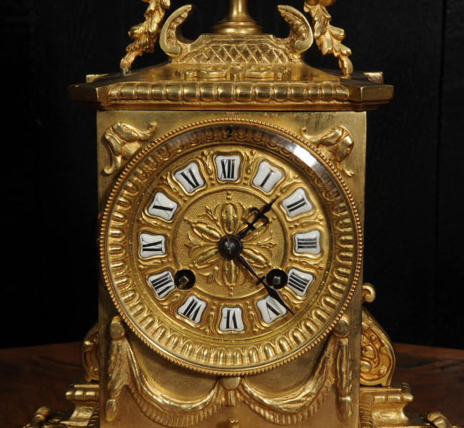 The dial is also gilt bronze with 12 individual enamel cartouches and blued steel hands. Beneath the dial is a draped swag. The French movement is by Japy Frères and is of the company's usual high quality. It is in excellent clean and running condition having been fully overhauled and tested by our clockmaker. Pendulum is a replacement. It runs for 8 days and strikes the hours and halves on a bell. Click the video to hear the bell and watch the clock running. Condition of the case is excellent, the original gilding is beautifully clean and bright with some slight wear and discolouration. Dial is also excellent with just some slight nibbles to the winding holes and an occasional mark. The rear door is very slight distorted.