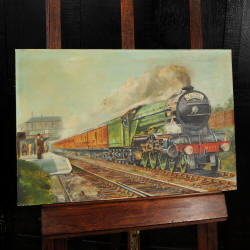 The artist has rendered the locomotive with vivid attention to detail — from the gleaming green livery and distinctive driving wheels, to the unmistakable “Flying Scotsman” headboard. The warm tones of the wooden coaches, dynamic sky, and sense of motion make this a visually compelling tribute to the golden age of rail travel.