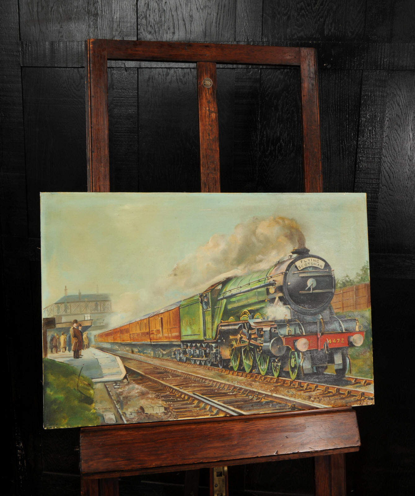 A striking original oil painting by Ken Allsebrook, capturing one of Britain’s most iconic locomotives — LNER Class A3 Pacific No. 4472 Flying Scotsman — in full steam, hauling a rake of teak passenger coaches through a classic station scene. The composition is filled with nostalgic charm: passengers on the platform pause to admire the powerful green engine as it passes beneath a traditional signal box, leaving trails of steam in its wake.