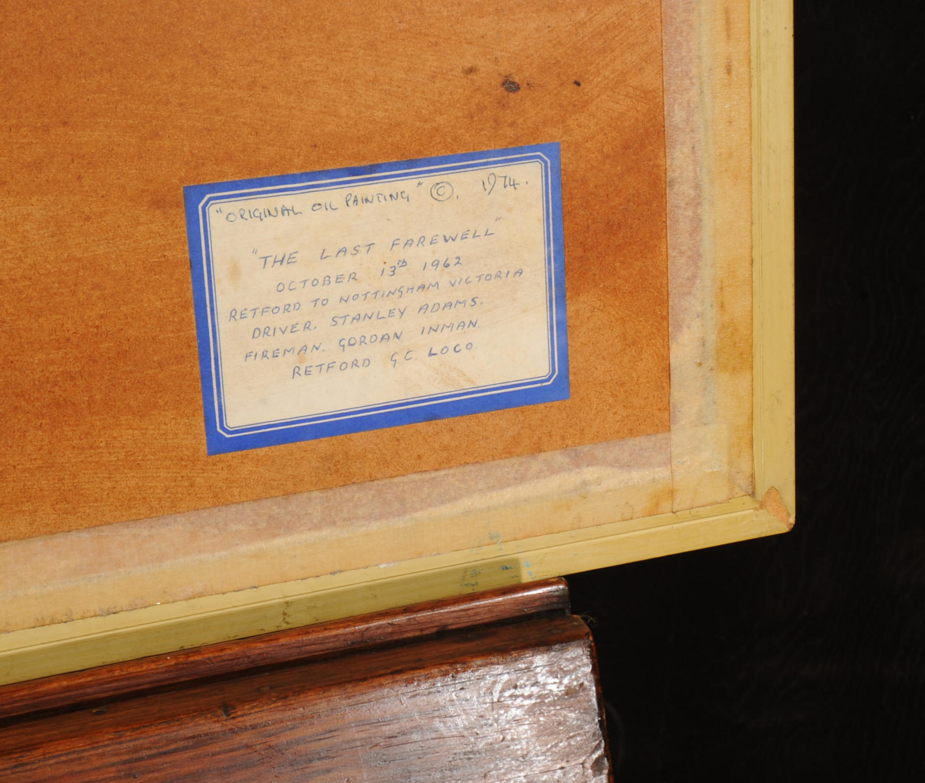 A poignant tribute to the twilight of British steam, this original 1974 oil painting captures the historic final journey of Class GCR 64354 on October 13th, 1962. Titled "The Last Farewell", the artwork depicts the locomotive departing Retford for Nottingham Victoria, hauling the last steam-hauled passenger service on that route.