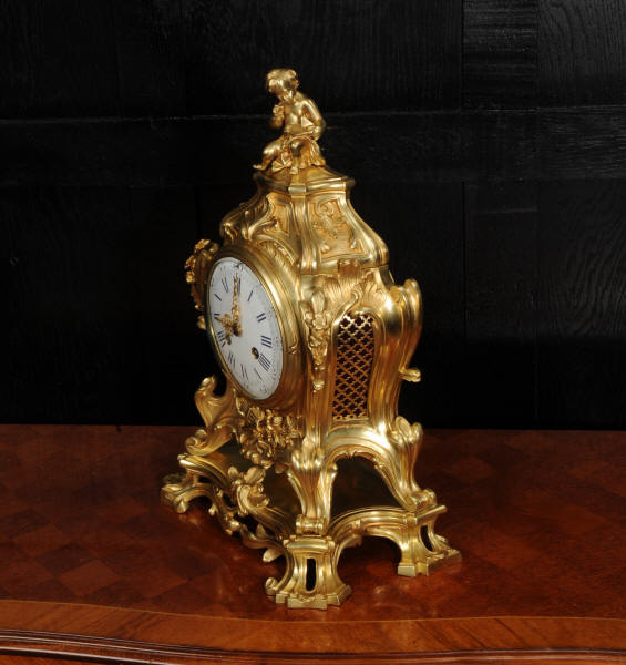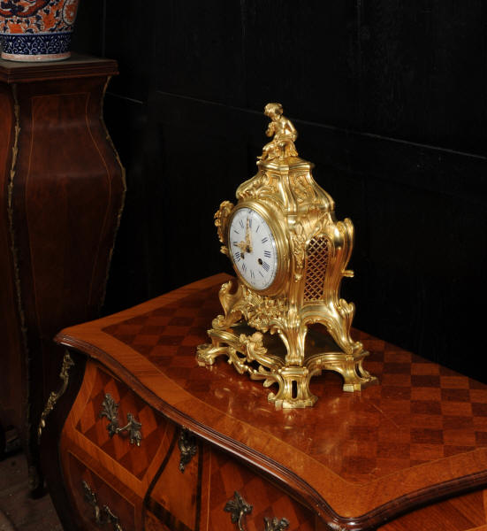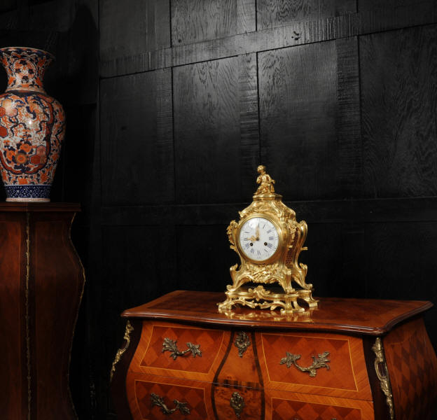 The dial is of porcelain enamel on copper, retaining its original finely pierced gilt-bronze hands and set beneath a convex glass bezel. Beneath the dial, the allegorical symbolism continues with Amor’s quiver of arrows and flaming torch, emblematic of love and enlightenment, nestled among richly cast foliate scrolls and finely chased ornamentation. The sides are mounted with fabric-backed sound frets, lending visual lightness to the design. The polished base subtly reflects the movement of the pendulum, which may be seen gently swinging within the case. A glazed rear door reveals the beautifully finished movement. The case is modelled in the round, making this clock particularly well-suited for display in the centre of a room or on a table. The clock houses a high-quality French movement by Samuel Marti, and is of superb quality. The movement is presented in excellent condition, having been fully overhauled by our specialist clockmaker, and is in perfect working order. It features an eight-day duration, striking the hours and half-hours on a bell with a clear, resonant tone. The pendulum is a sympathetic replacement. Click the video clip to hear the bell and watch the clock running. Condition of the case is excellent, the original gilding is beautifully clean and bright with slight wear and discolouration. There are a couple of small casting faults, including one to the cherubs torso. The dial is also in excellent condition with damage. A comparable model is illustrated in Hans Ottomeyer and Peter Pröschel's, Vergoldete Bronzen: Die Bronzearbeiten des Spätbarock und Klassizismus, Munich, 1986 and also in Giacomo and Aurélie Wannenes', Les plus belles pendules françaises: De Louis XIV à l'Empire, Wannenes Art Publications. Robert Osmond - Bronzier (1711 - 1789). French bronzier Robert Osmond was born in Canisy, near Saint-Lô; he began his apprenticeship in the workshop of Louis Regnard, maître fondeur en terre et en sable, and became a master bronzier in Paris in 1746. He is recorded as working in the rue des Canettes in the St. Sulpice parish, moving to the rue de Mâcon in 1761. Robert Osmond became a juré, thus gaining a certain degree of protection of his creative rights. In 1753, he sent for his nephew in Normandy, and in 1761, the workshop, which by that time had grown considerably, moved to the rue de Macon. The nephew, Jean-Baptiste Osmond (1742-after 1790) became a master in 1764 and as of that date worked closely with his uncle, to such a degree that it is difficult to differentiate between the contributions of each. Robert appears to have retired around 1775. Jean-Baptiste, who remained in charge of the workshop after the retirement of his uncle, encountered difficulties and went bankrupt in 1784. Robert Osmond died in 1789. Prolific bronze casters and chasers, the Osmonds worked with equal success in both the Louis XV and the Neo-classical styles. Prized by connoisseurs of the period, their work was distributed by clockmakers and marchands-merciers. Specialising at first in the rocaille style, in the early 1760’s they turned to the new Neo-classical style and soon numbered among its greatest practitioners. They furnished cases to the best clockmakers of the period.