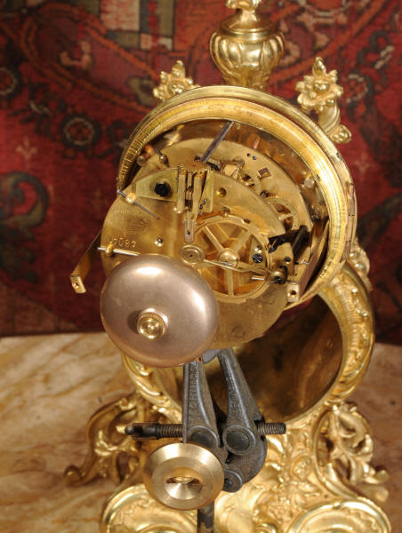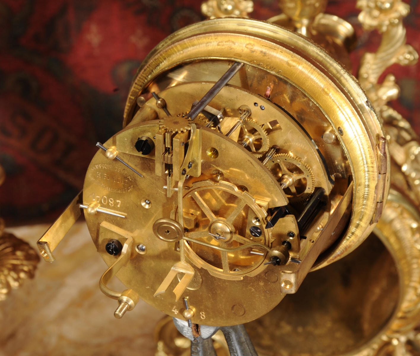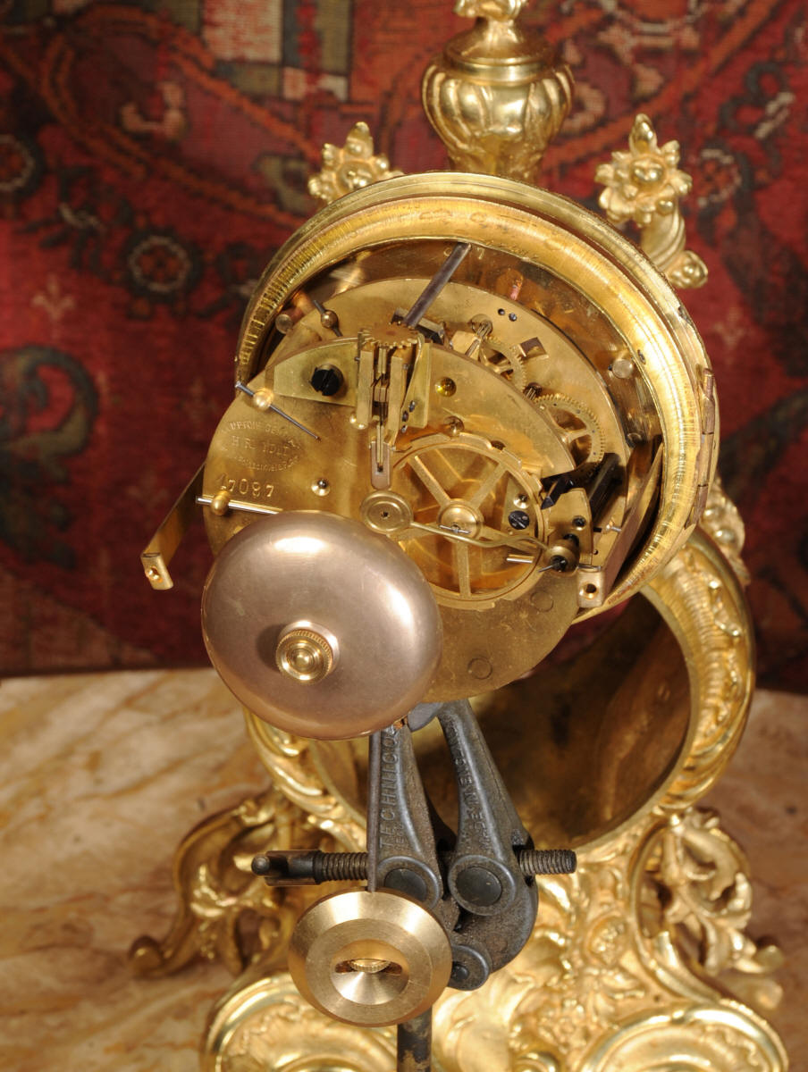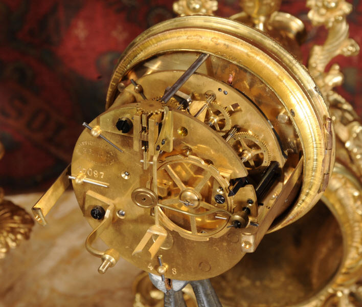 Louis Japy clockmaker's mark on the movement backplate along with the retailer's mark Maison Henri Riondet, Comptoir General, 9 Bd Poissonnière Paris.