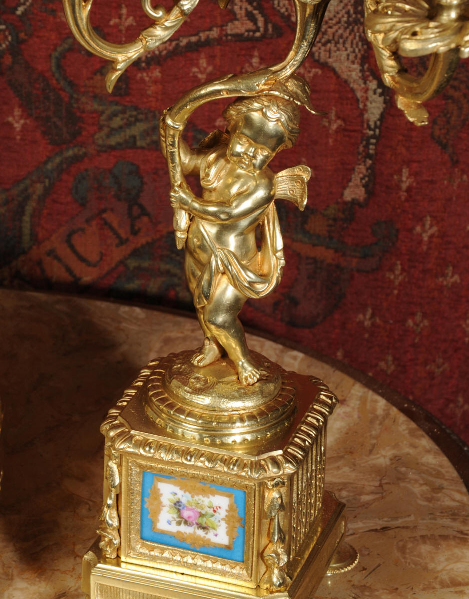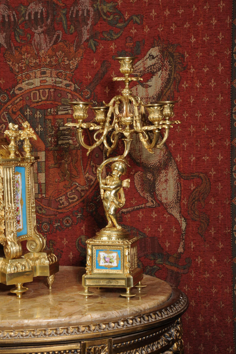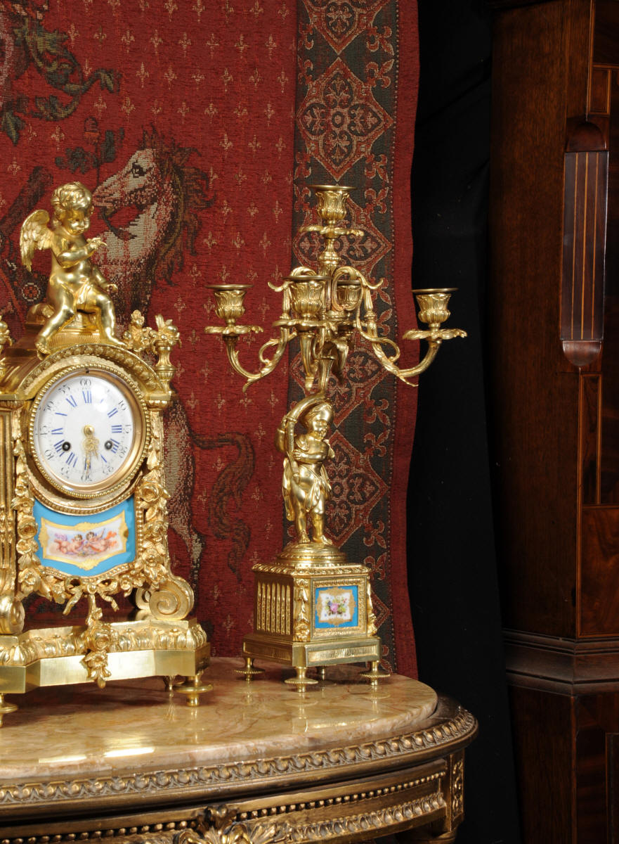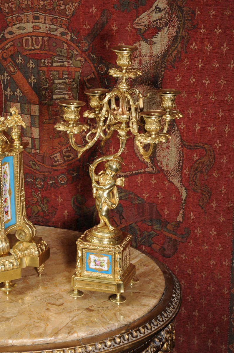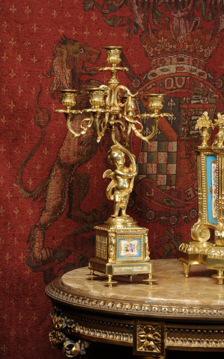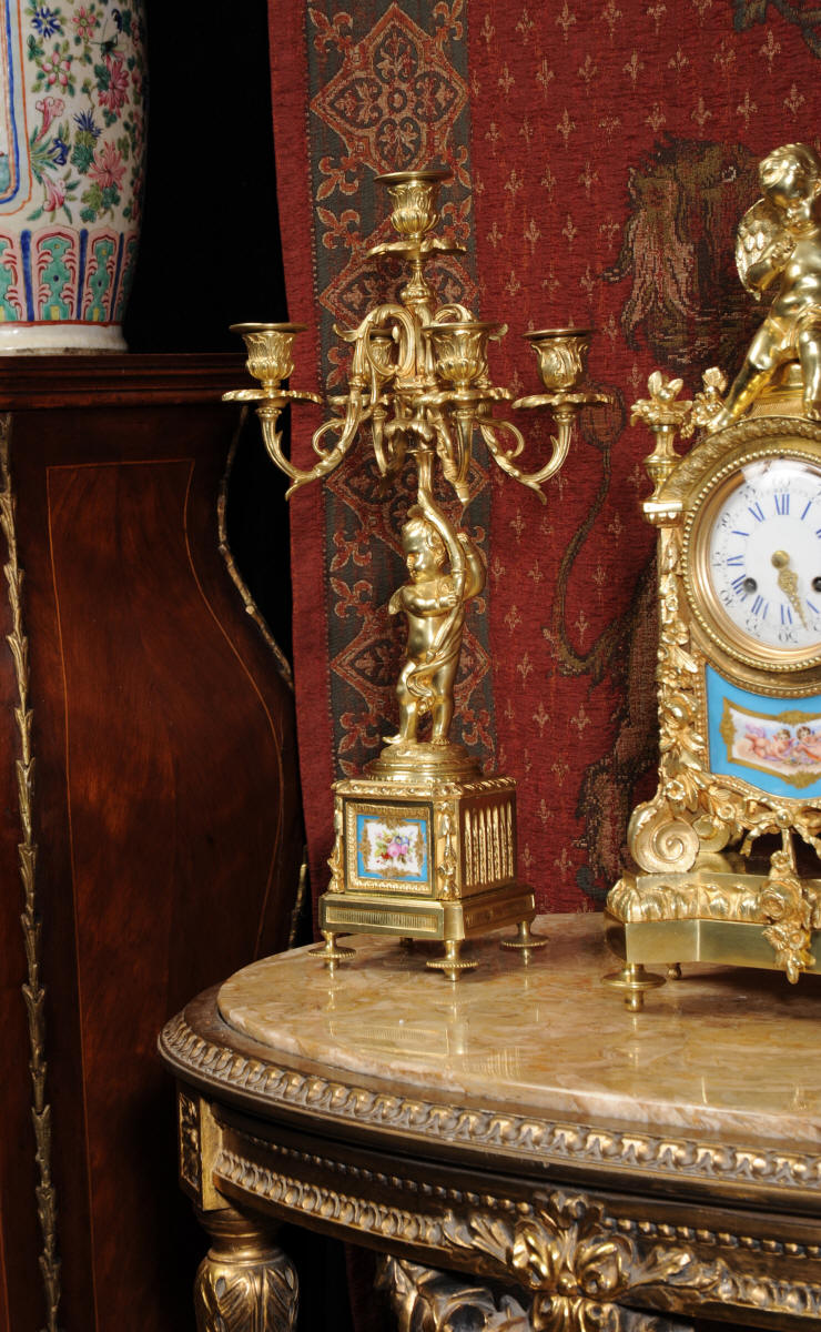 Condition of the case is excellent, the original gilding is beautifully clean and bright with hardly any wear or discolouration. One candelabra branch has a small piece of acanthus missing which does not detract. There are some stress cracks to some of the castings, particularly the candelabra arms and also some of the applied decoration to the clock but these are still strong and sound. The dial is also in excellent condition, there is some restoration, particularly to the bezel, it is the original bezel with matching serial number. Porcelain is also excellent with just some slight wear to the over glaze gilt decoration. A lovely early clock set to add to your collection.