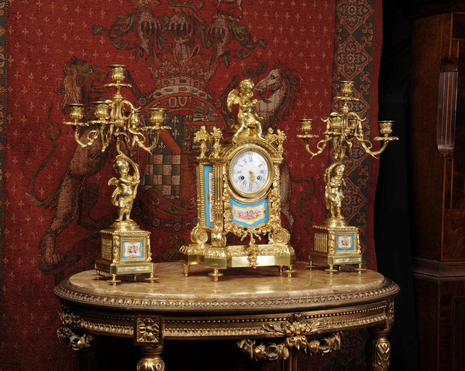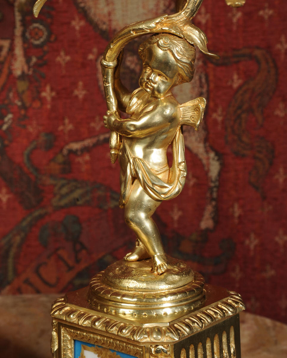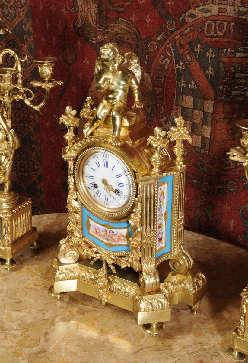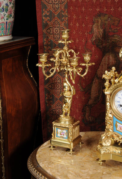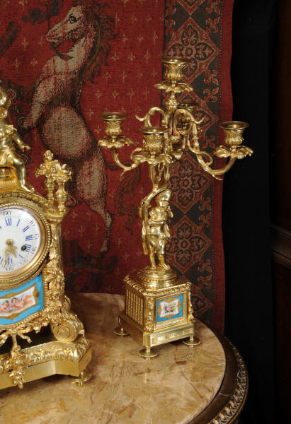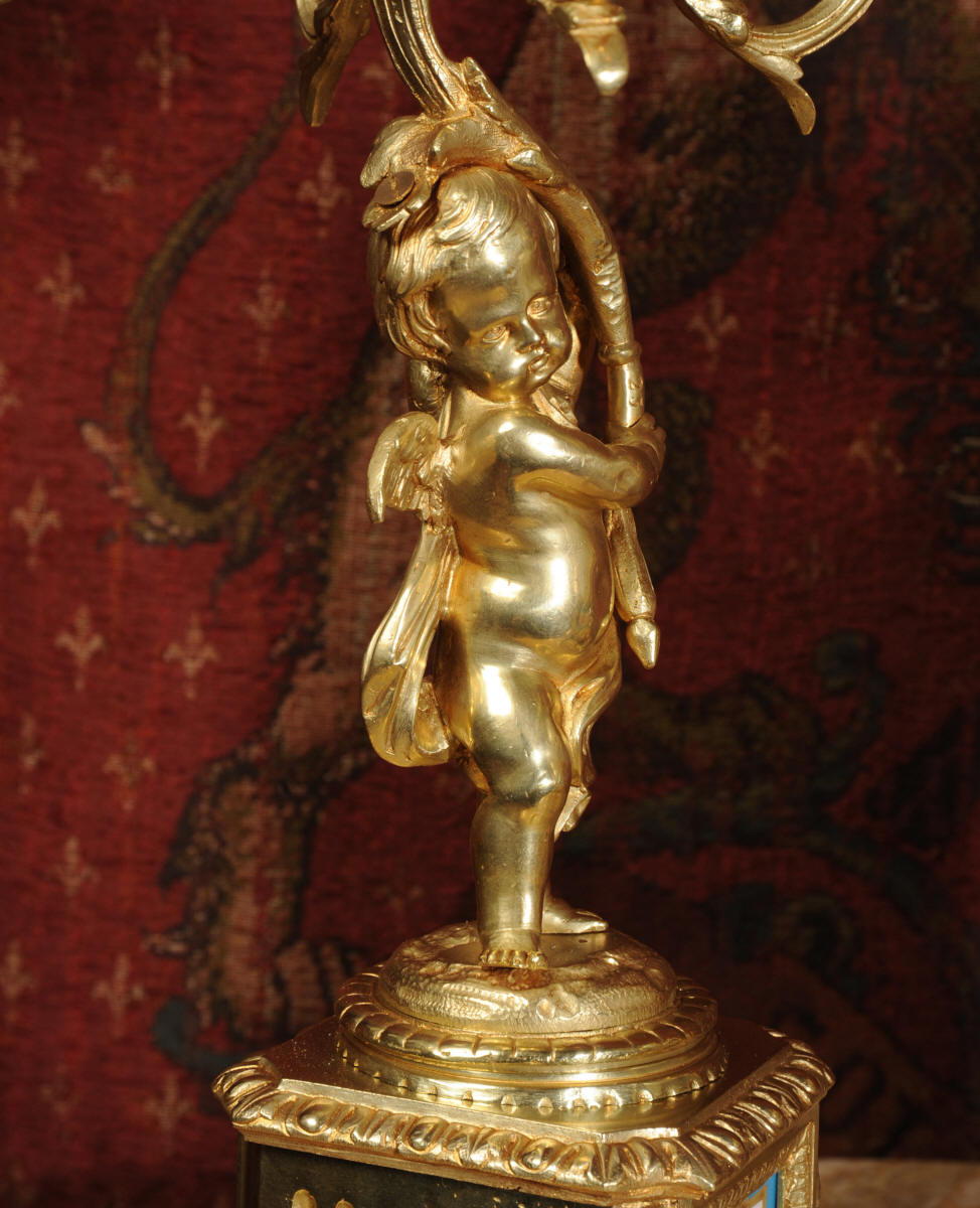 Condition of the case is excellent, the original gilding is beautifully clean and bright with hardly any wear or discolouration. One candelabra branch has a small piece of acanthus missing which does not detract. There are some stress cracks to some of the castings, particularly the candelabra arms and also some of the applied decoration to the clock but these are still strong and sound. The dial is also in excellent condition, there is some restoration, particularly to the bezel, it is the original bezel with matching serial number. Porcelain is also excellent with just some slight wear to the over glaze gilt decoration. A lovely early clock set to add to your collection.