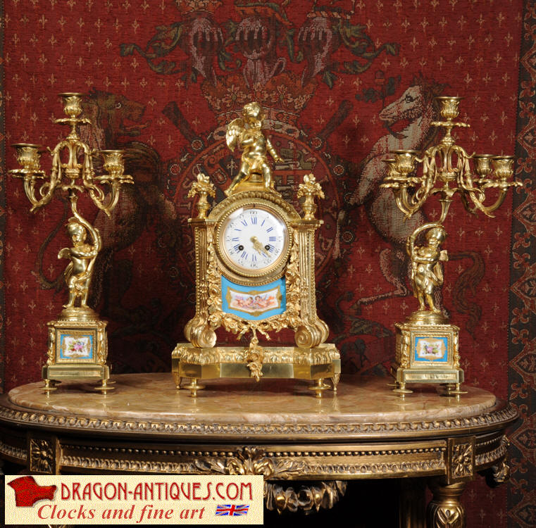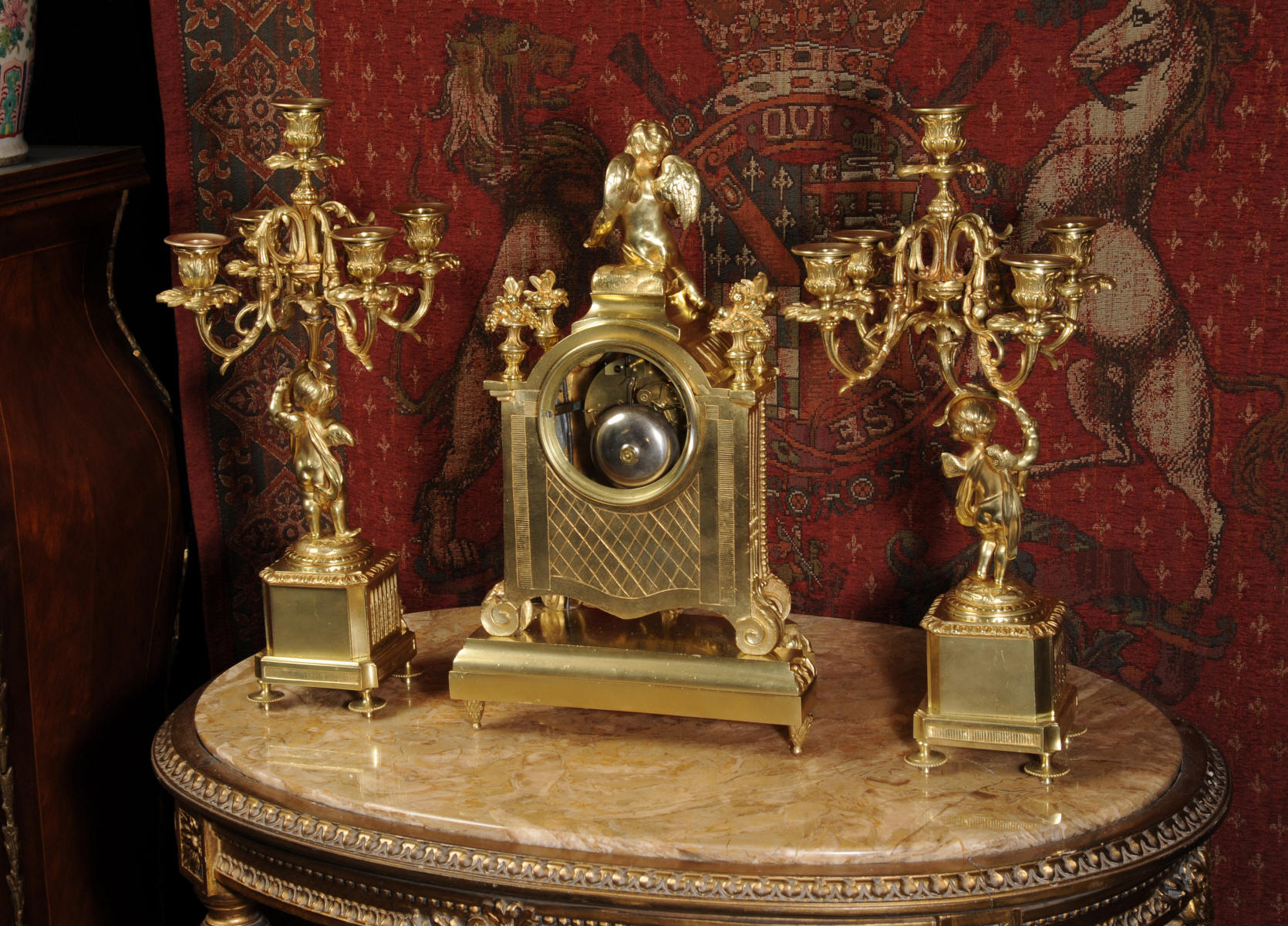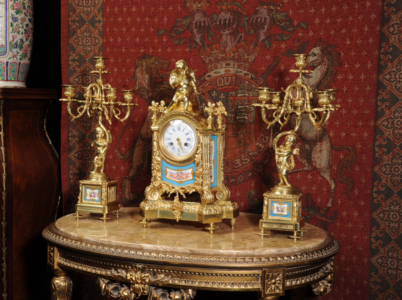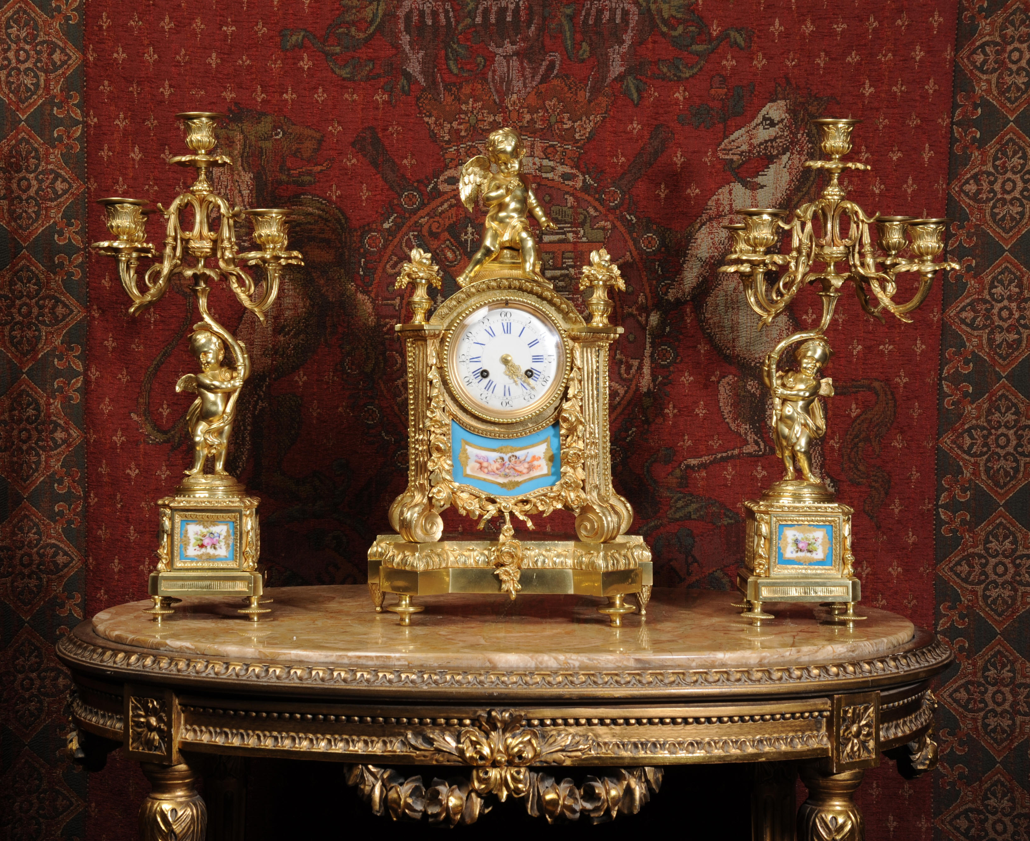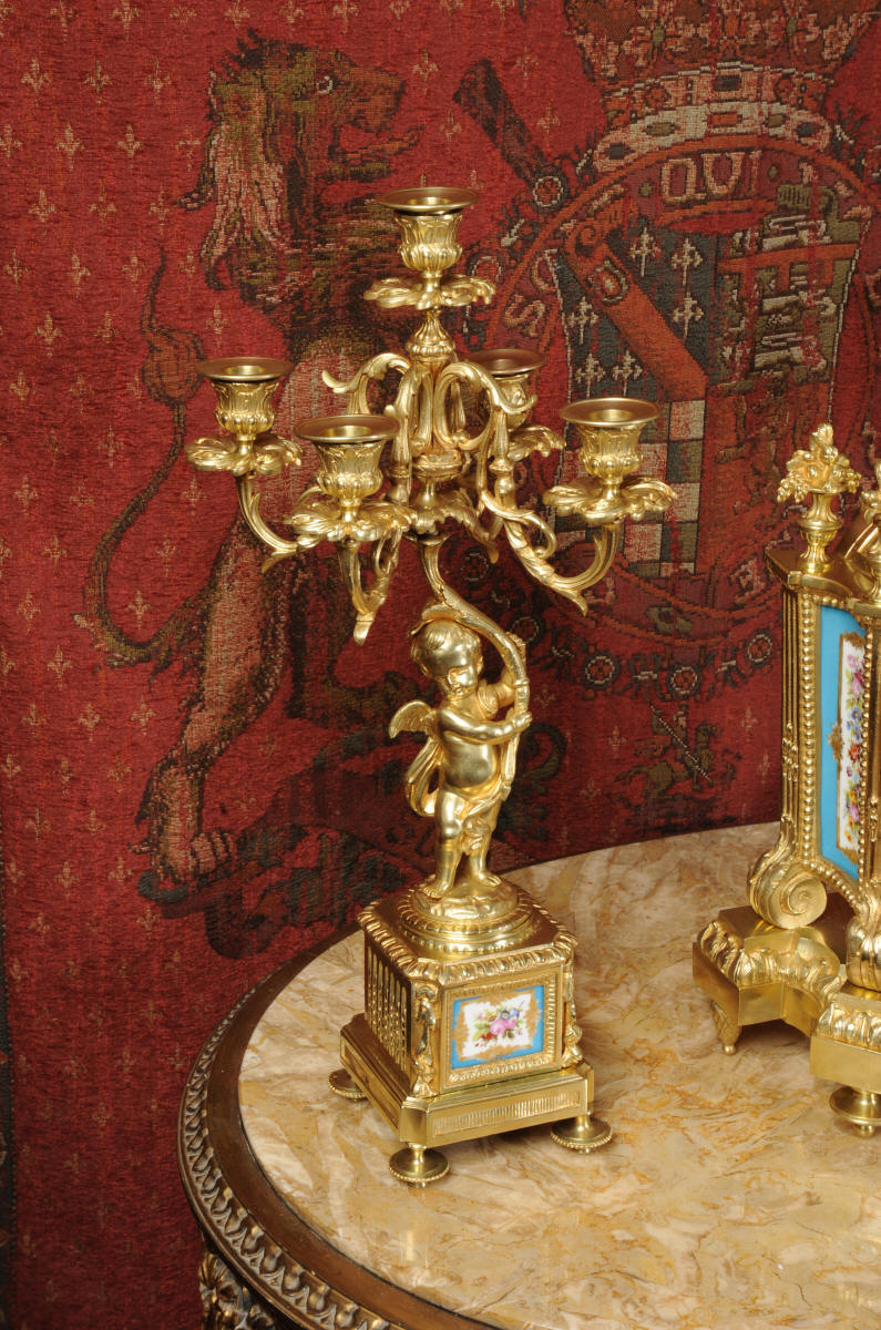 Condition of the case is excellent, the original gilding is beautifully clean and bright with hardly any wear or discolouration. One candelabra branch has a small piece of acanthus missing which does not detract. There are some stress cracks to some of the castings, particularly the candelabra arms and also some of the applied decoration to the clock but these are still strong and sound. The dial is also in excellent condition, there is some restoration, particularly to the bezel, it is the original bezel with matching serial number. Porcelain is also excellent with just some slight wear to the over glaze gilt decoration. A lovely early clock set to add to your collection.